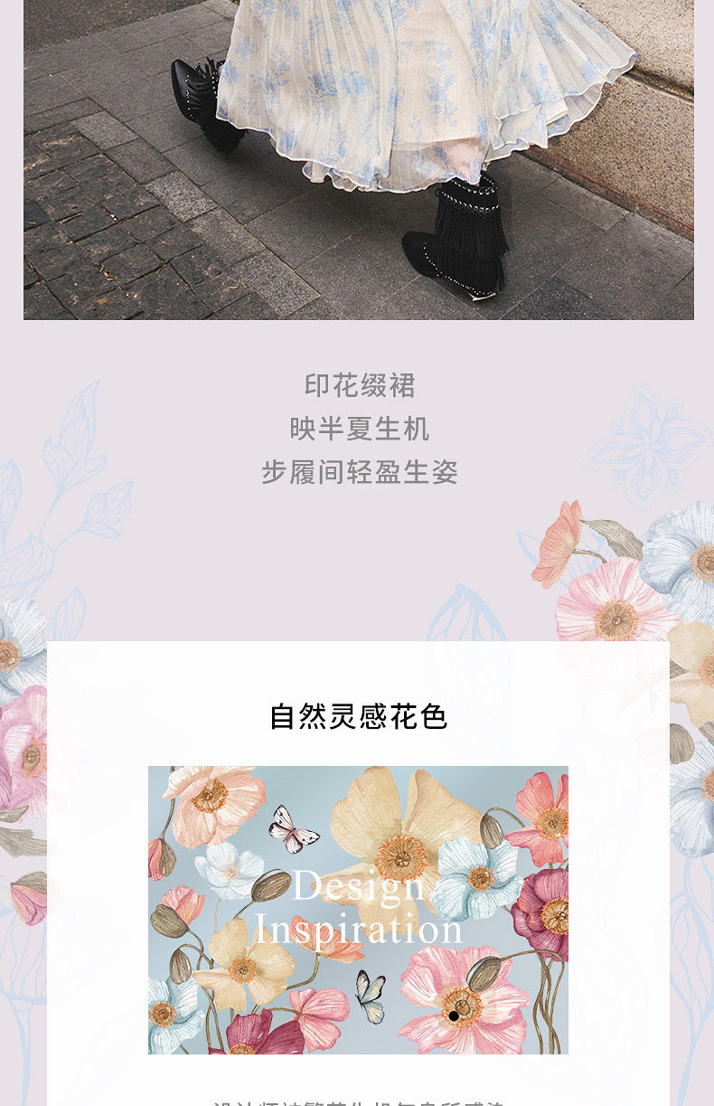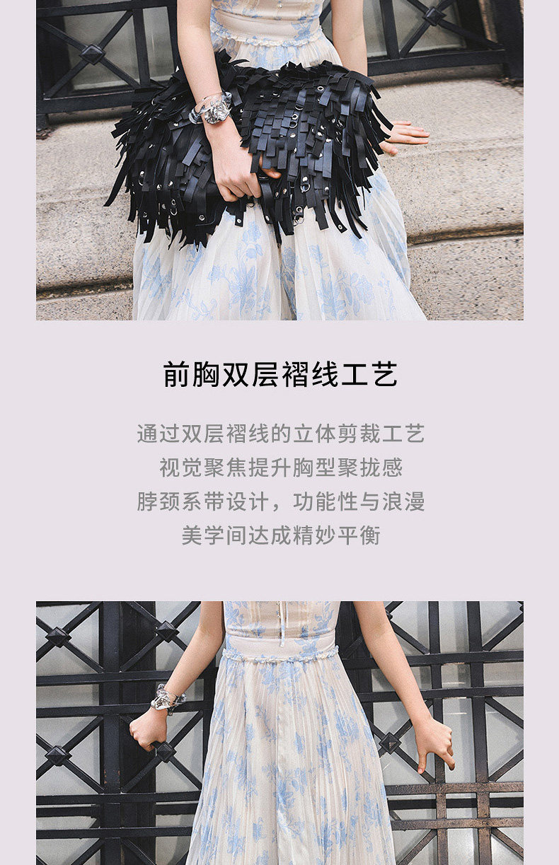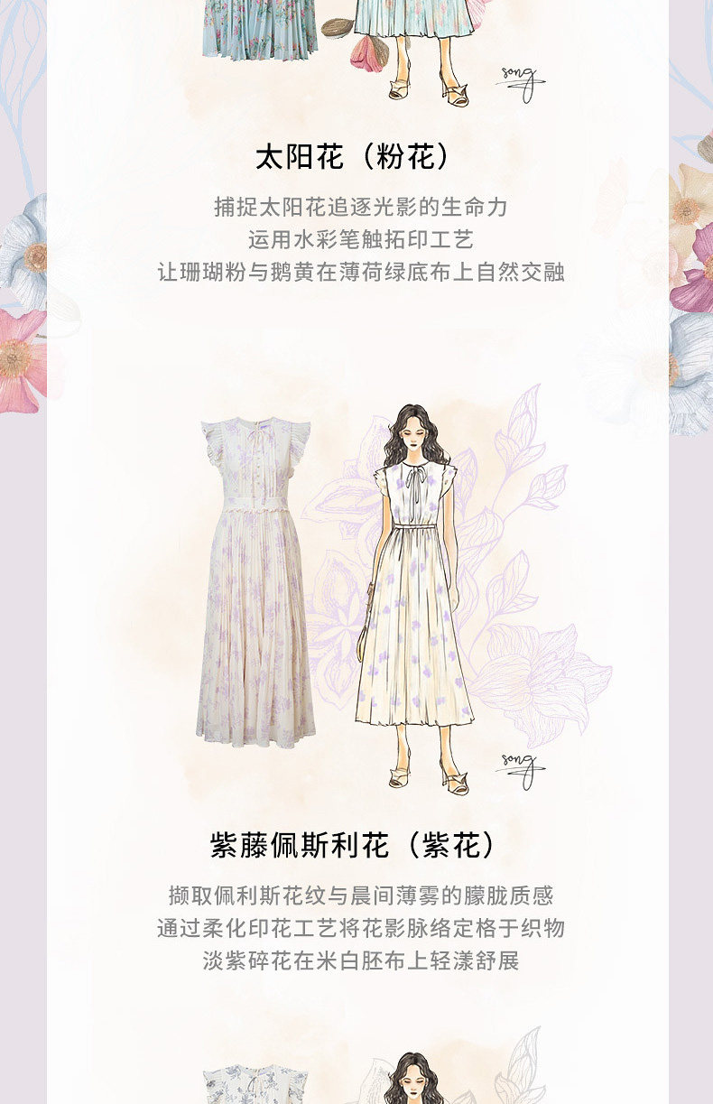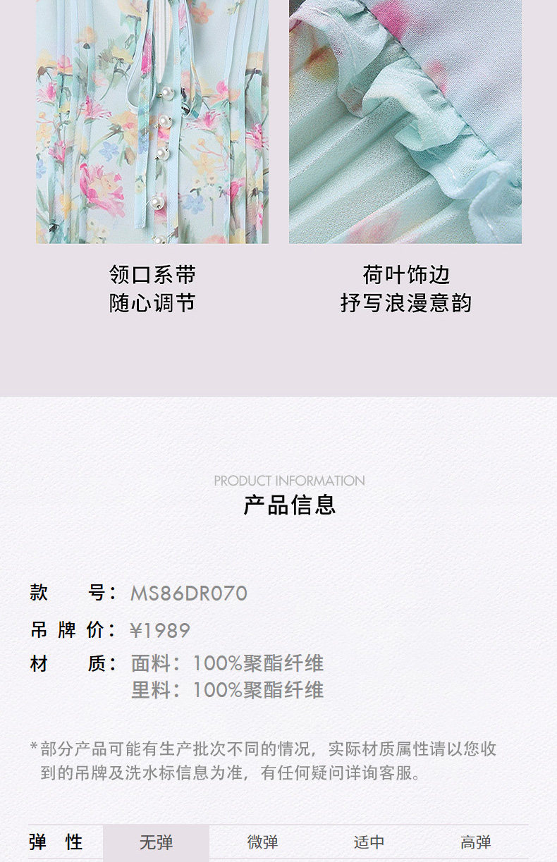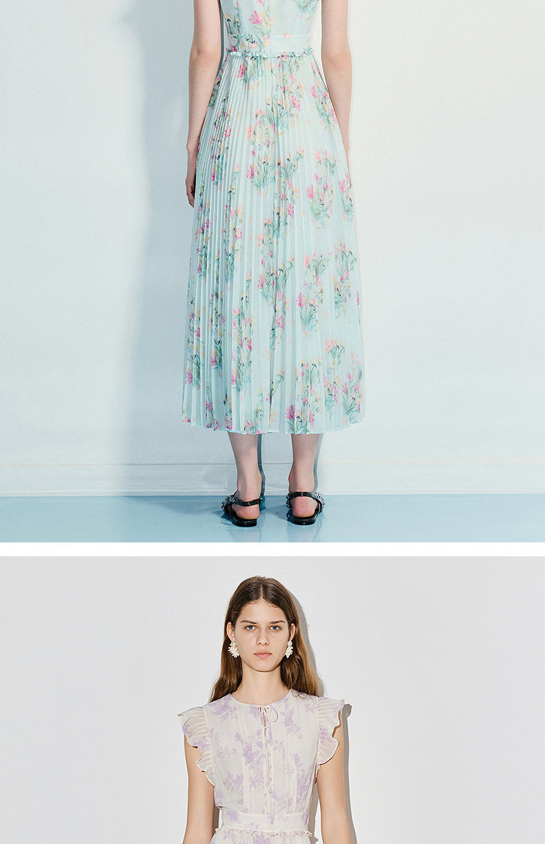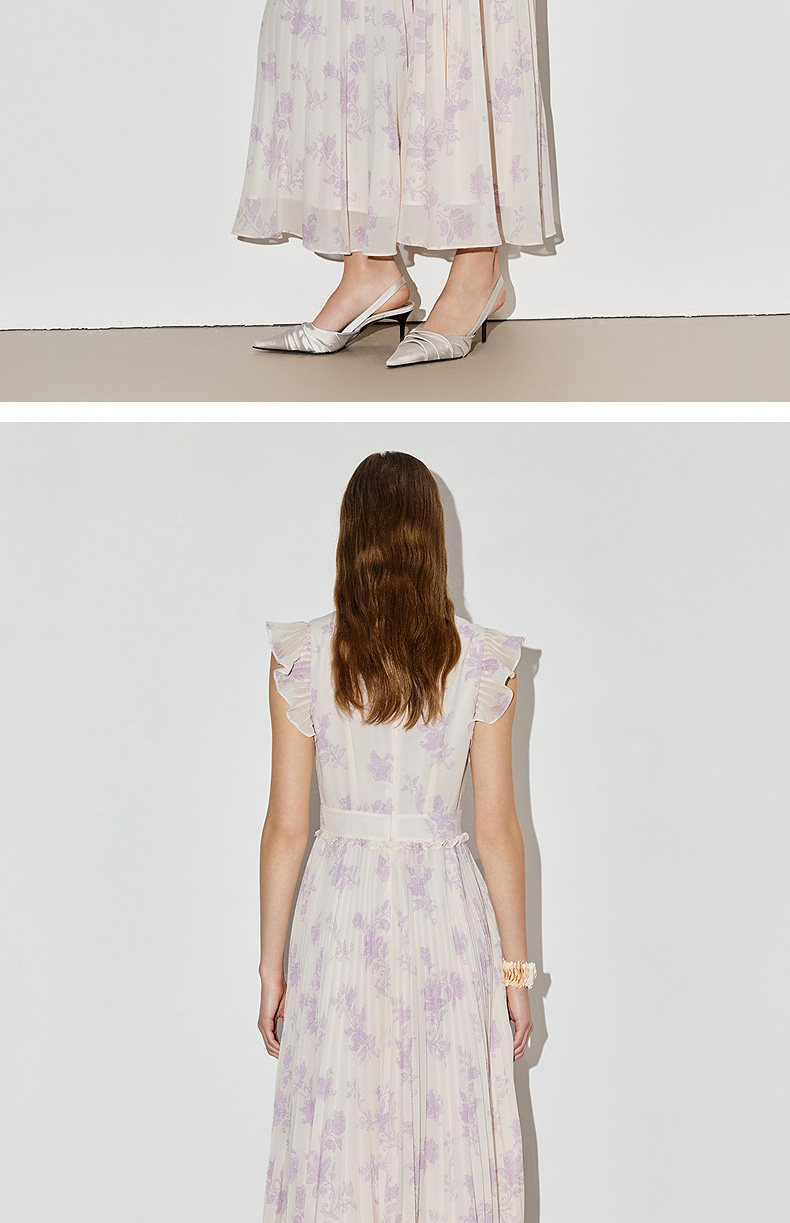 玛克门店发货:蓝星花连衣裙25夏款优雅百褶小飞袖裙子气质感收腰长裙(货号:MS86DR070)
