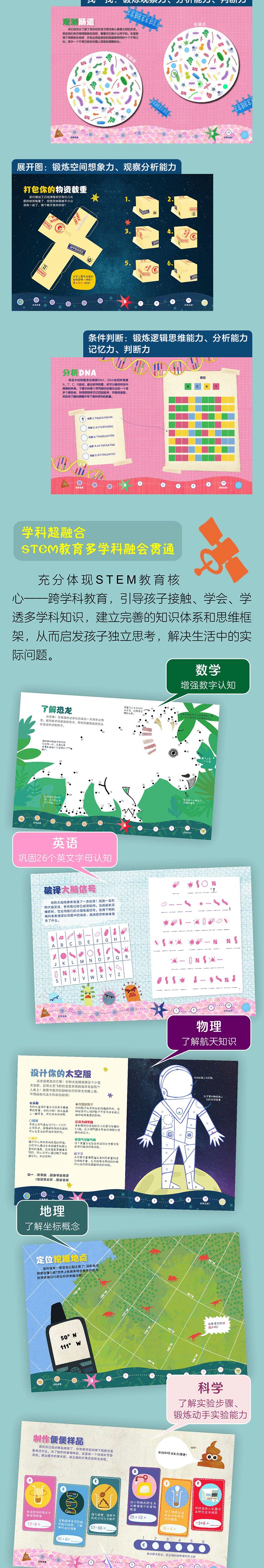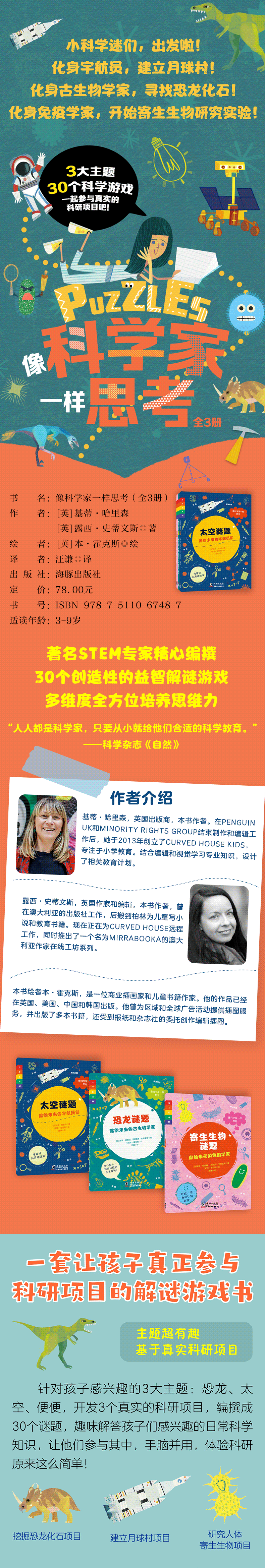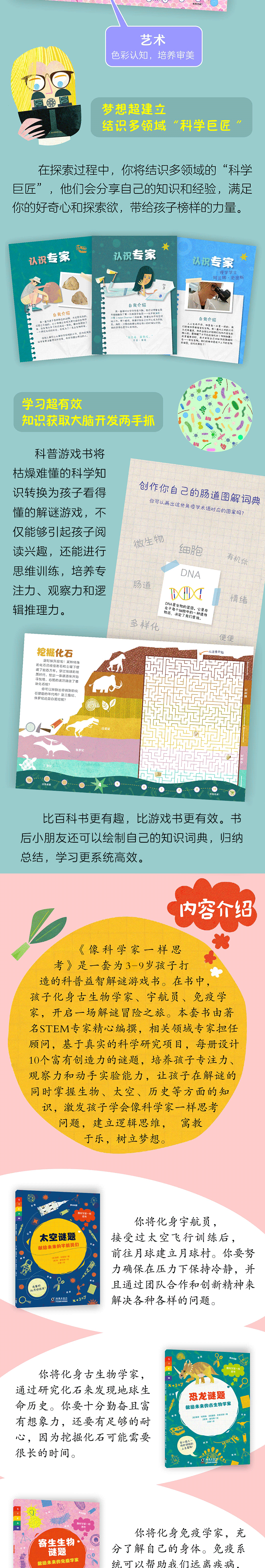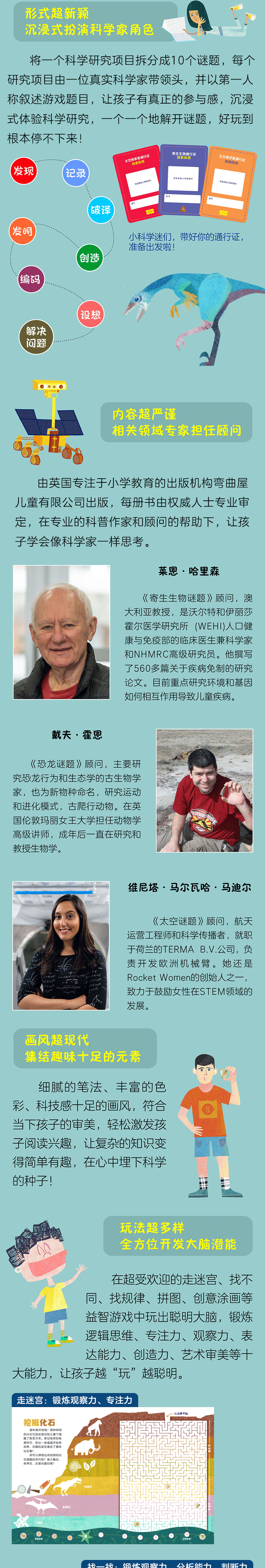 《像科学家一样思考》是一套为3-9岁孩子打造的科普益智解谜游戏书。在书中,孩子化身古生物学家、宇航员、免疫学家,开启一场解谜冒险。本套书由著名STEM专家精心编撰,相关领域专家担任顾问,基于真实的科学研究项目,每册设计10个富有创造力的谜题,培养孩子专注力、观察力和动手实验能力。让孩子在解谜的同时掌握生物、太空、历史等方面的知识,激发孩子学会像科学家一样思考问题,建立逻辑思维, 寓教于乐,树立梦想。