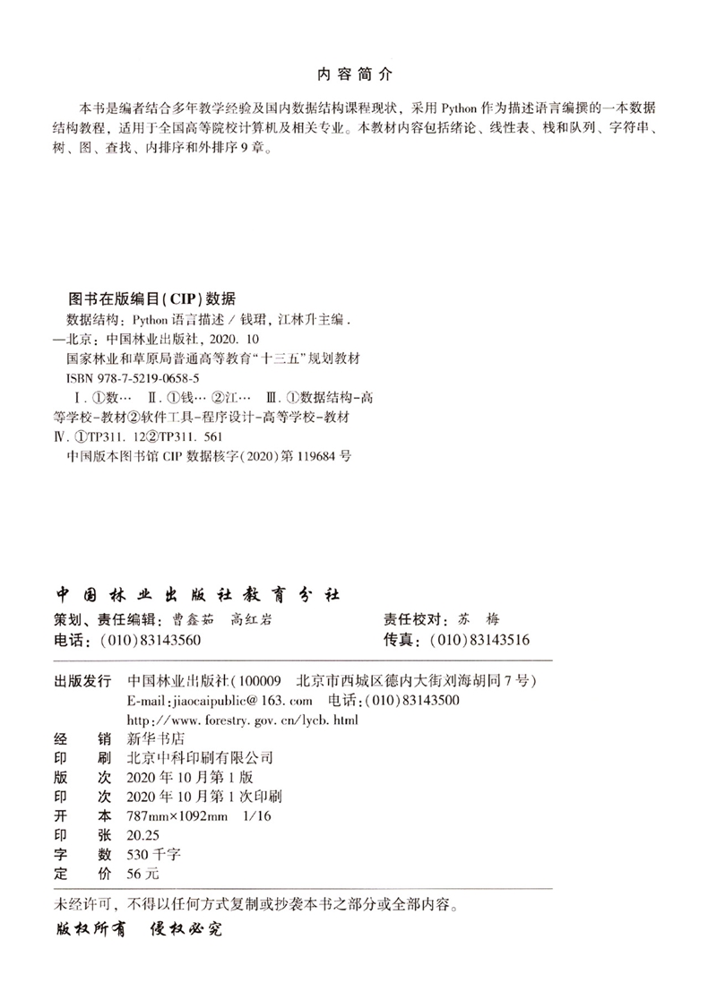 数据结构--Python语言描述 钱珺 江林升 (国家林业和草原局普通高等教育十三五规划教材) 0658 中国林业出版社
