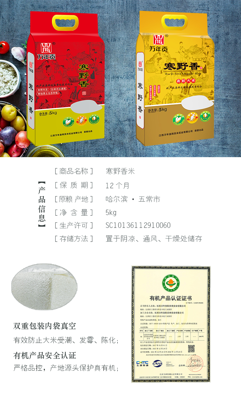 万年贡 东北大米5kg五常香米 稻花香米寒野香有机大米
