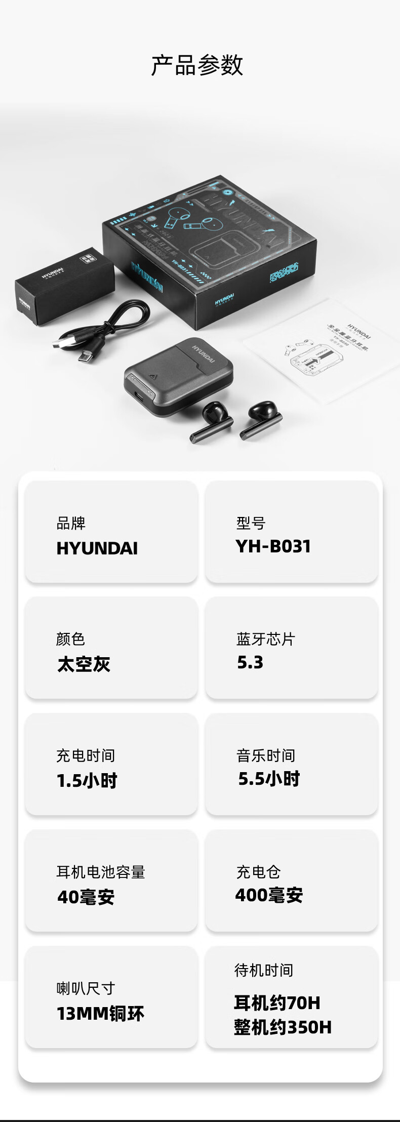现代HYUNDAI 滑盖式蓝牙耳机 YH-B031 灰色