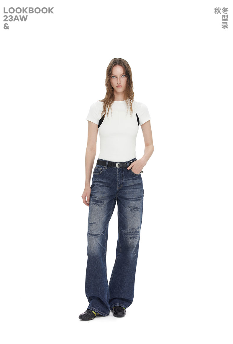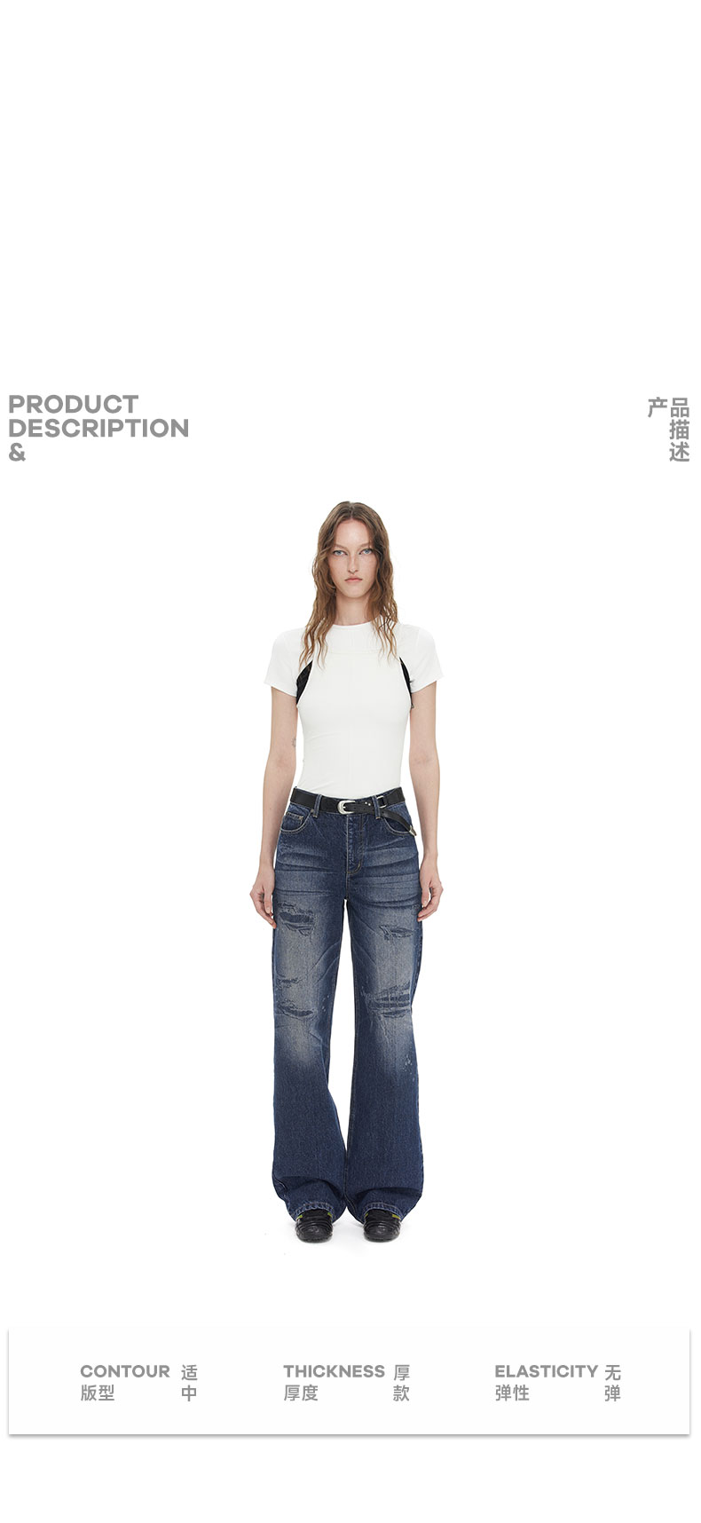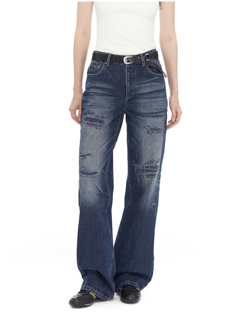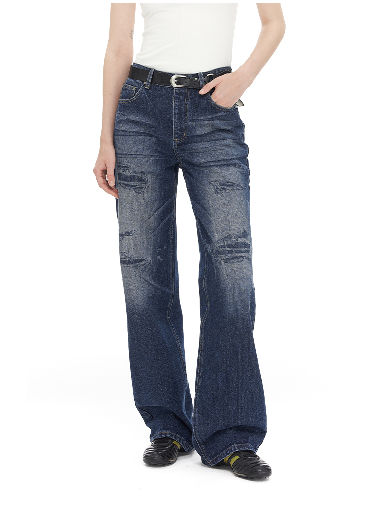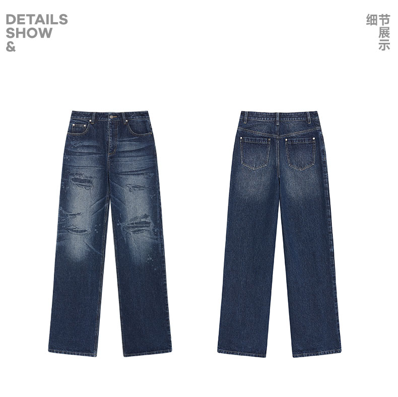NUTH “模拟破洞”|蓝色激光印花复古做旧直筒牛仔裤