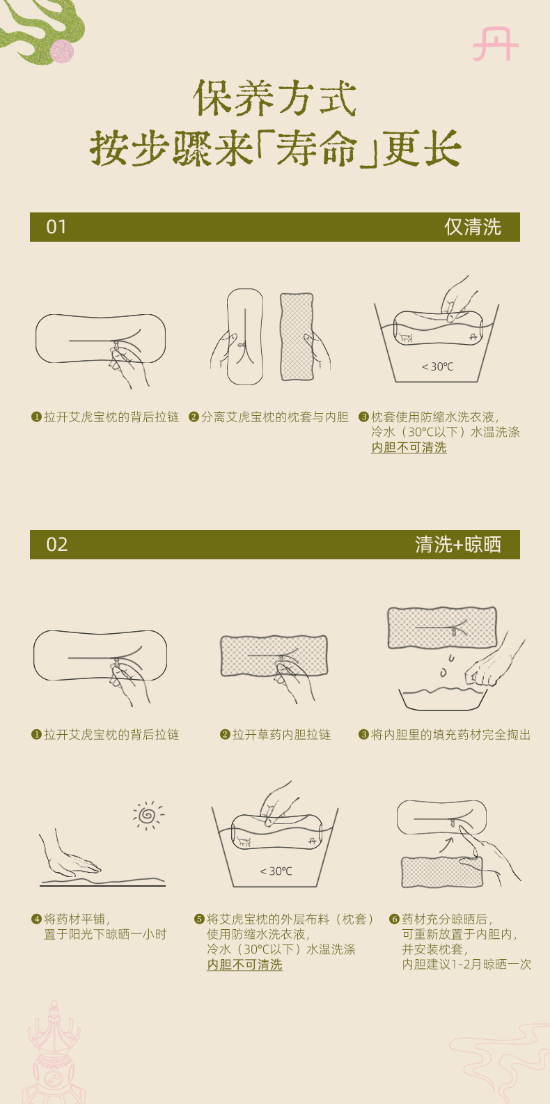 【保养方法】:一个月左右晾晒一次,易出汗人群可增加晾晒次数以保持枕芯干燥,延长使用寿命。