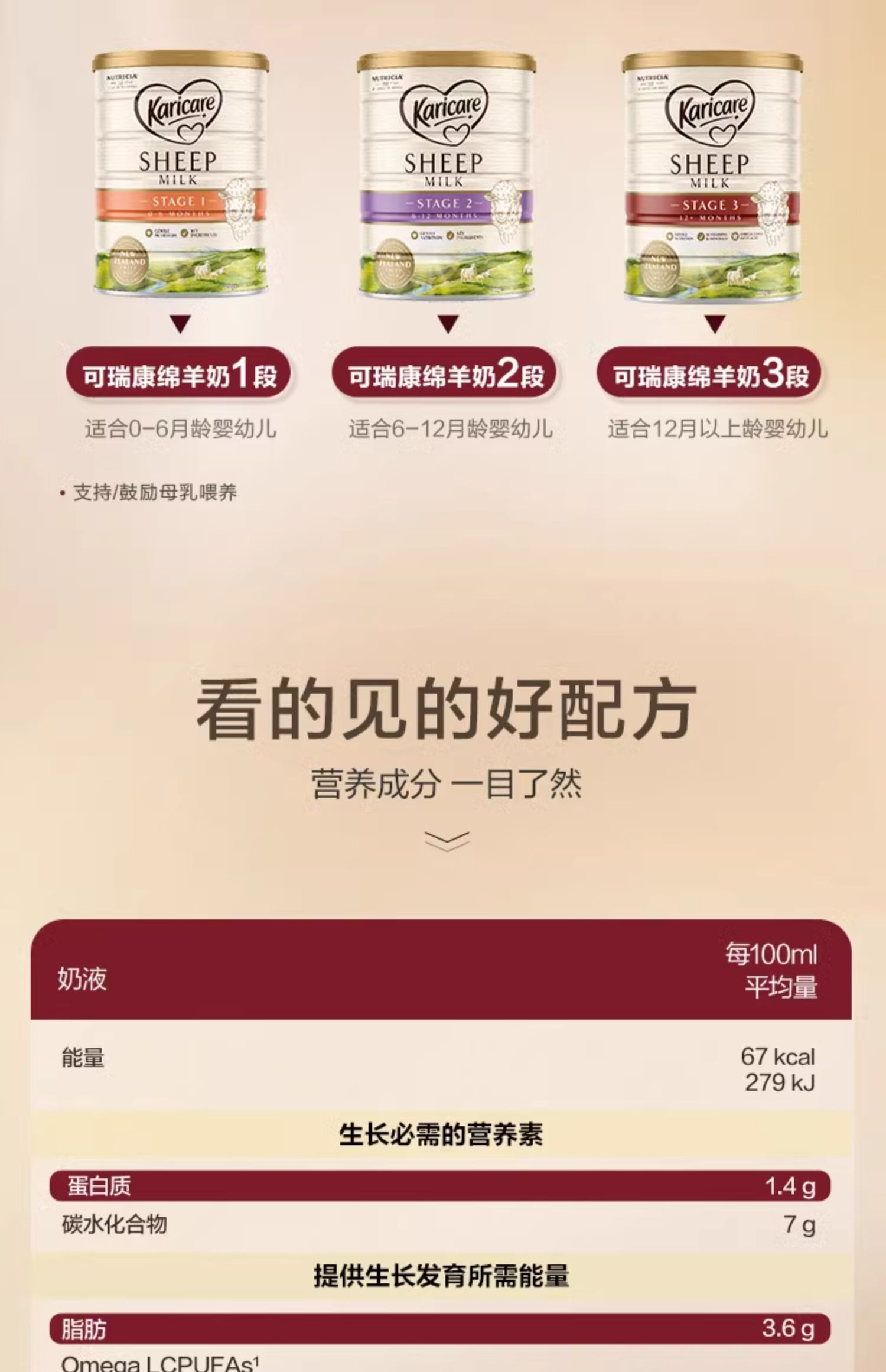 【跨境】karicare可瑞康新西兰进口幼儿配方绵羊奶粉2段6-12个月 900g