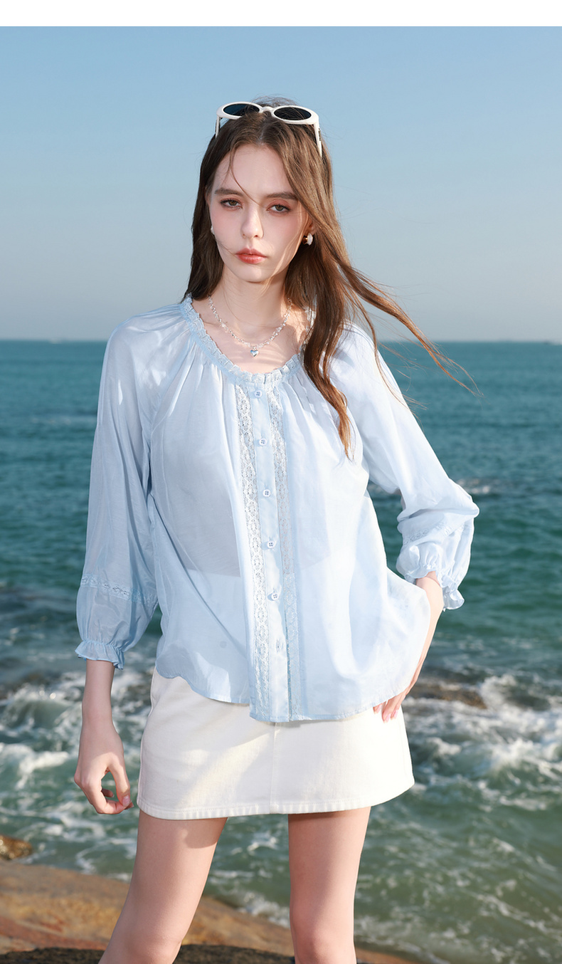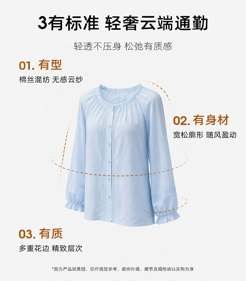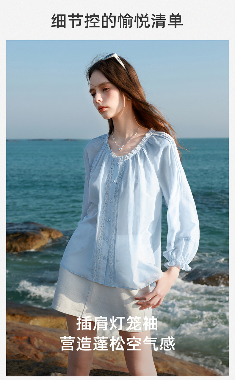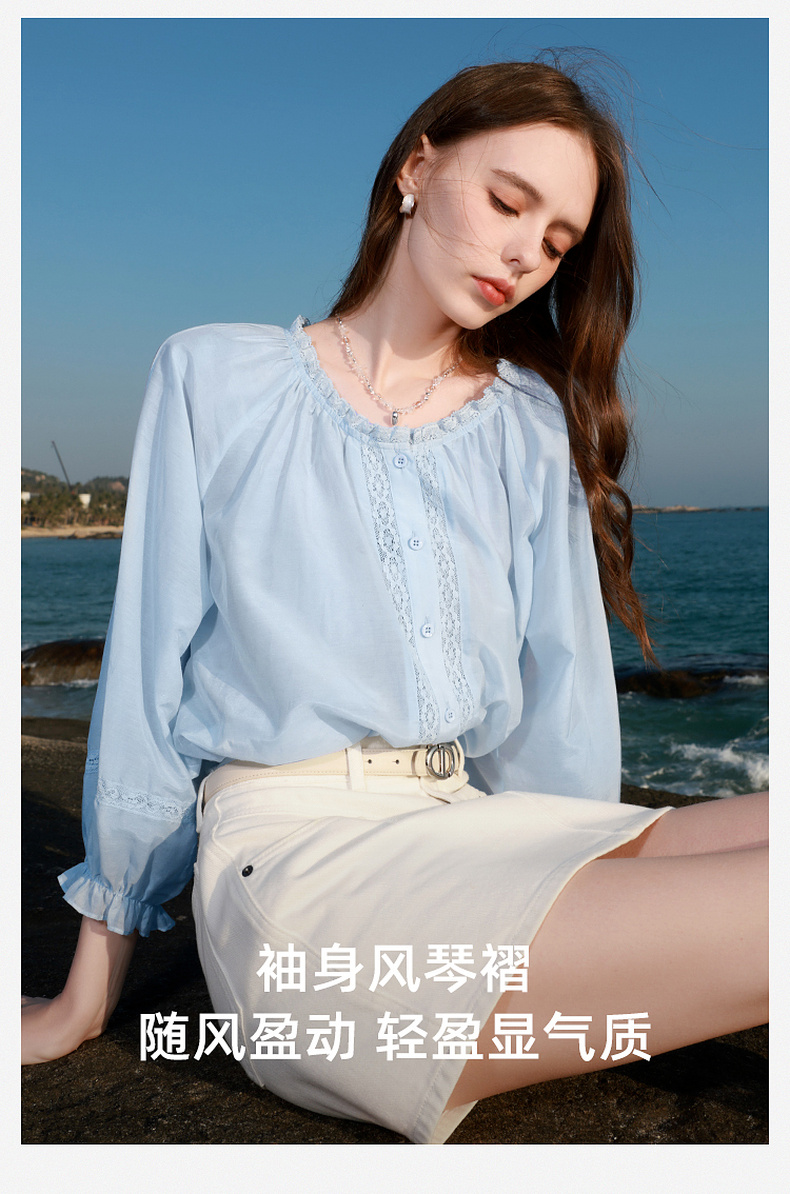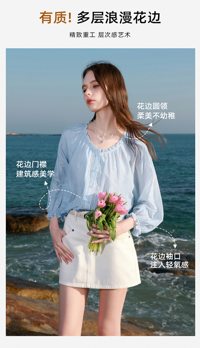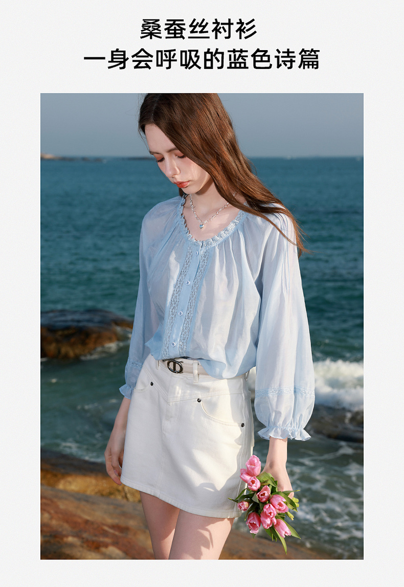【桑蚕丝】三彩2026春季新款圆领花边衬衫小衫复古衬衣宽松上衣M