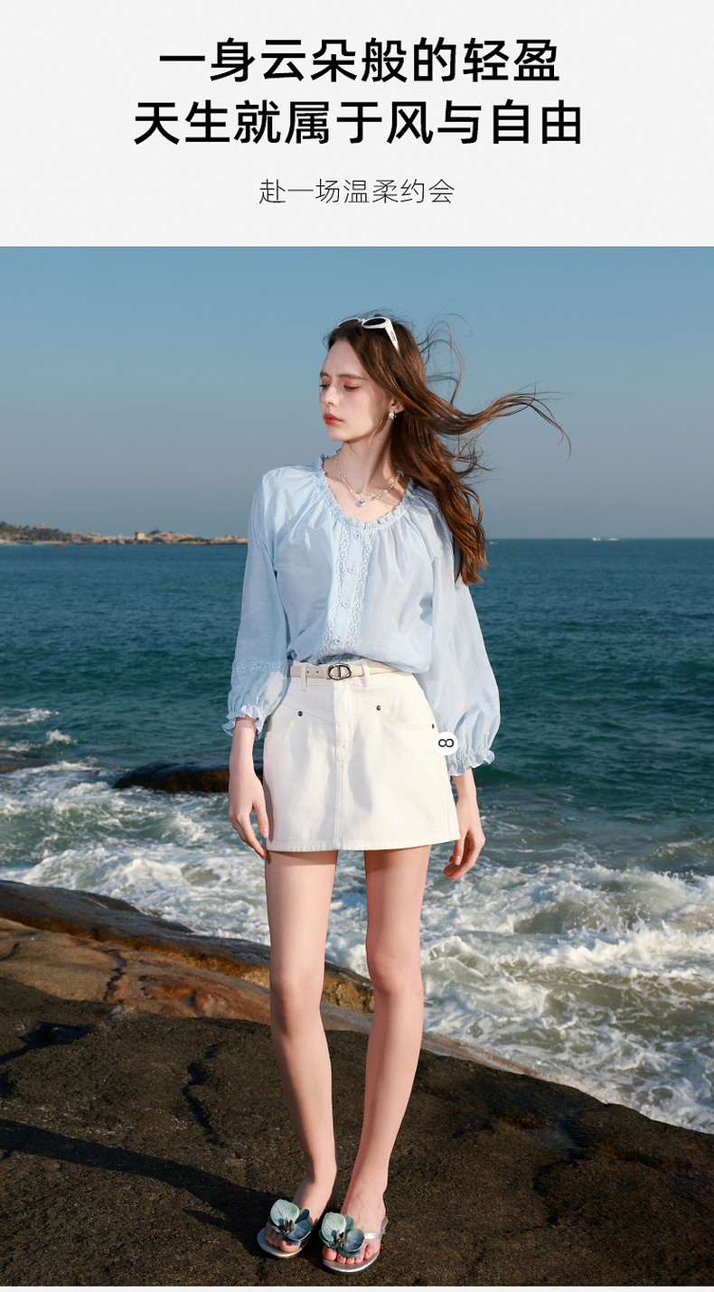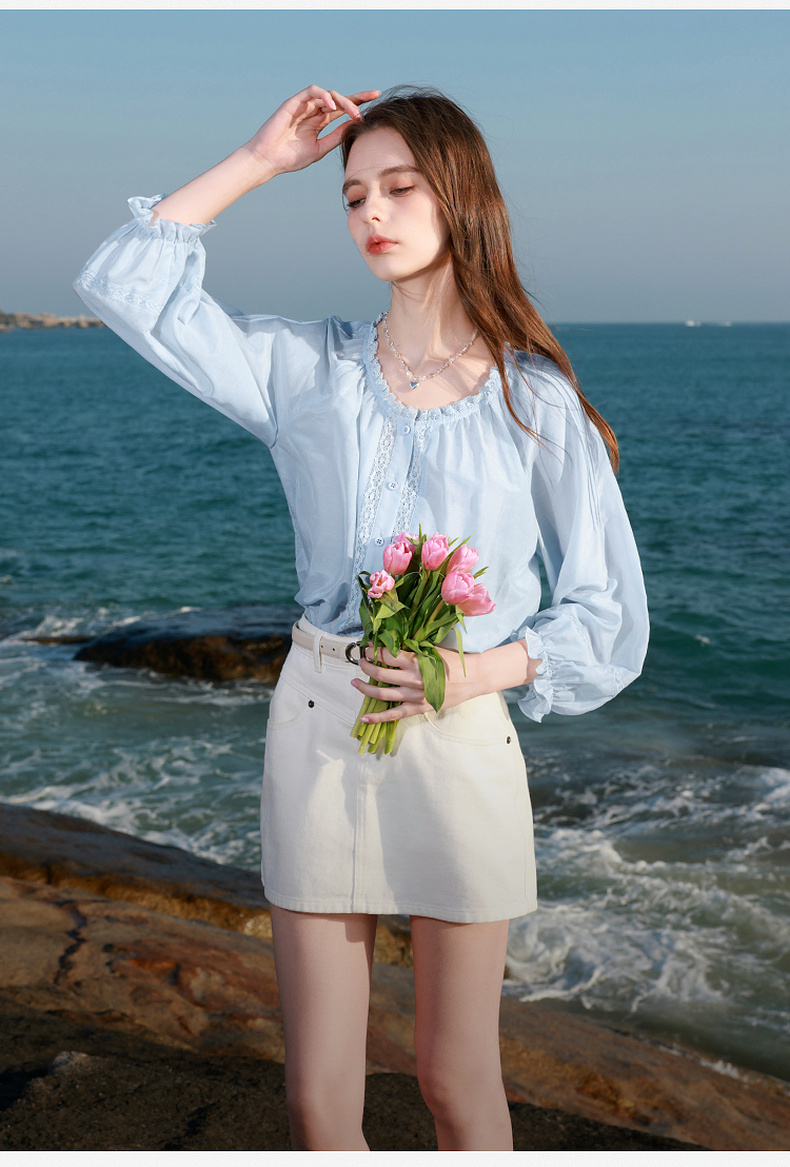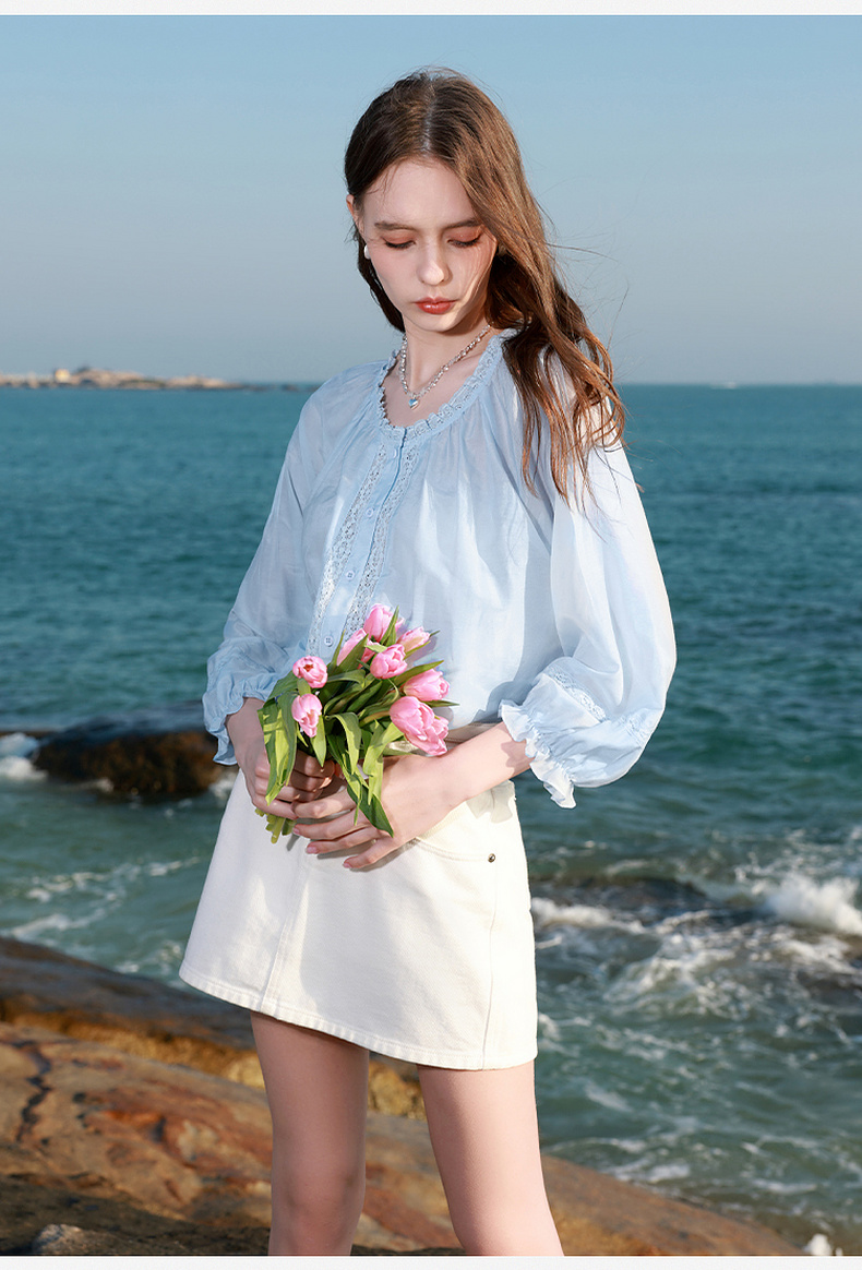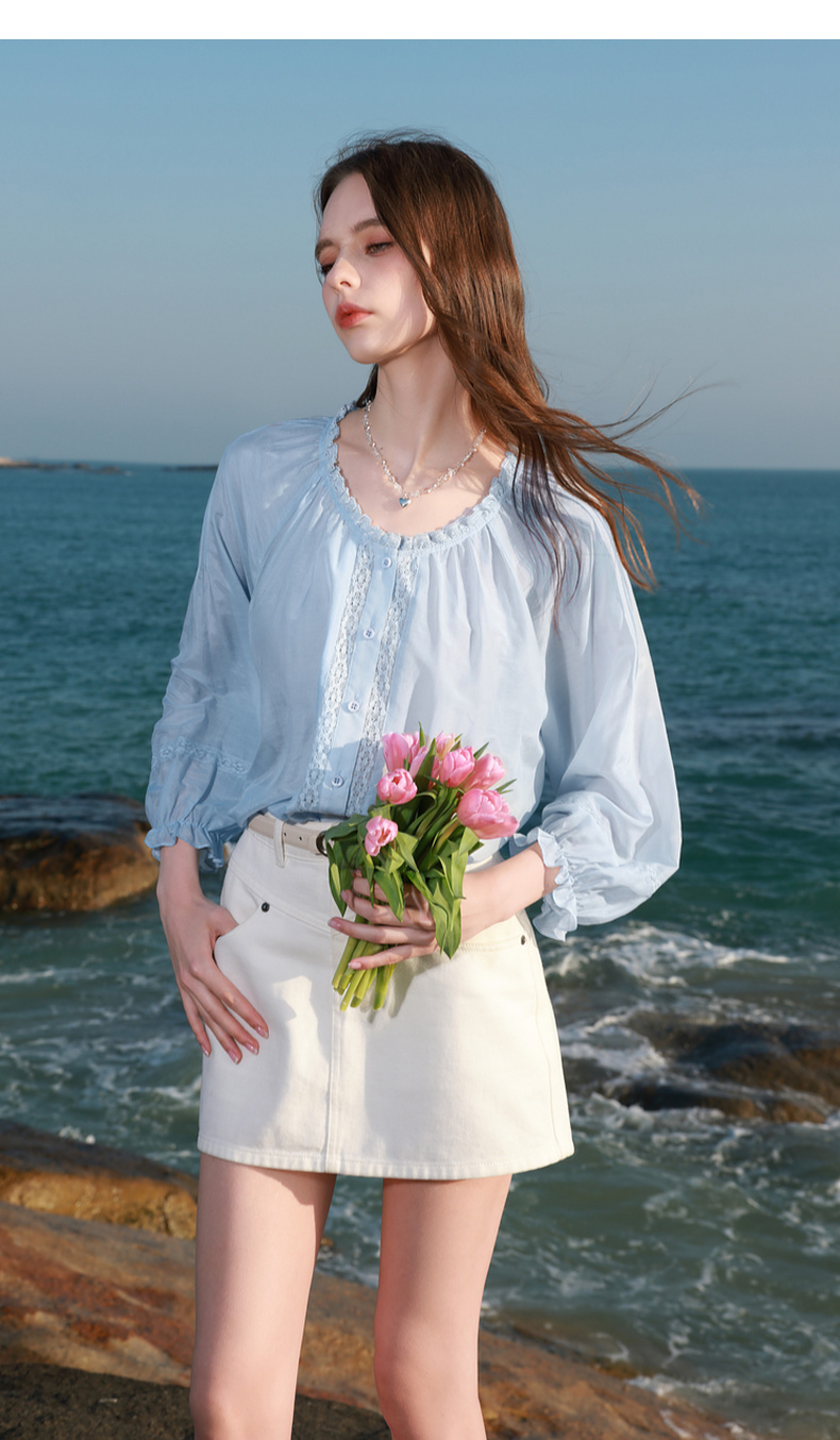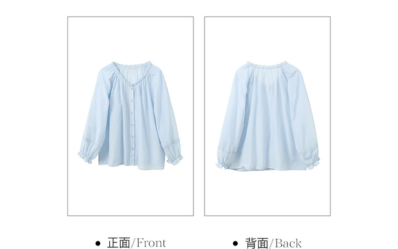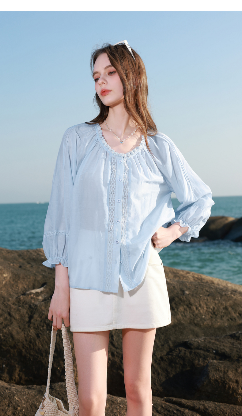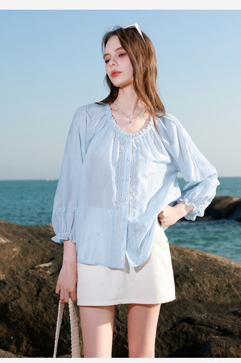 【桑蚕丝】三彩2026春季新款圆领花边衬衫小衫复古衬衣宽松上衣M