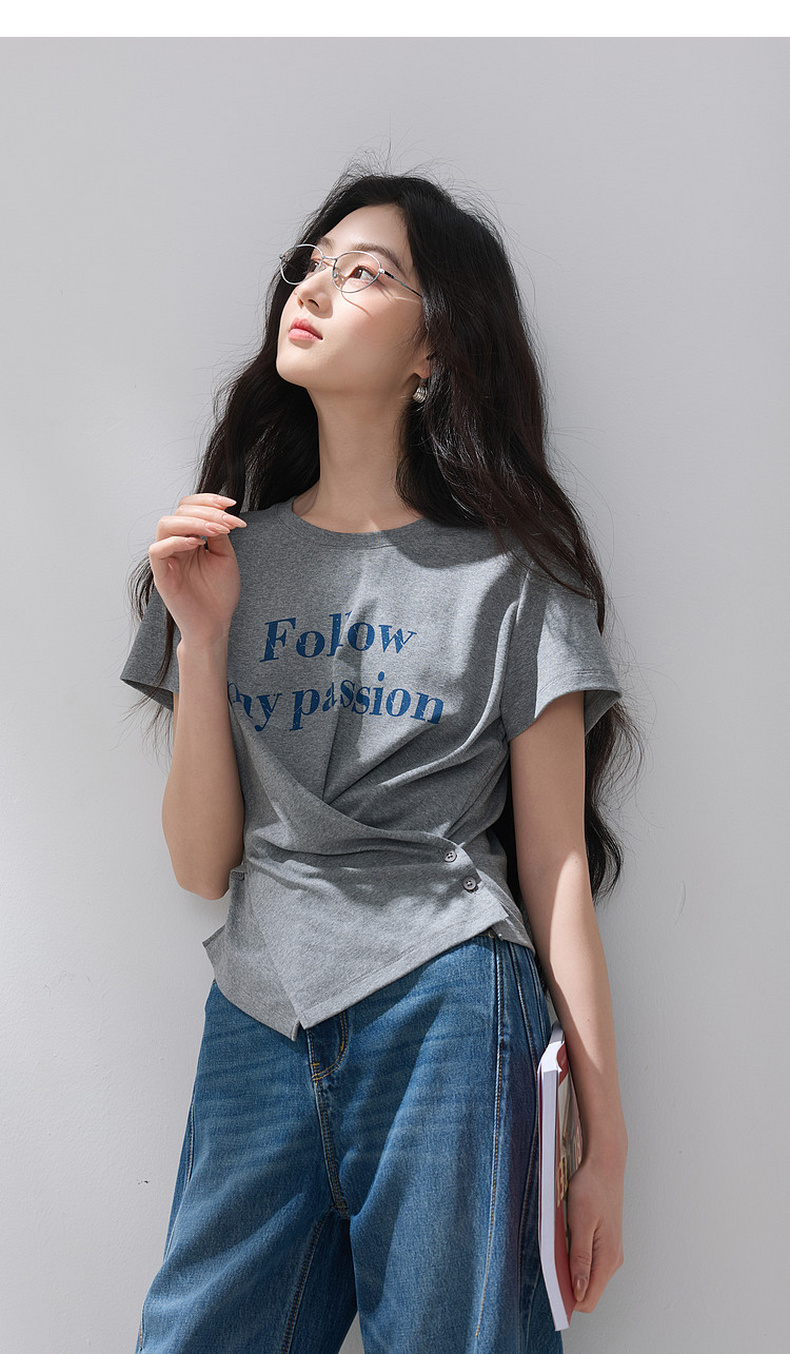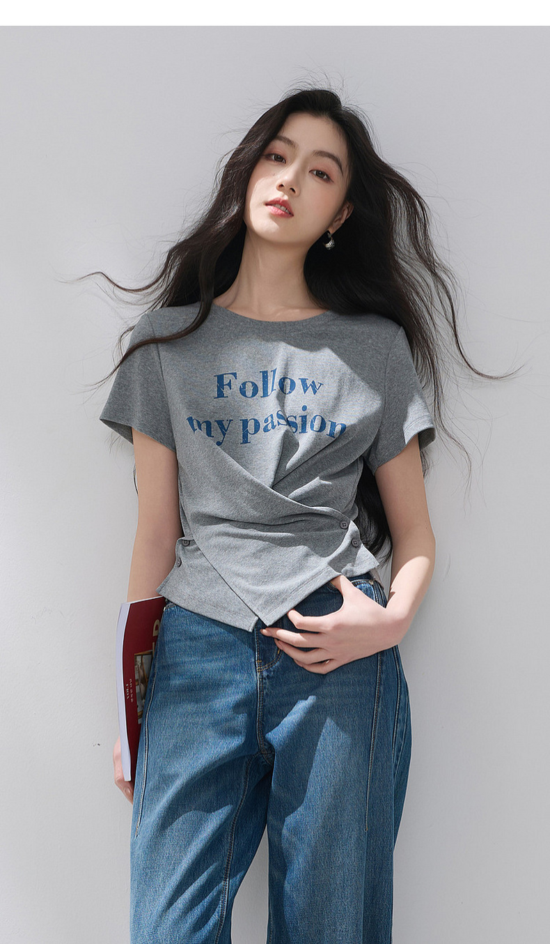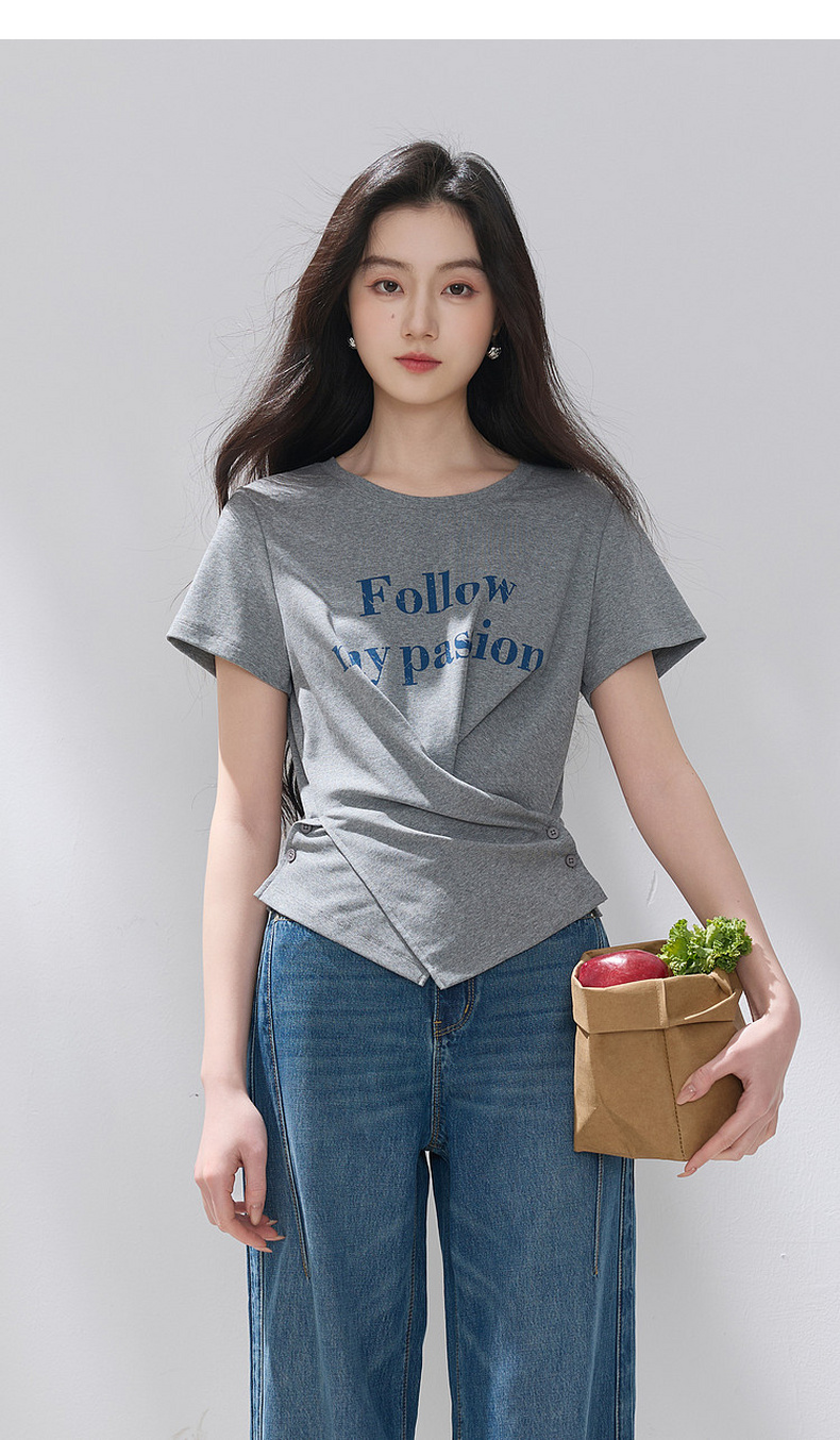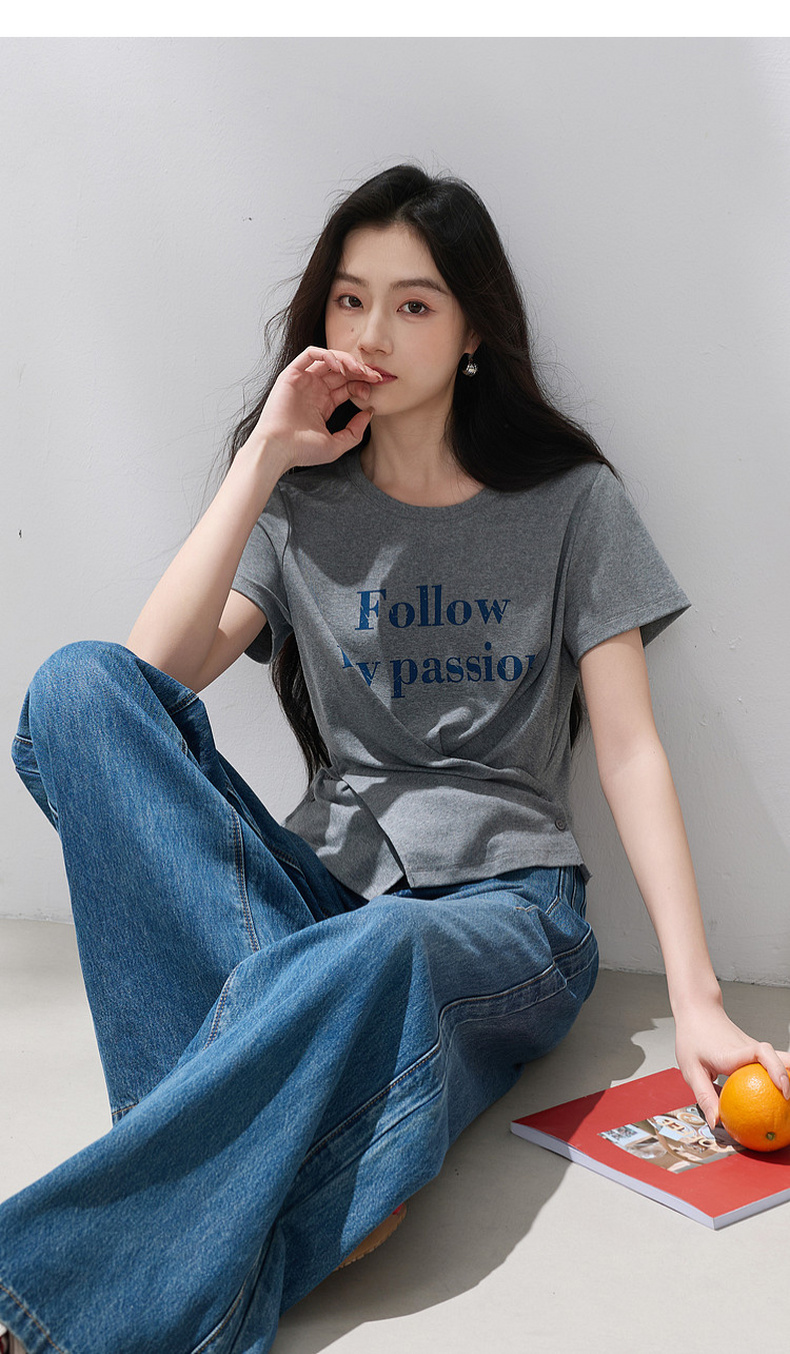 三彩2026夏季新款设计感收腰上衣短款字母印花T恤圆领短袖M