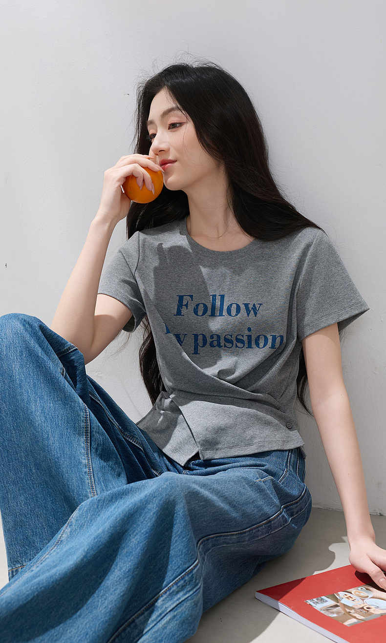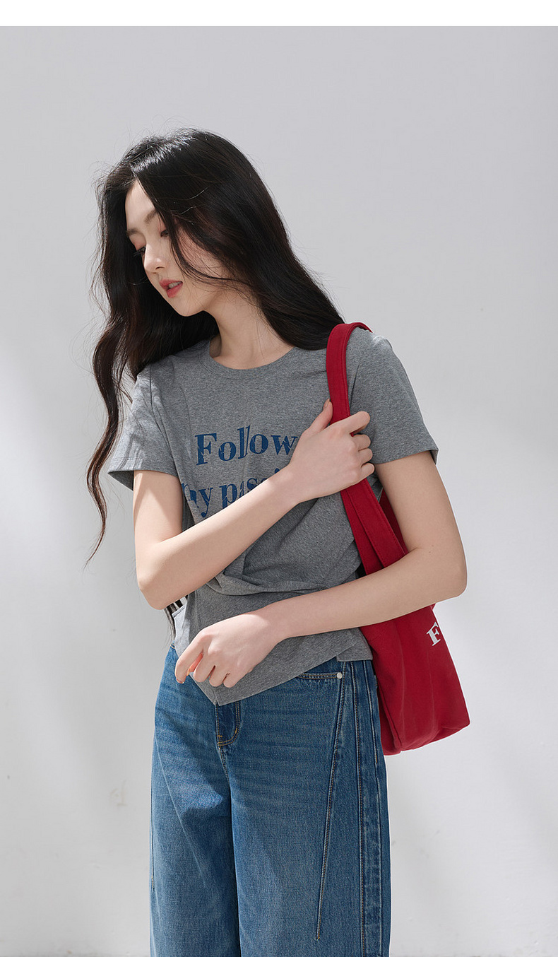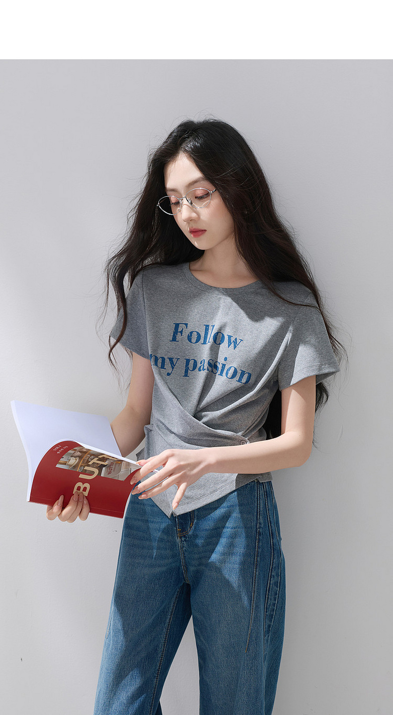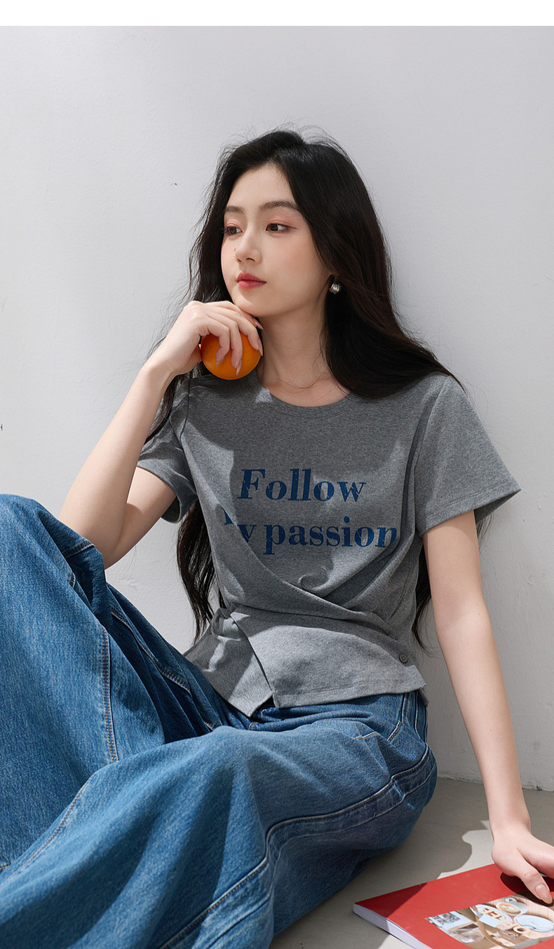 三彩2026夏季新款设计感收腰上衣短款字母印花T恤圆领短袖M
