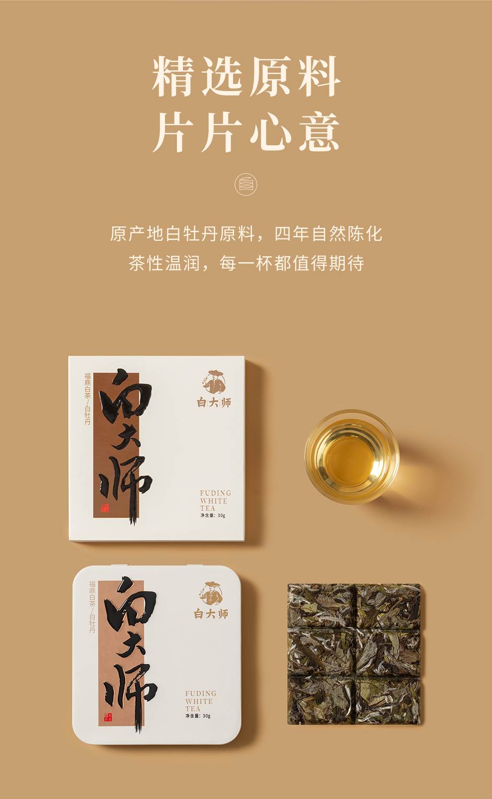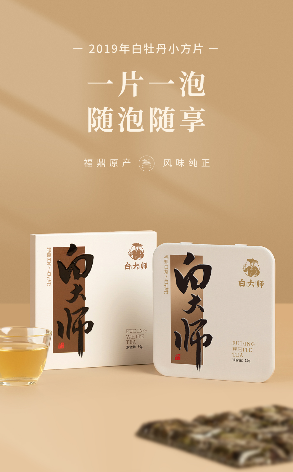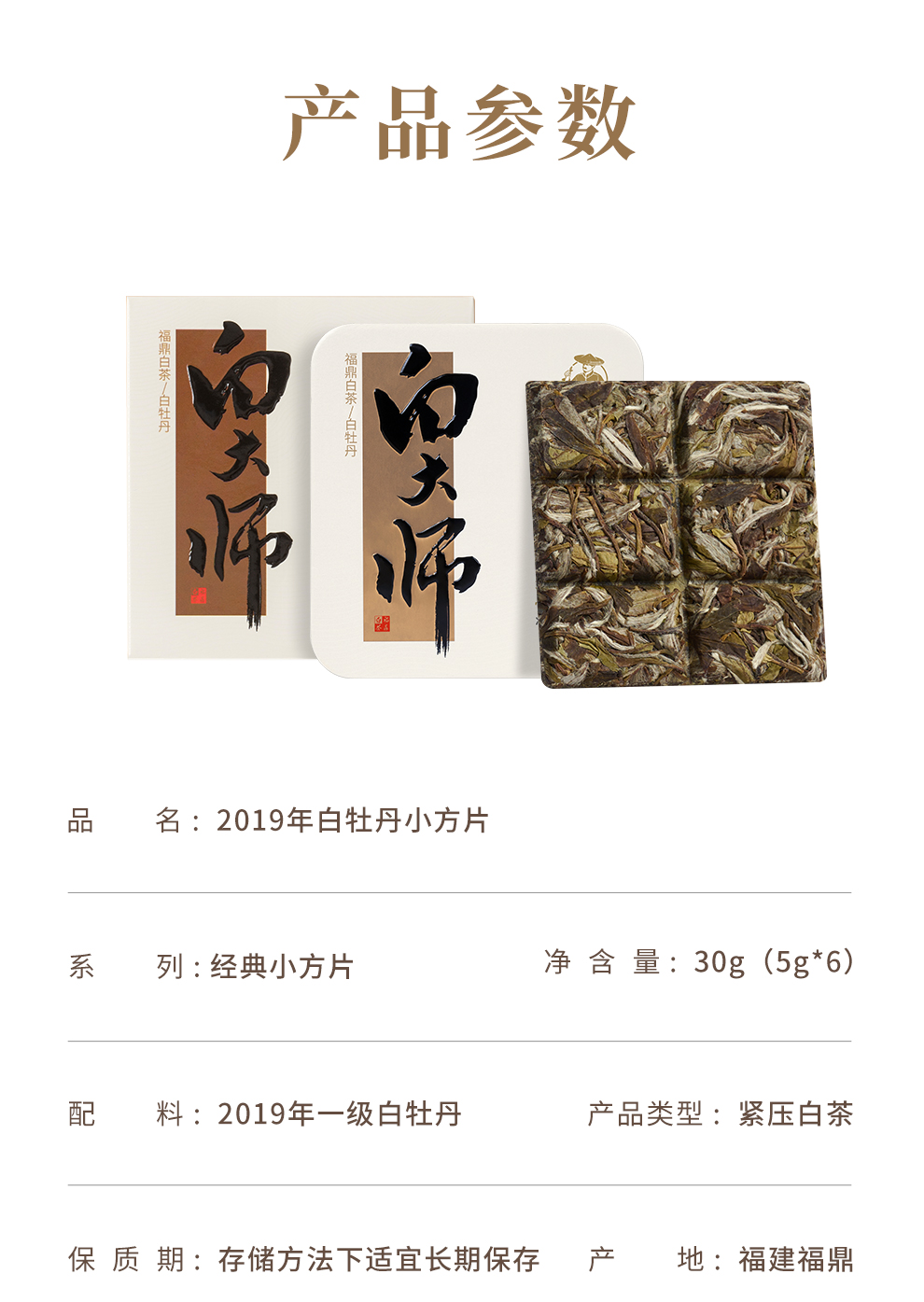 白大师福鼎白茶2019年陈年老白茶白牡丹茶叶便携小方片饼干茶30g