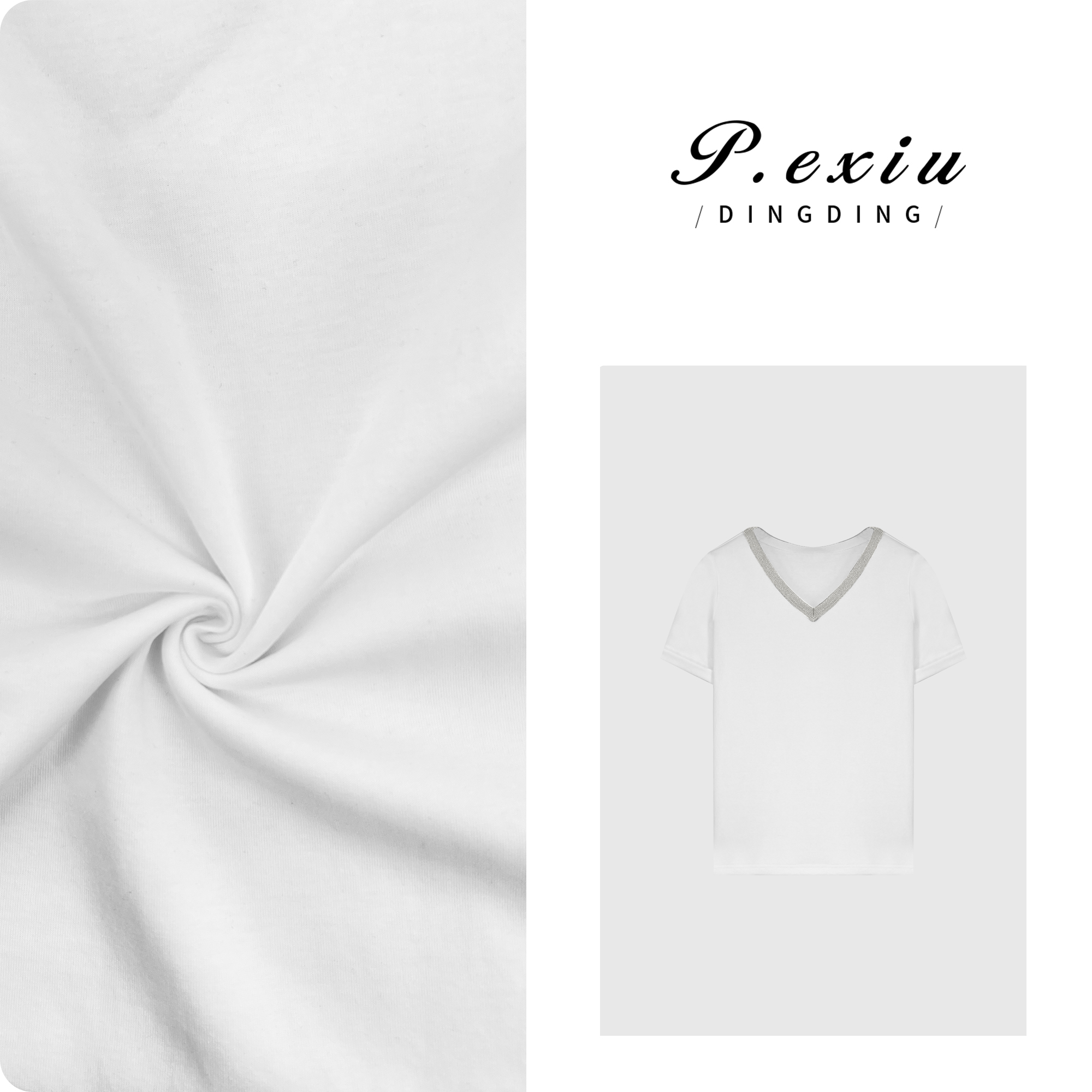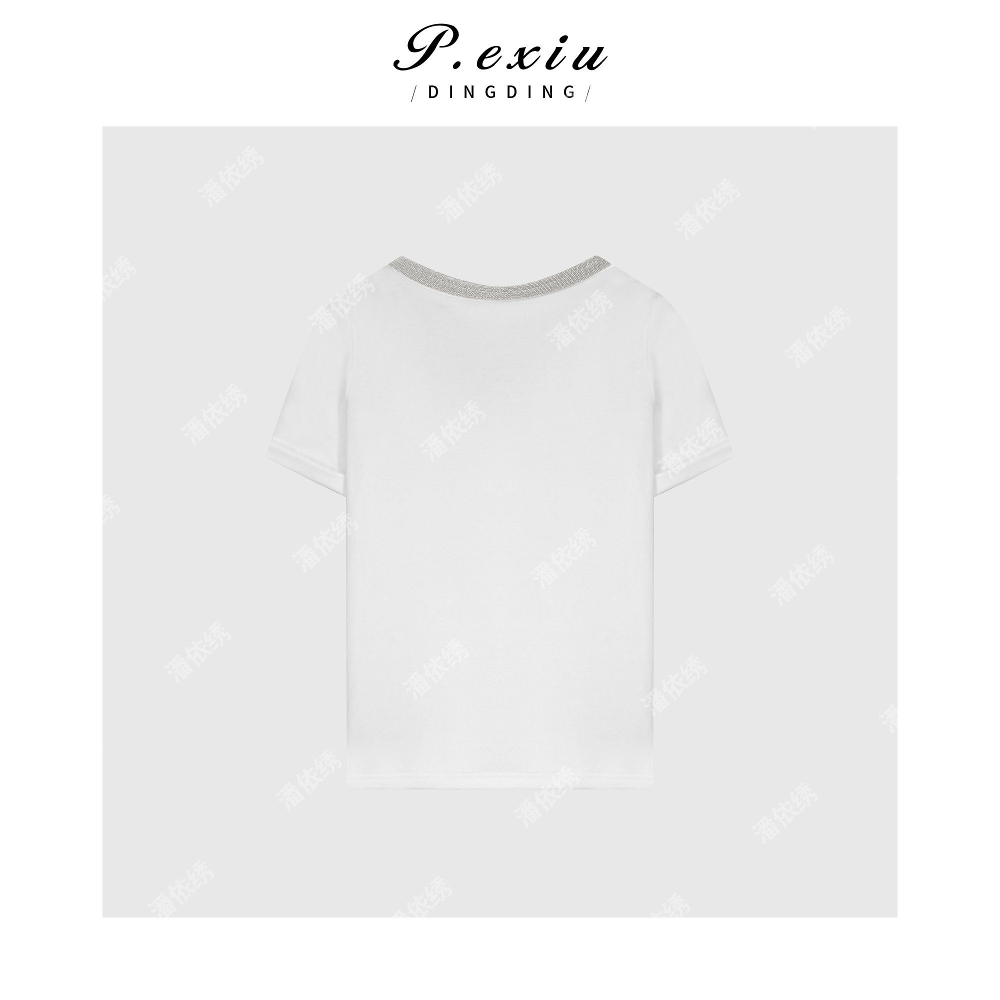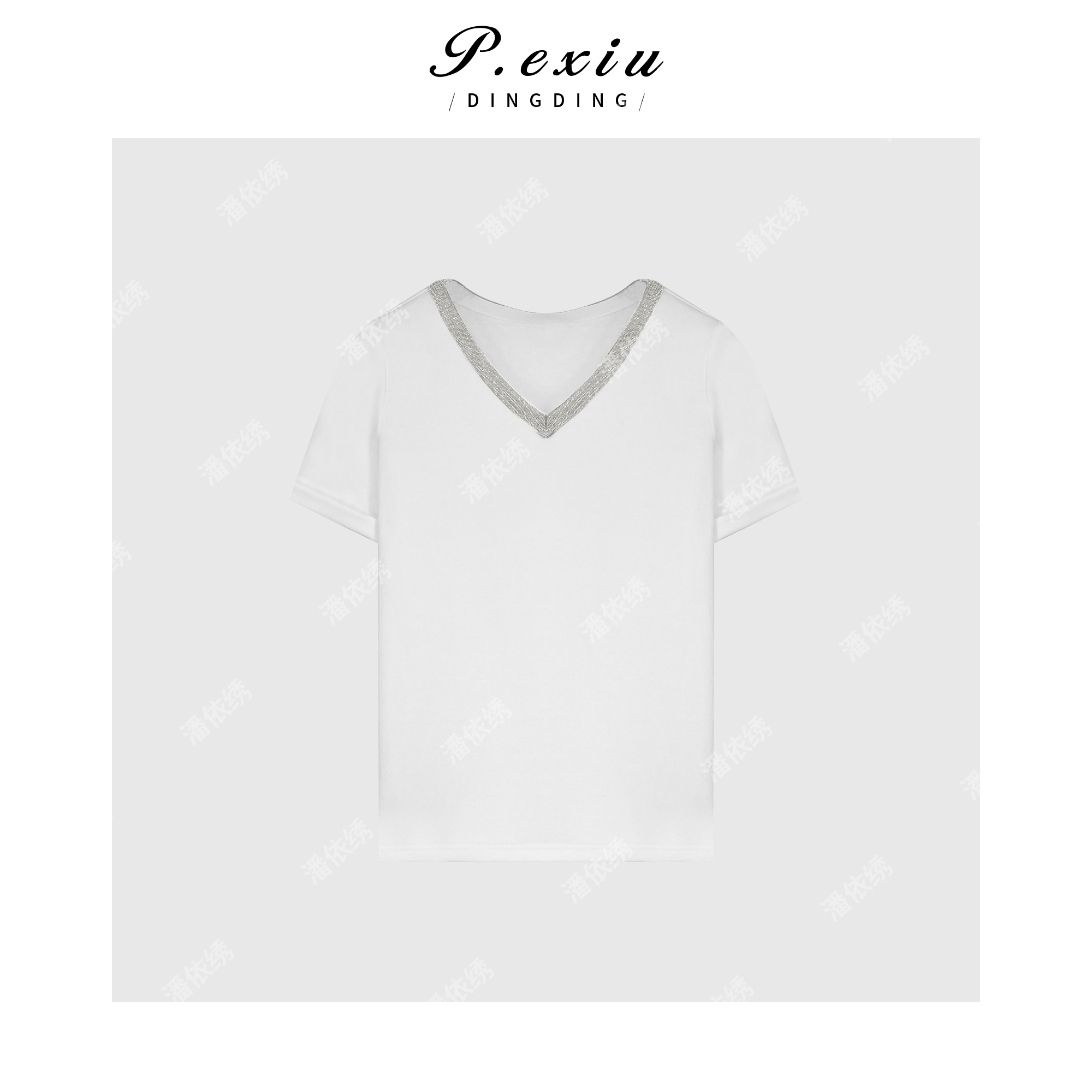 03-4潘依绣丁丁宠粉简约设计优雅风气质通勤V领钉珠短袖T恤 W-62238