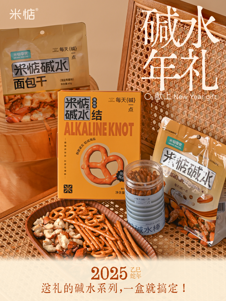 逢年过节需要送礼的时候经常能看到以下场景🎬 除了捆绑销售滞销款就是正装搭赠试吃装 过年的必做清单就是要把喜欢的东西全部吃一遍 不浪费不囤积才是年货采购的正确打开方式✨ 作为当家花旦,在各个直播间都能看到它的身影 能同时拿捏健康与美味的零食谁不爱呀 董洁、李诞、张瑶、叶一茜等倾情力荐☝️ 全网热度种草榜网红零食「米惦碱水系列」