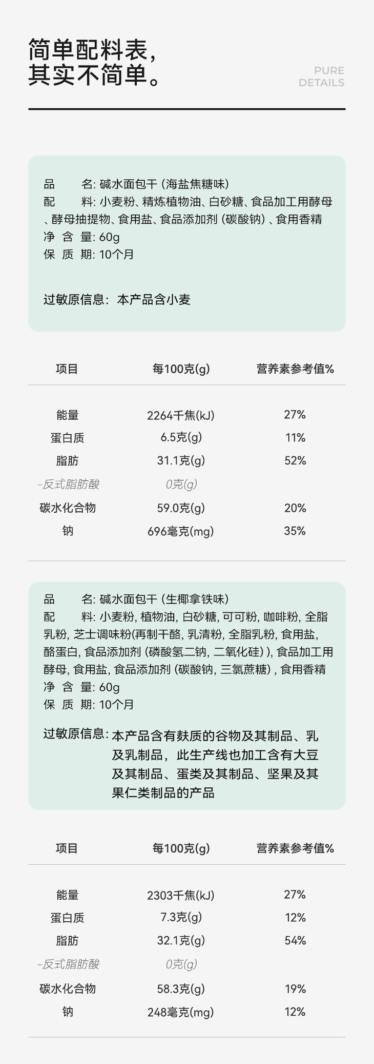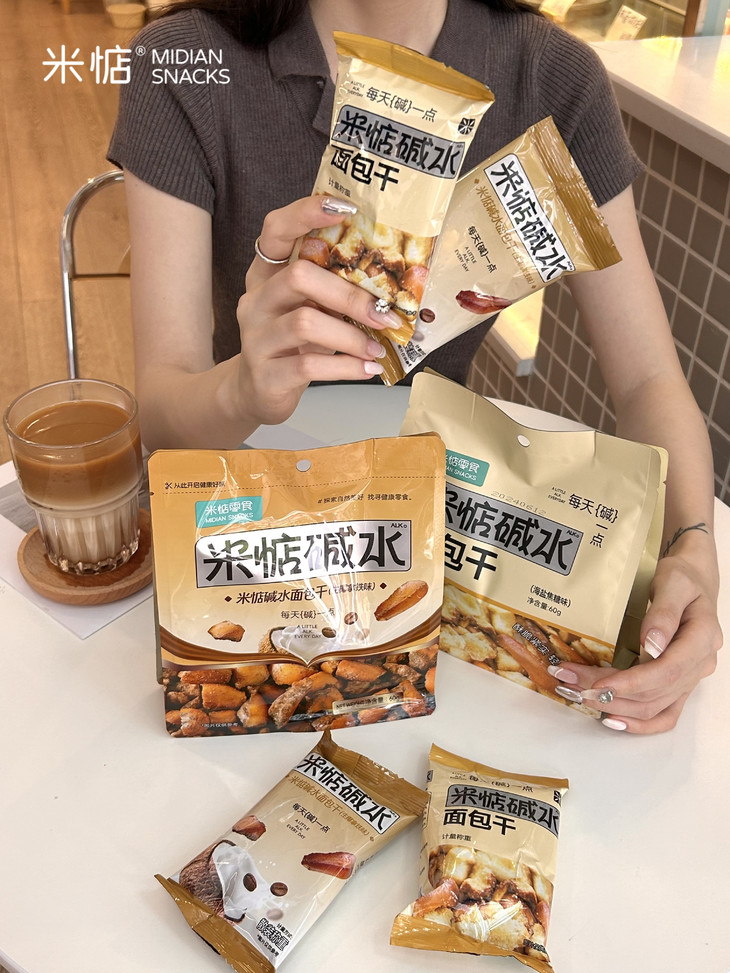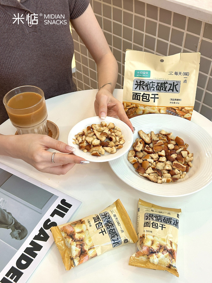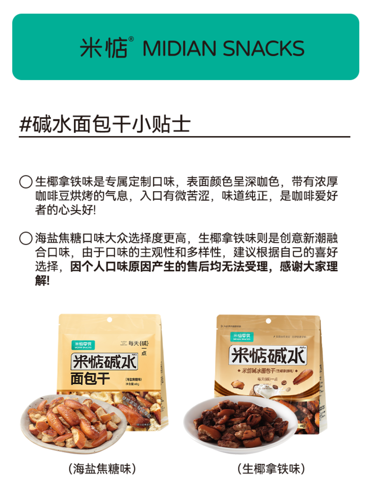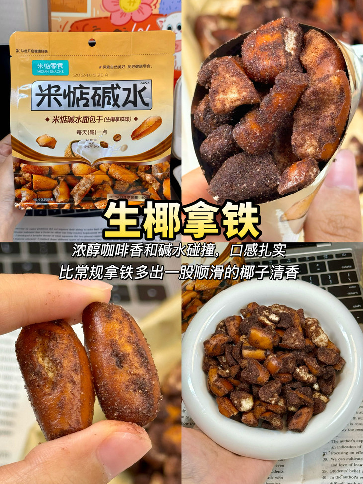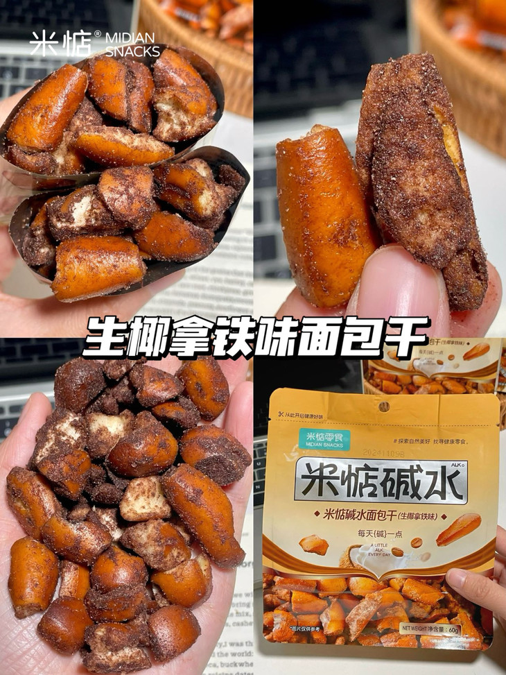 【碱水面包干】 相比较于碱水棒&碱水结口感更加丰富😋 海盐焦糖味和生椰拿铁味有着不同魅力 可盐可甜与香醇回甘我通通都爱 除了麦香就是碱味了,回归食物最原本的味道 一块接一块,越咀嚼越香,太让人着迷了✨ 不含反式脂肪酸不会给肠胃带来负担,更不怕长肉