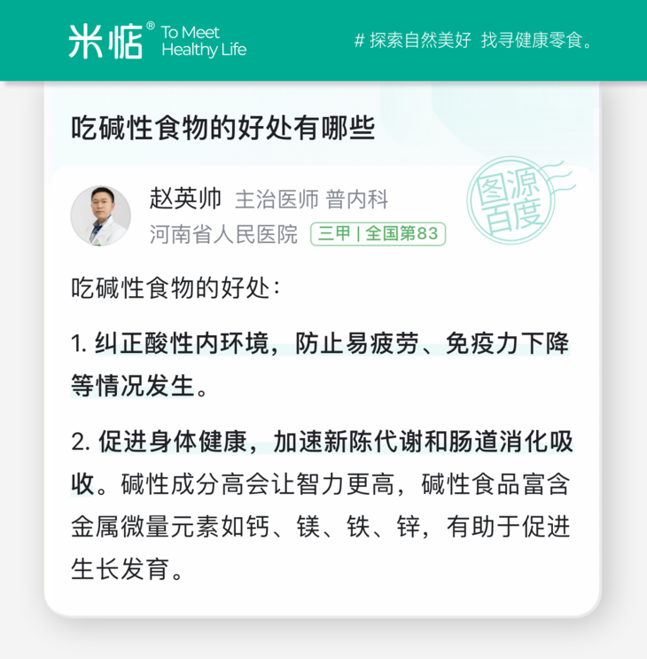 为什么要多吃碱性食物呢❓ 基于现在的生活现况和工作压力 越来越多的小伙伴养成不良的饮食习惯 尤其是过多的摄入酸性食物,加重身体负担 现代快节奏的生活无法提供足够的时间和精力🤦♀️ 从源头调整饮食习惯改变生活方式 “朋克养生”作为近几年的流行趋势 以日常化、简单化深受年轻人的欢迎👏 营养学一直呼吁人们继承五谷为本、粗粮细吃 消化科医生也呼吁大家日常多摄入“碱性”食物 选择健康的生活方式,有意避免或减少酸性食物的摄取,在一日中多做“碱”法➖