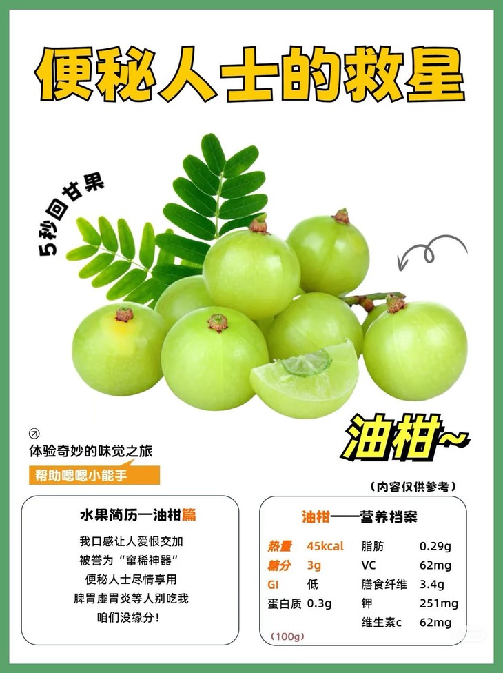 【英贝健·益生元油柑纤维果饮】 📝「油柑果」——让人“又爱又恨”的水果🫒 初尝酸到皱眉,3秒后甜到上头! 神奇之处就在于它的“先苦后甜”,刚入口酸涩到怀疑人生,忍过几秒回甘爆棚! 它更是“刮油神器”!“便秘克星” 感觉整个人都被油腻封印了?来几颗油柑,瞬间解腻!它里面的有机酸和单宁,简直就是“刮油”小能手,吃完肠胃都轻松了~🍲🍢