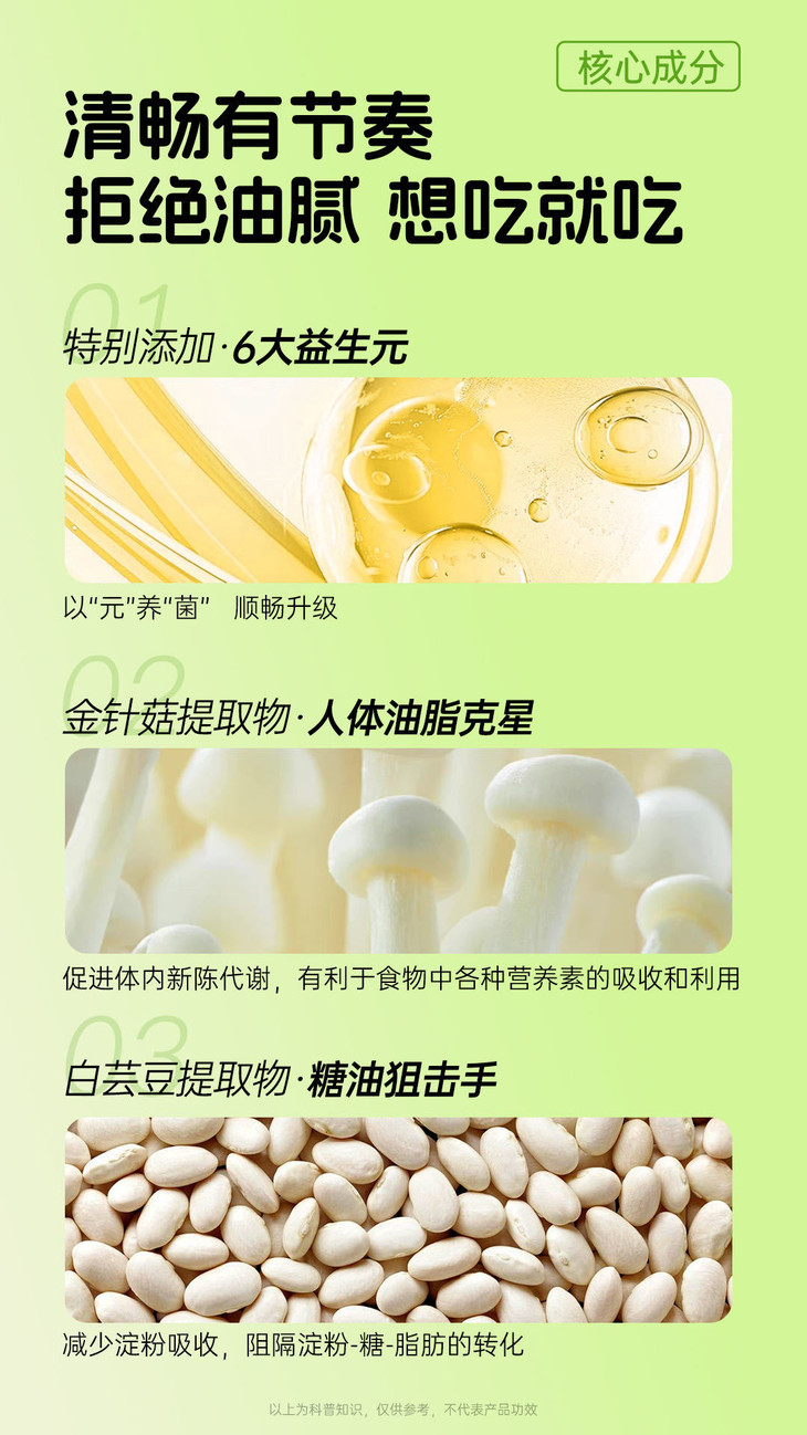 英贝健平衡营养学院专研配方 🉑不止“好油柑汁”那么简单 升级三大核心成分KO糖油脂混合物 👉20%NFC油柑汁:油腻王炸杀手 👉金针菇粉:人体吸油纸,油腻克星本星!🛢️❌ 👉白芸豆:碳水阻断小能手,一顿饭66%淀粉saybye!🍚❌