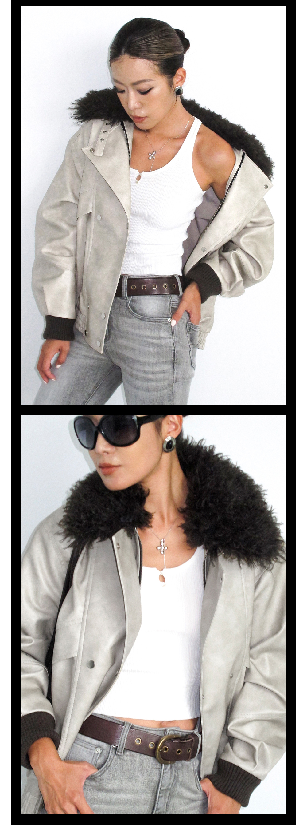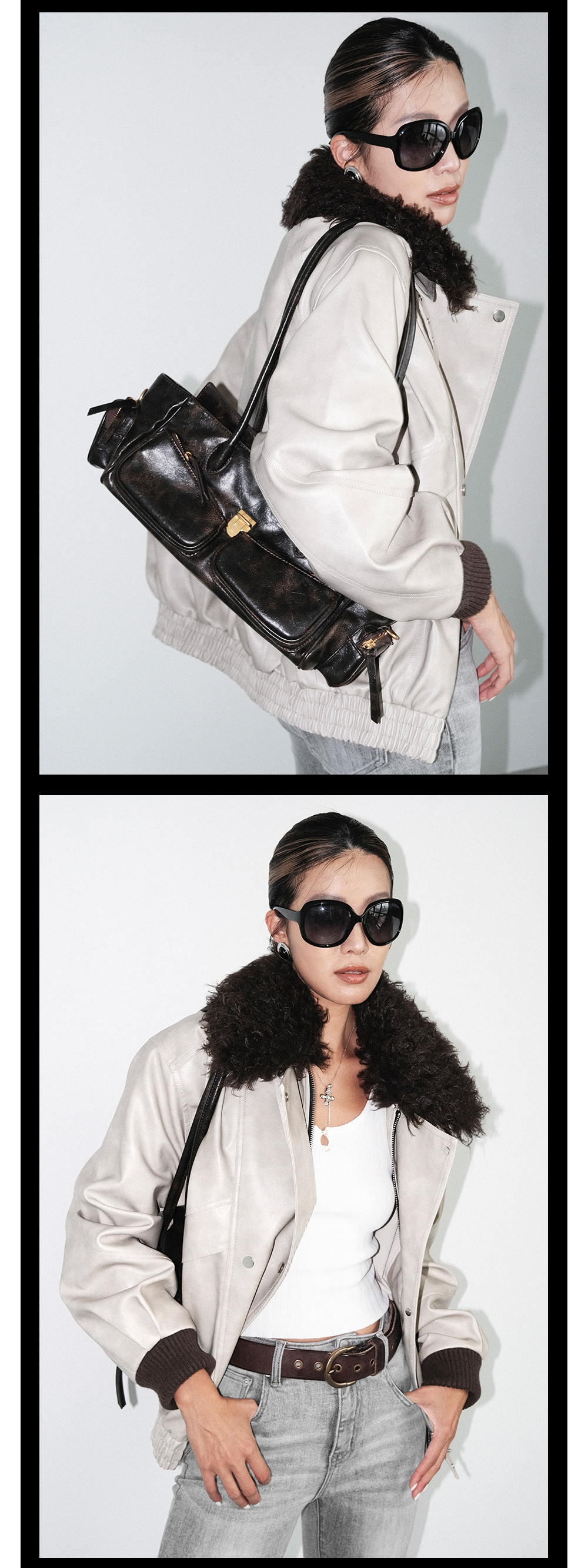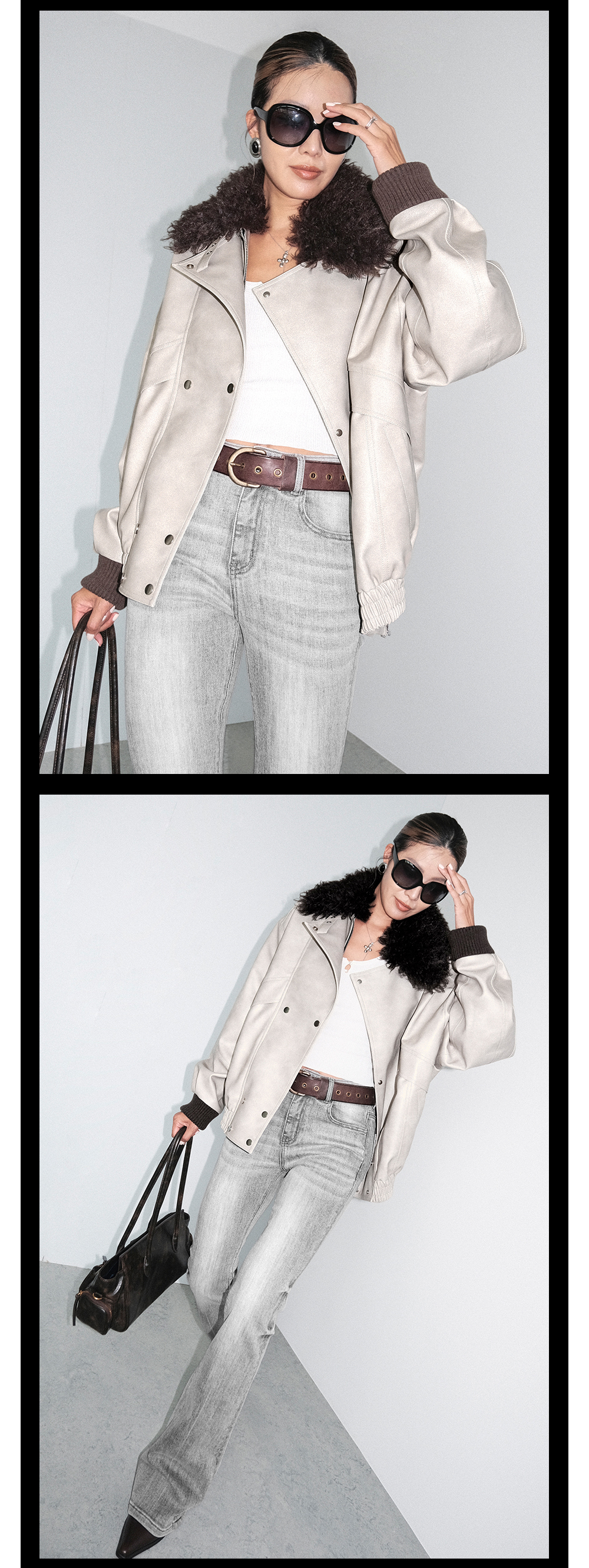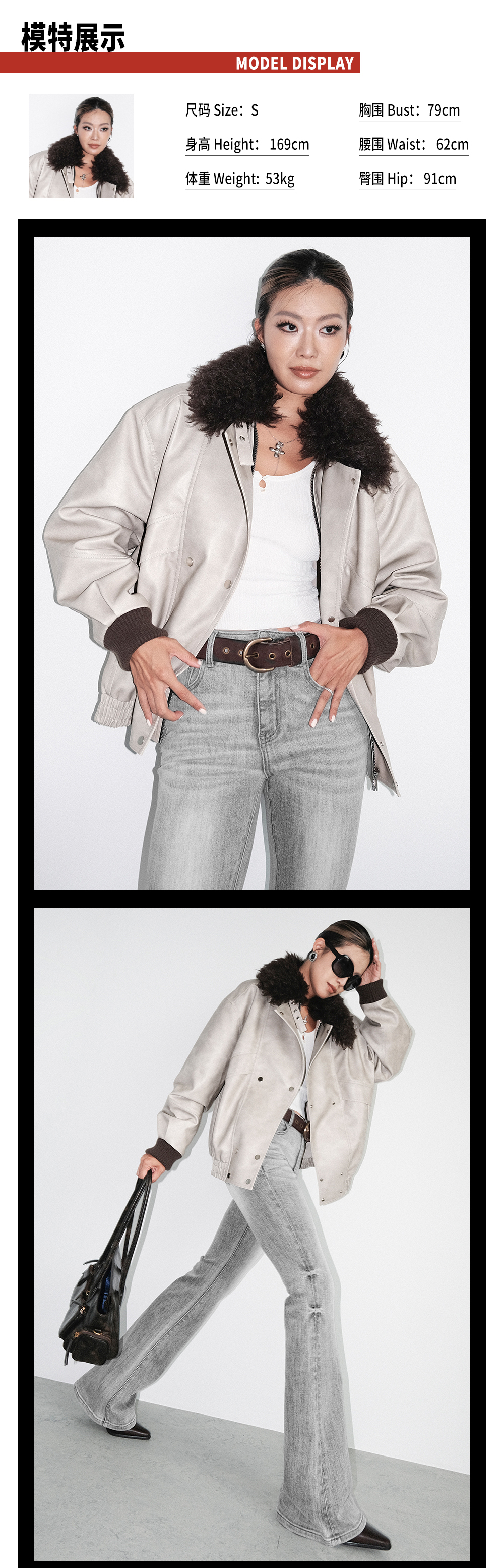 TR她热 型走都市 水泥白PU皮可拆卸毛领复古水洗皮夹克外套