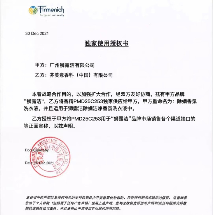 狮露洁洗衣液凝珠采用瑞士进口香氛,品牌专属定制: 香氛原料均为国外进口,英国著名调香师Bernard Ellena。倾心调香,独家授 权COCO香型,从晾晒到着衣,都是360°的香疗享受。(有进口报关单) 采用微胶囊黑科技,持久留香72小时。 # 芬美意简历 始于1895年,全球香精香料行业最大的家族私营企业 合作洗衣剂品牌:立白、奥妙、好爸爸、蓝月亮、超能... 调香师香水作品:CK唯一、古驰花悦、兰蔻奇迹、圣罗兰黑**、巴宝莉周末女士..
