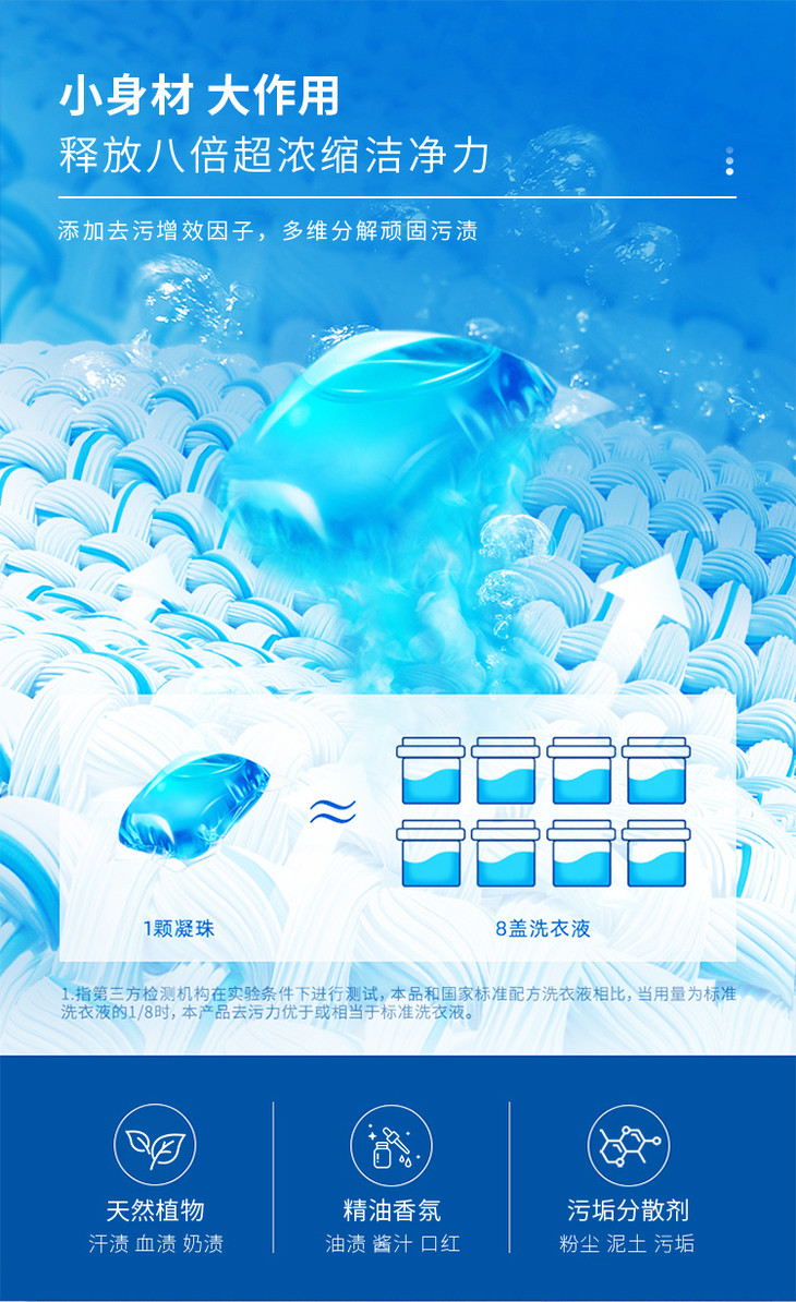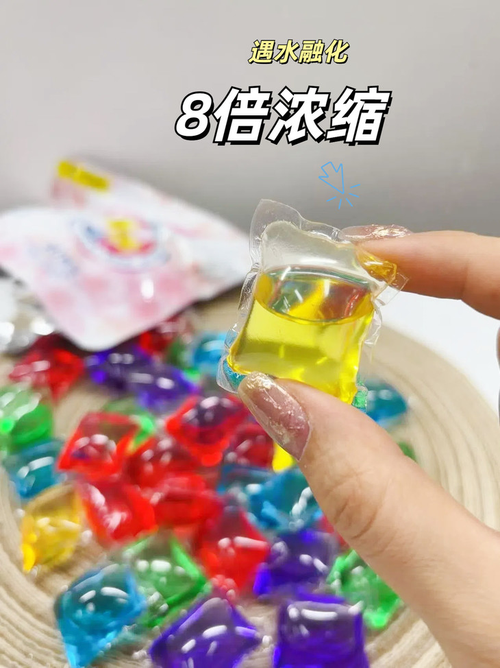 富含速洁因子带来强劲的洁净能量,即使直接机洗,也无须额外浸泡和搓洗,能够瞬间净透,深入衣物纤维,即刻瓦解并祛除99种污渍,8倍洁净,更快更轻松。 每颗活性物成分不低于80+,不逊于任何国际大牌凝珠的清洁力,油渍、泥渍、奶渍、血渍、化妆品、果蔬渍,看得见和看不见的污渍通通洗掉。 小小1颗,解决多重烦恼,囤货占地 / 用量难控 / 细菌尘螨 / 衣服异味~ 水溶性外膜 速溶无残留 支持15分钟快洗‼