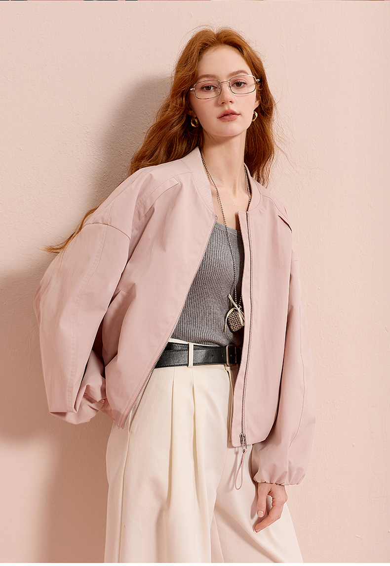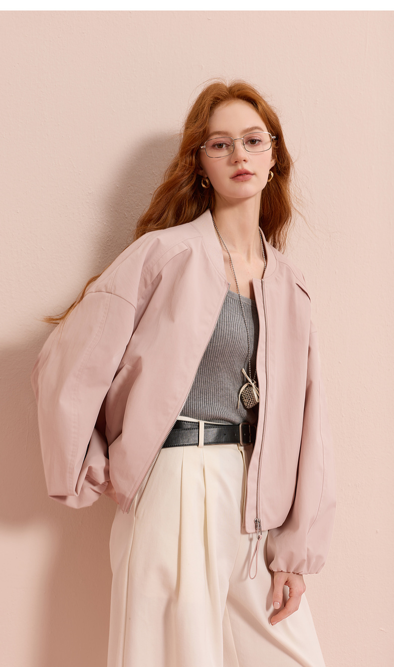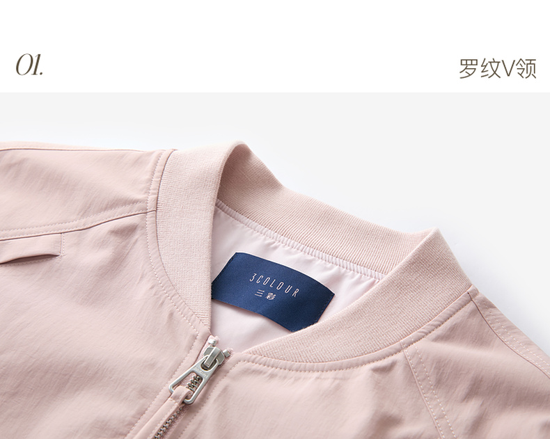 三彩2025秋季新款休闲V领拉链外套宽松廓形开衫简约粉色M