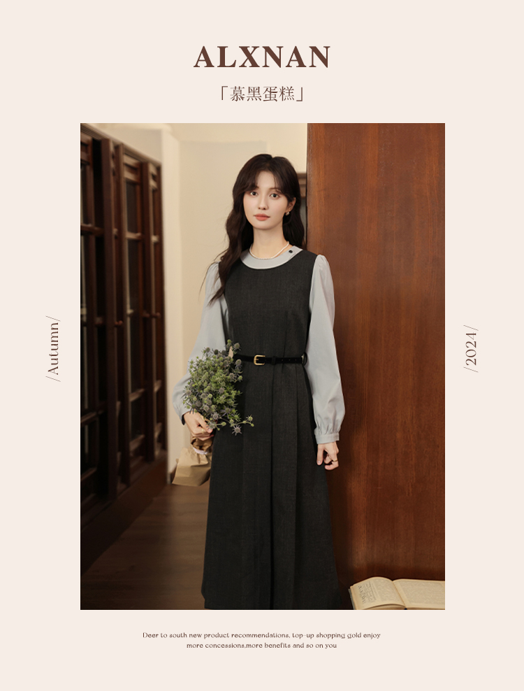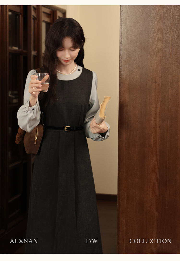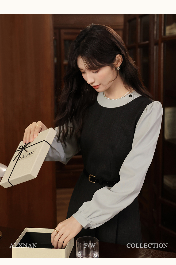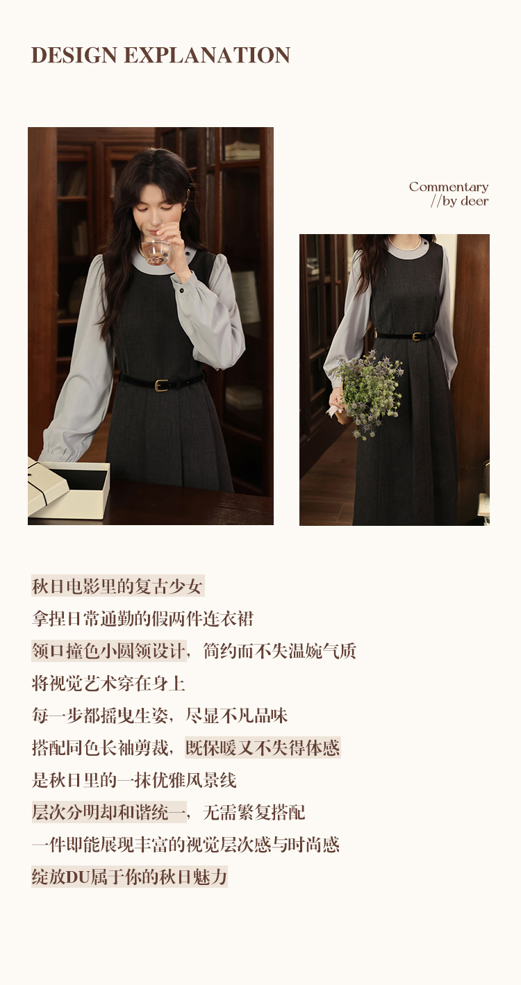 鹿向南「慕黑蛋糕」法式假两件撞色长袖连衣裙2025秋季气质长裙女