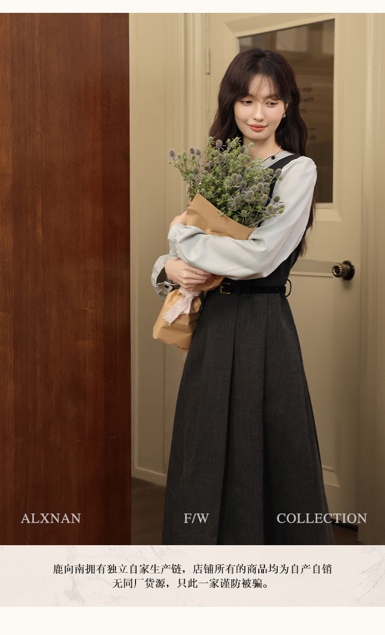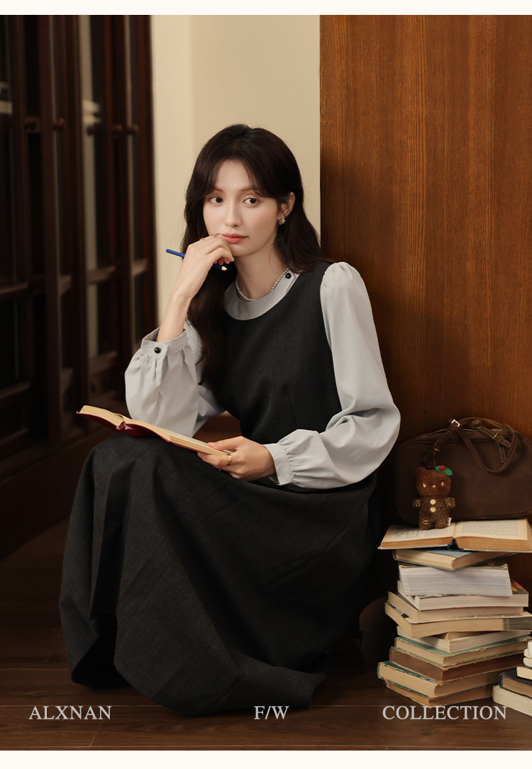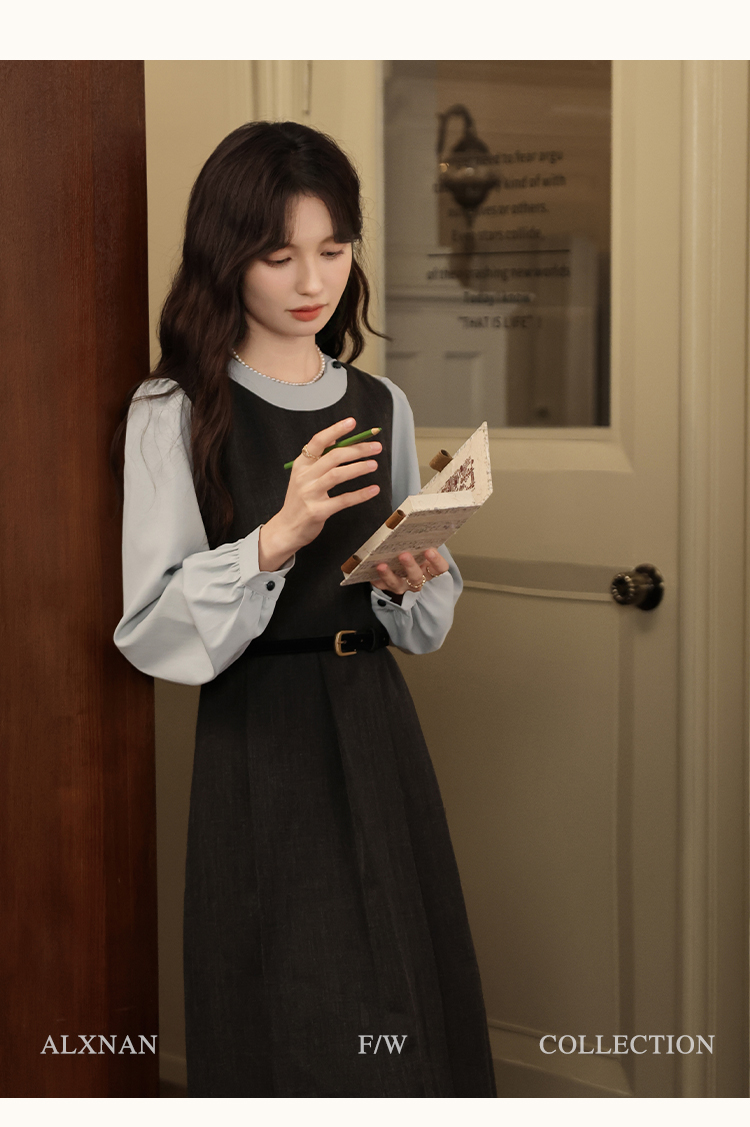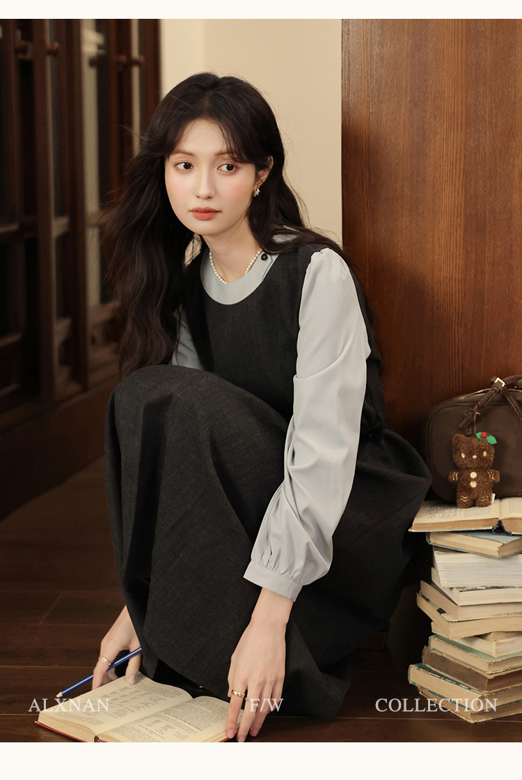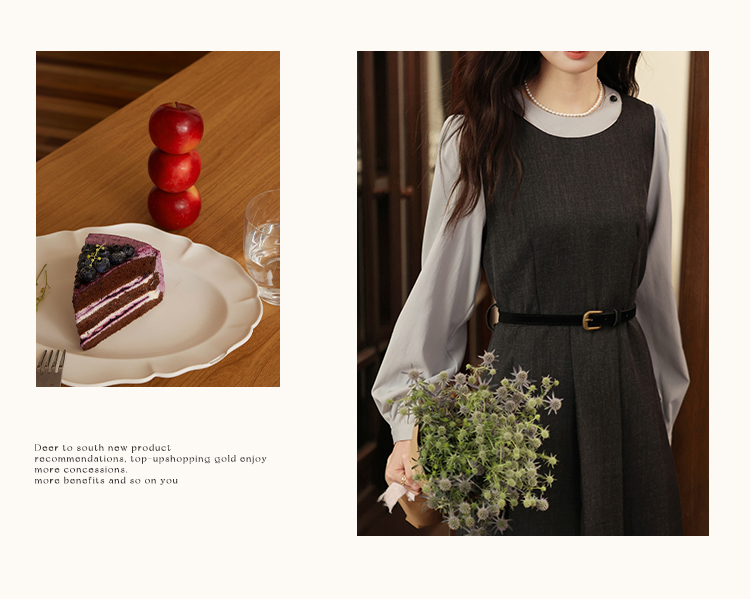 鹿向南「慕黑蛋糕」法式假两件撞色长袖连衣裙2025秋季气质长裙女