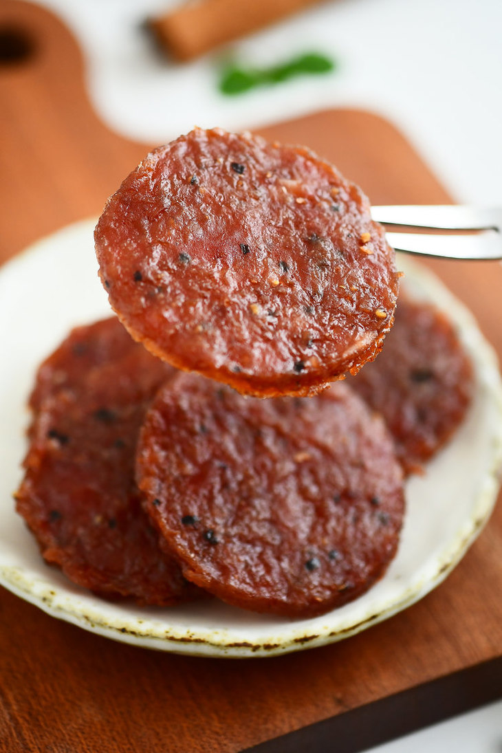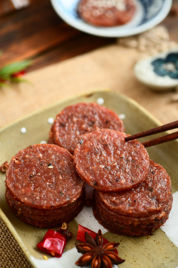 【配料】猪肉、白砂糖、鸡蛋、大豆蛋白、食用植物油、芝麻、黑胡椒、鱼露、肉味粉(猪肉、鸡肉提取物、麦芽糊精)、食用盐、味精、食用香料、食品添加剂 (甘油、双乙酸钠、D-异抗坏血酸钠、胭脂虫红)。