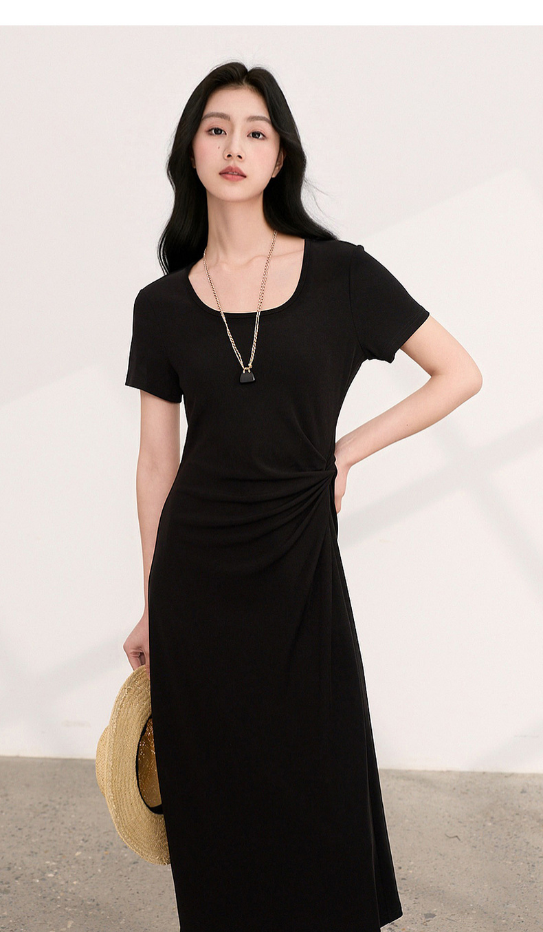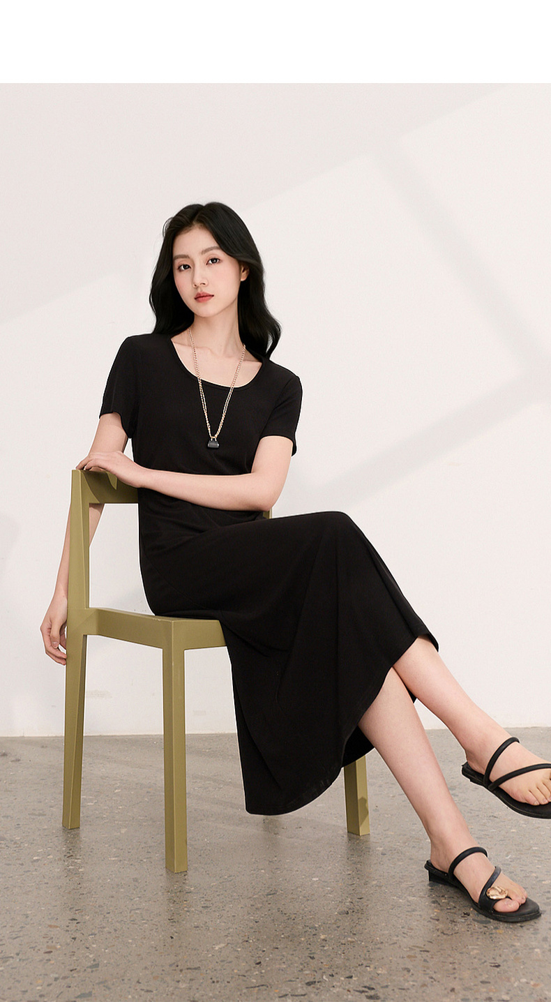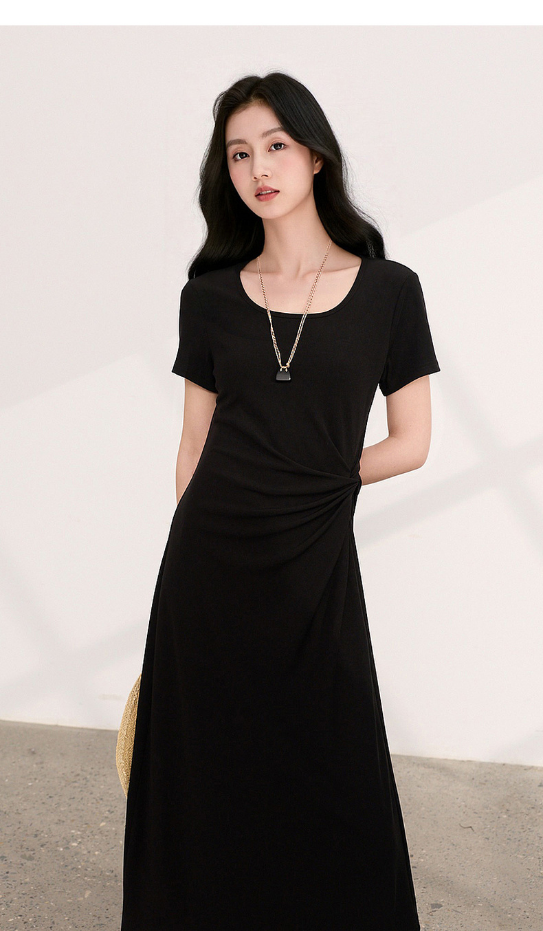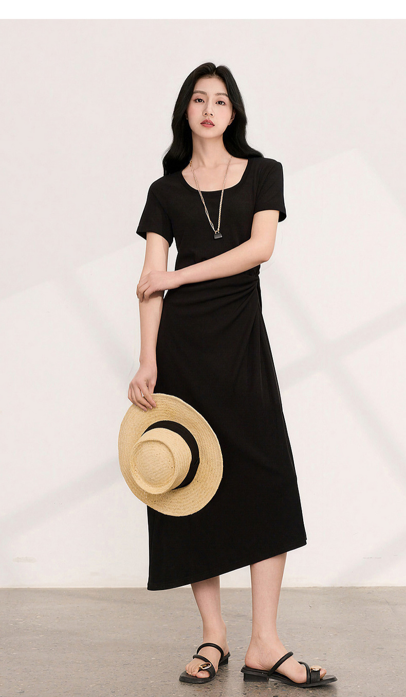 三彩2026夏季新款简约复古方领休闲直筒裙连衣裙短袖长裙小黑裙M