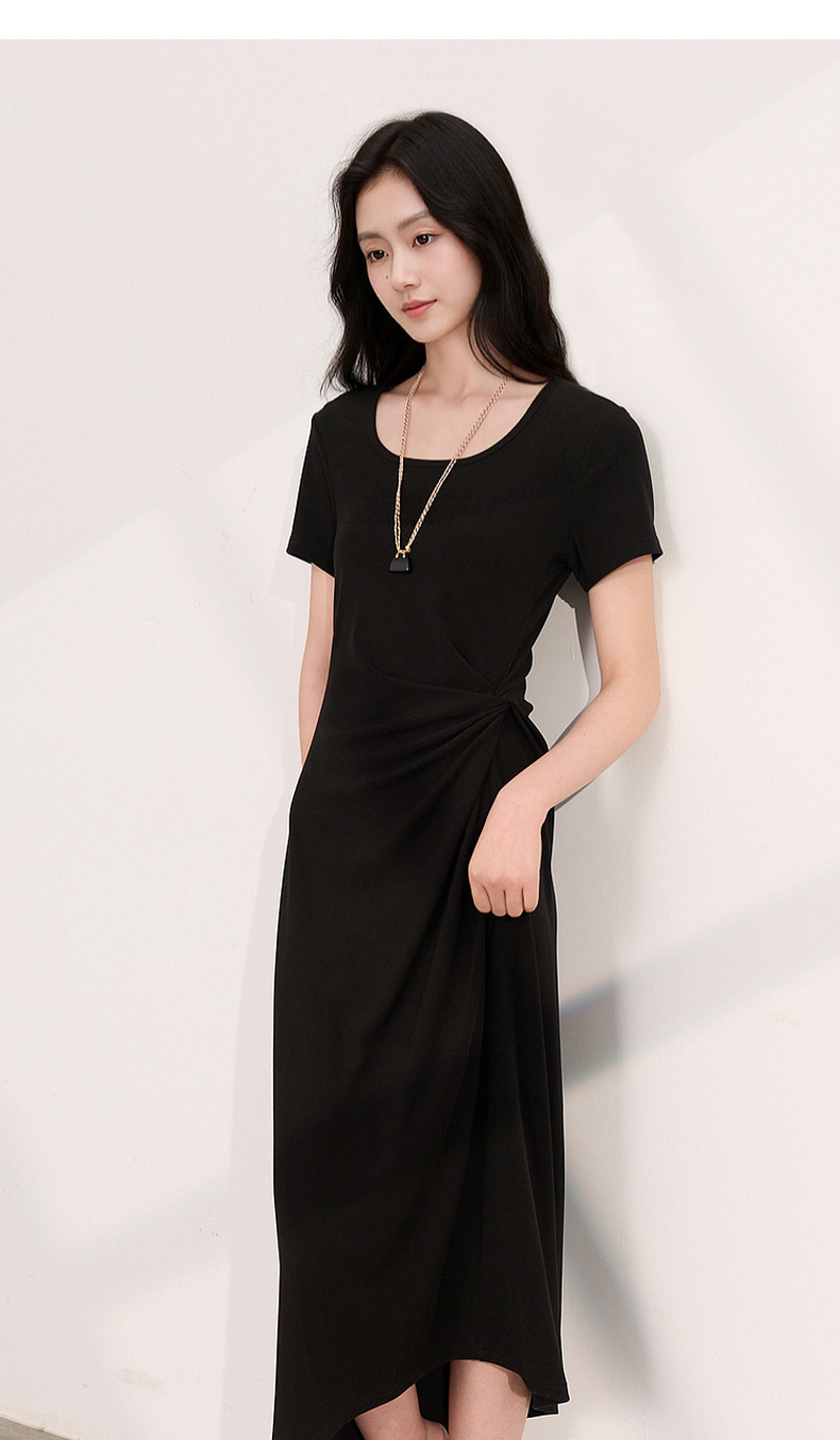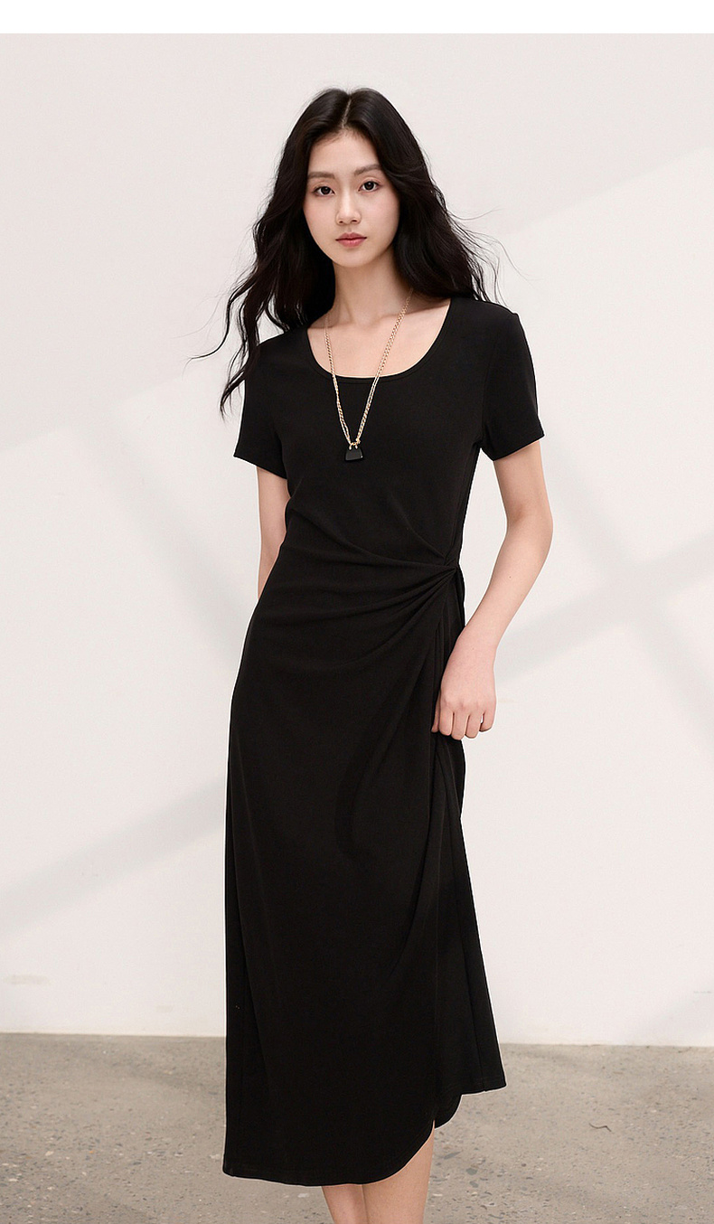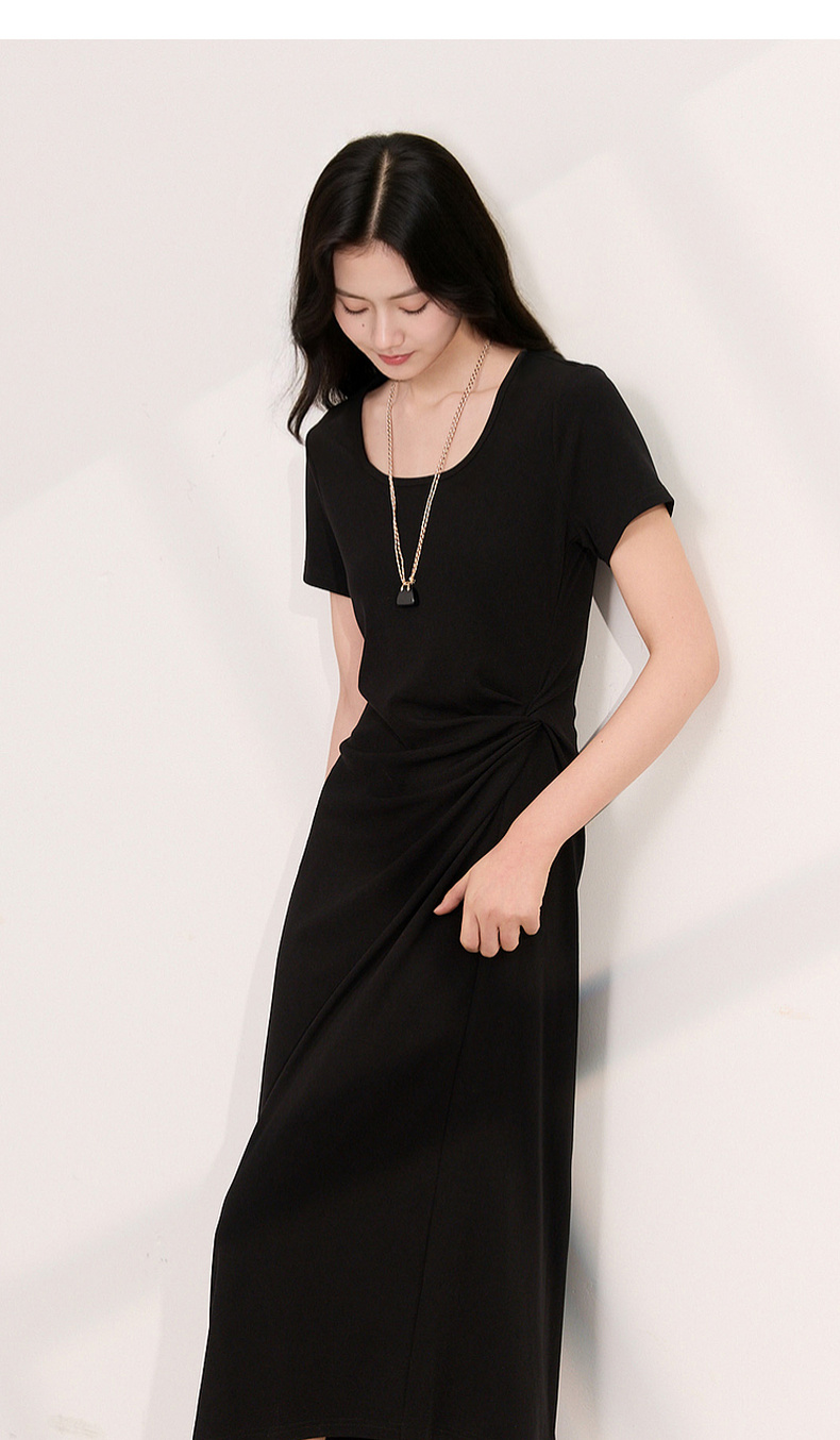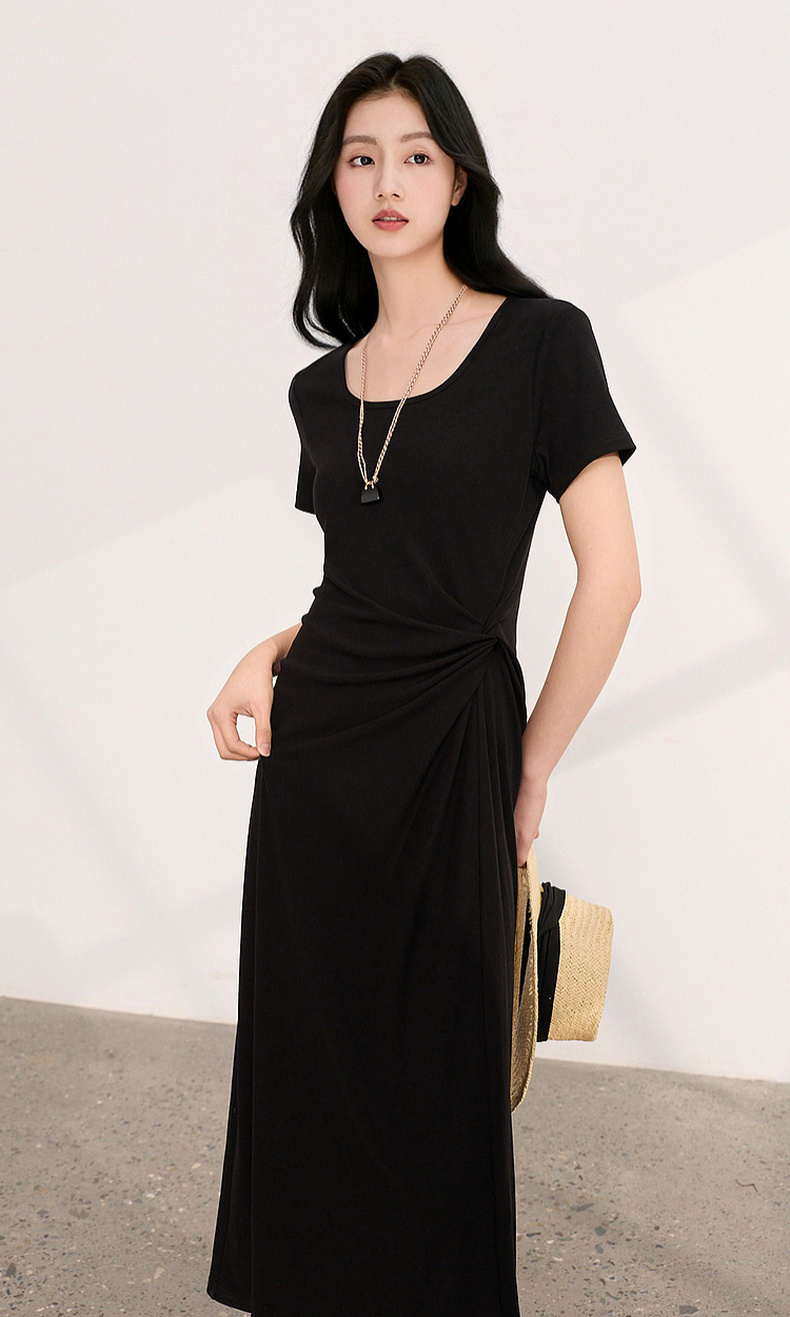 三彩2026夏季新款简约复古方领休闲直筒裙连衣裙短袖长裙小黑裙M