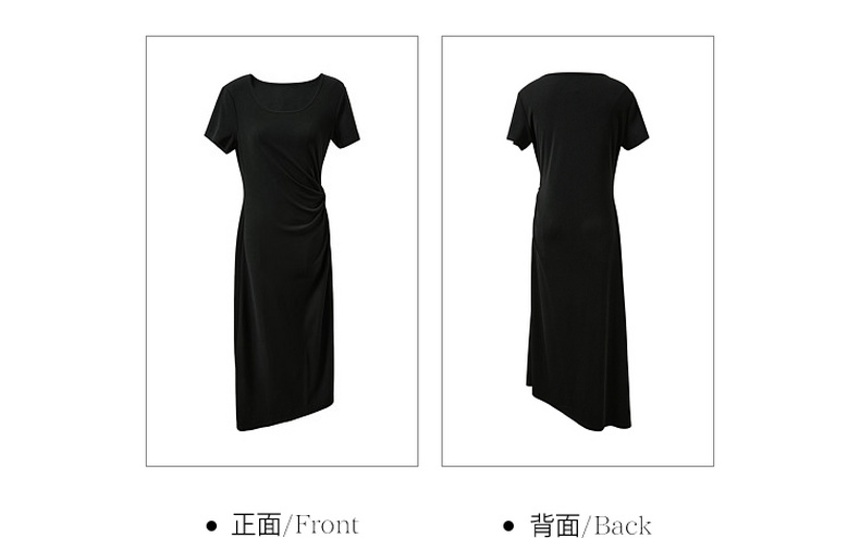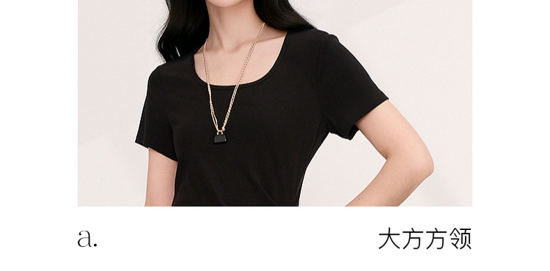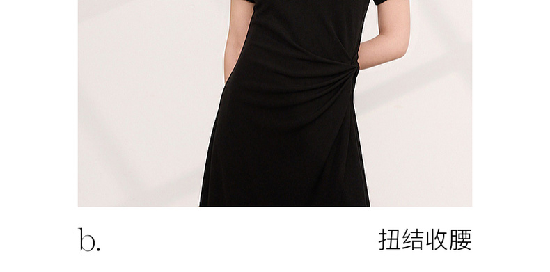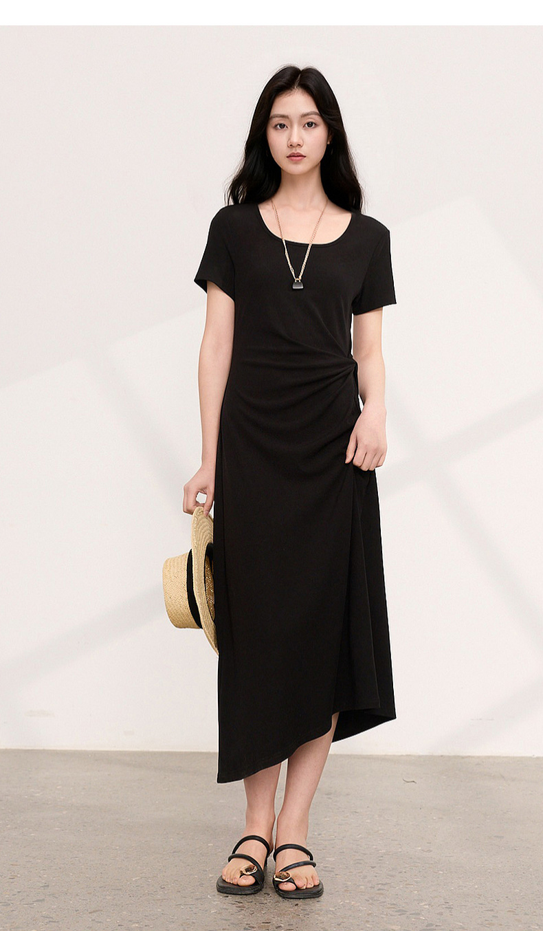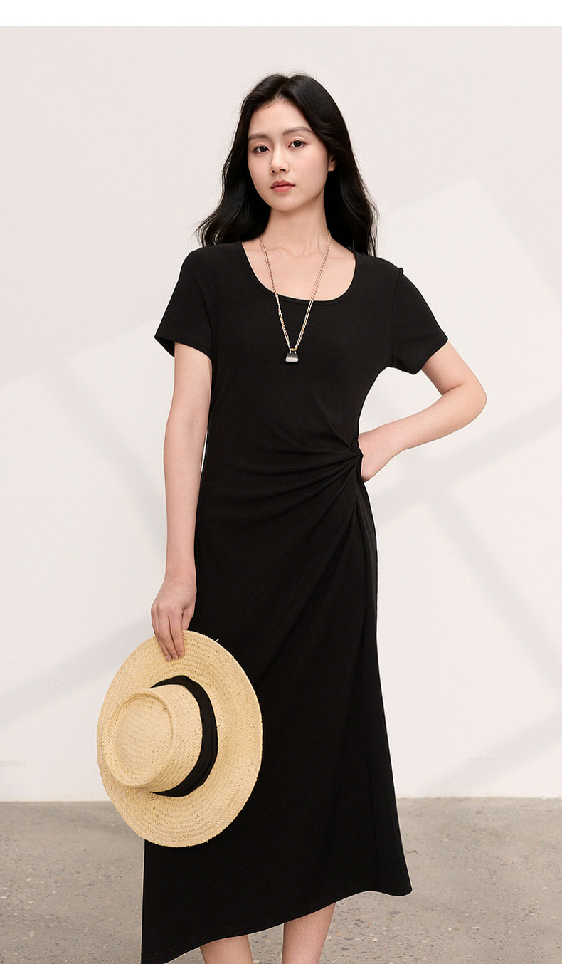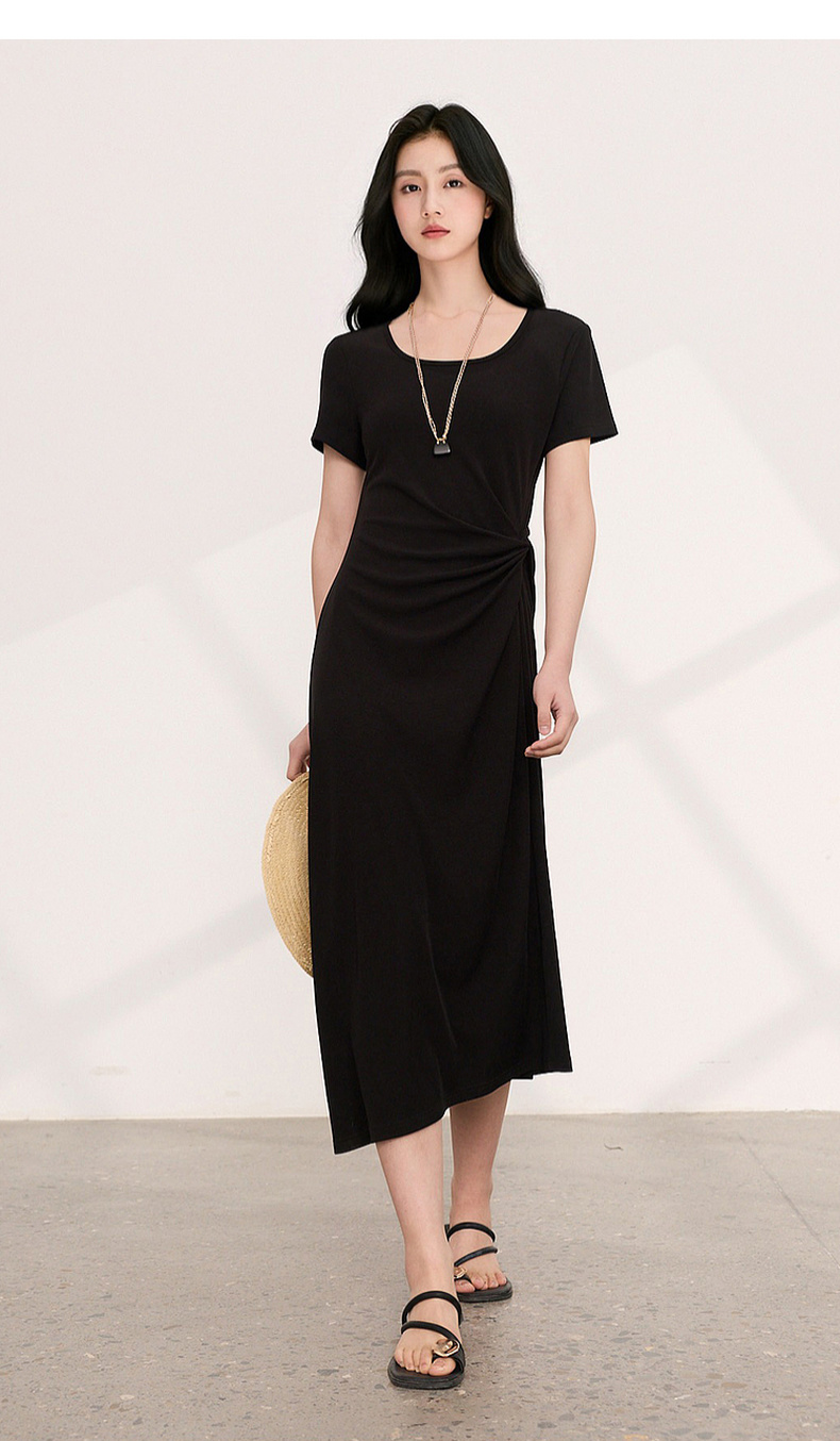 三彩2026夏季新款简约复古方领休闲直筒裙连衣裙短袖长裙小黑裙M