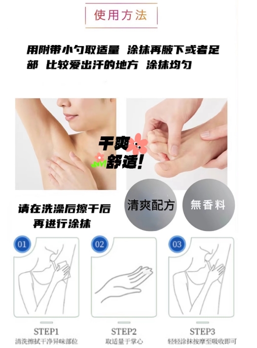 ● 请使用附赠的小勺取少量(珍珠粒大小)放在手指上,然后广泛涂在腋下易出汗部位,请在洗浴后干净干燥的皮肤上涂用本品。