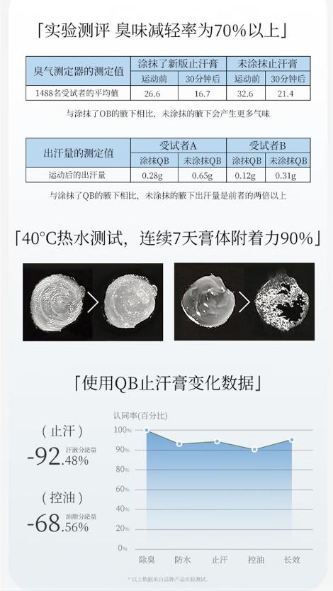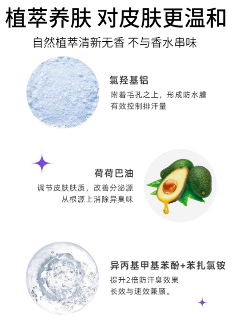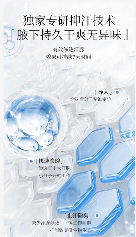 ● 日本核心净味技术,持久止汗干爽,透气不堵塞毛孔。珍贵植草及核心成分,去味效果可持续一周,40°高温也能抵挡。