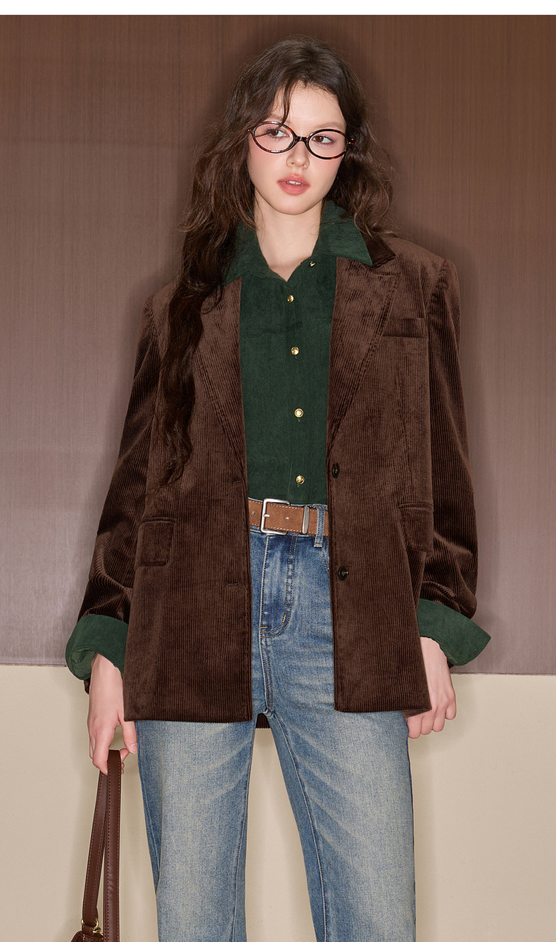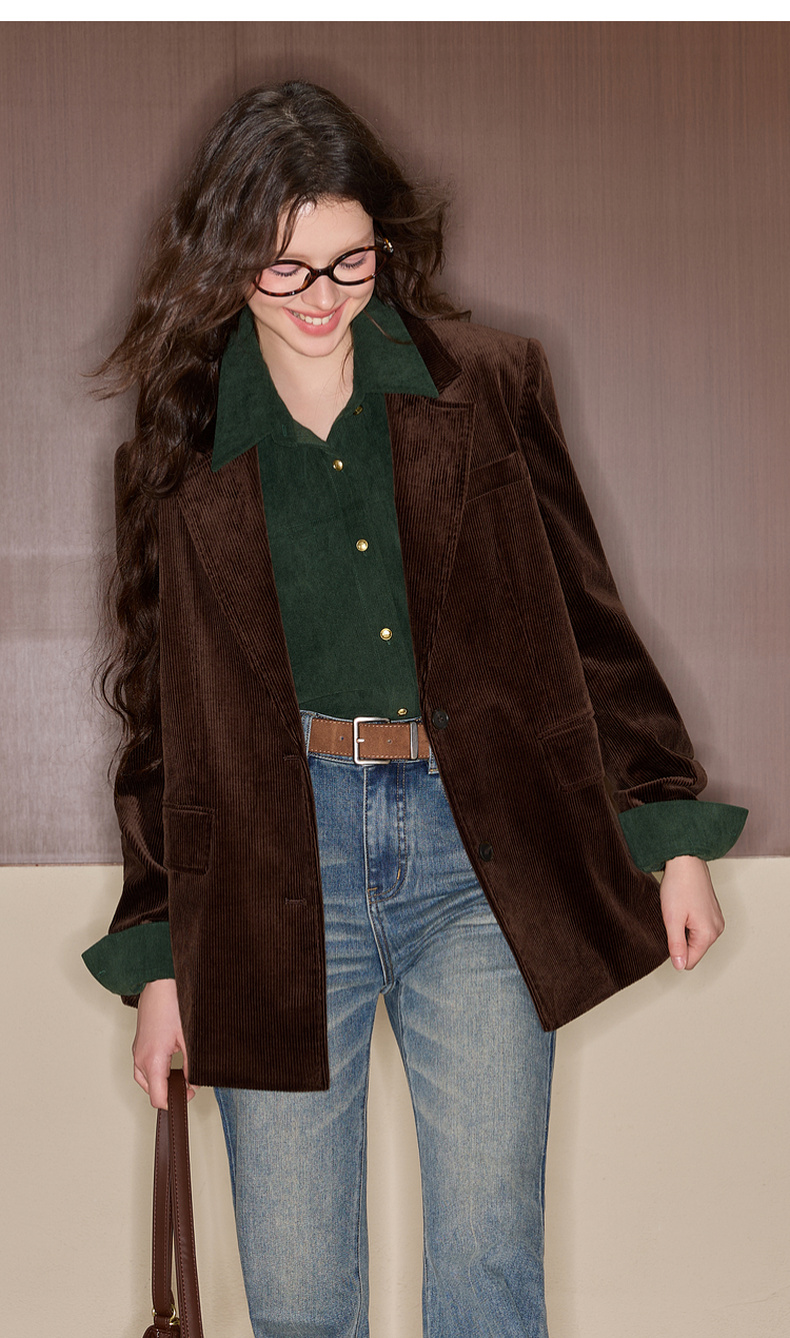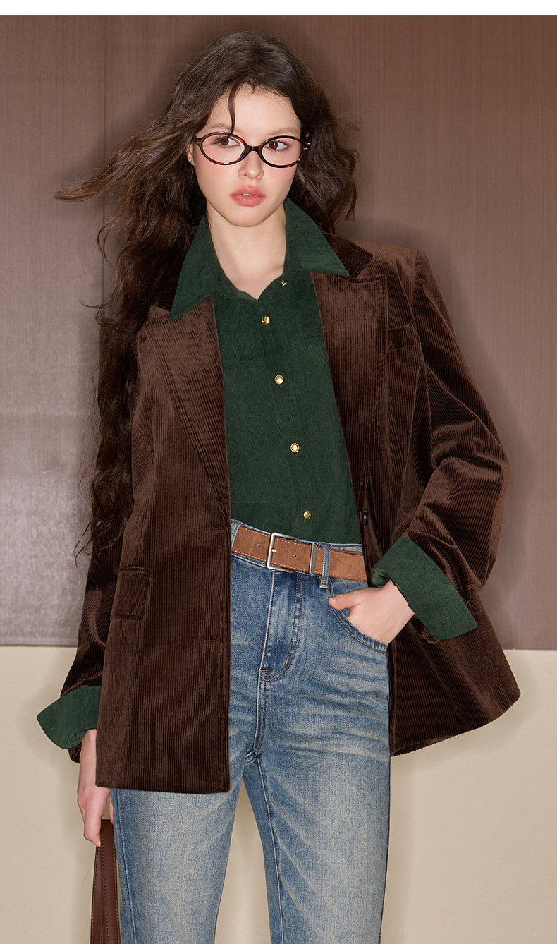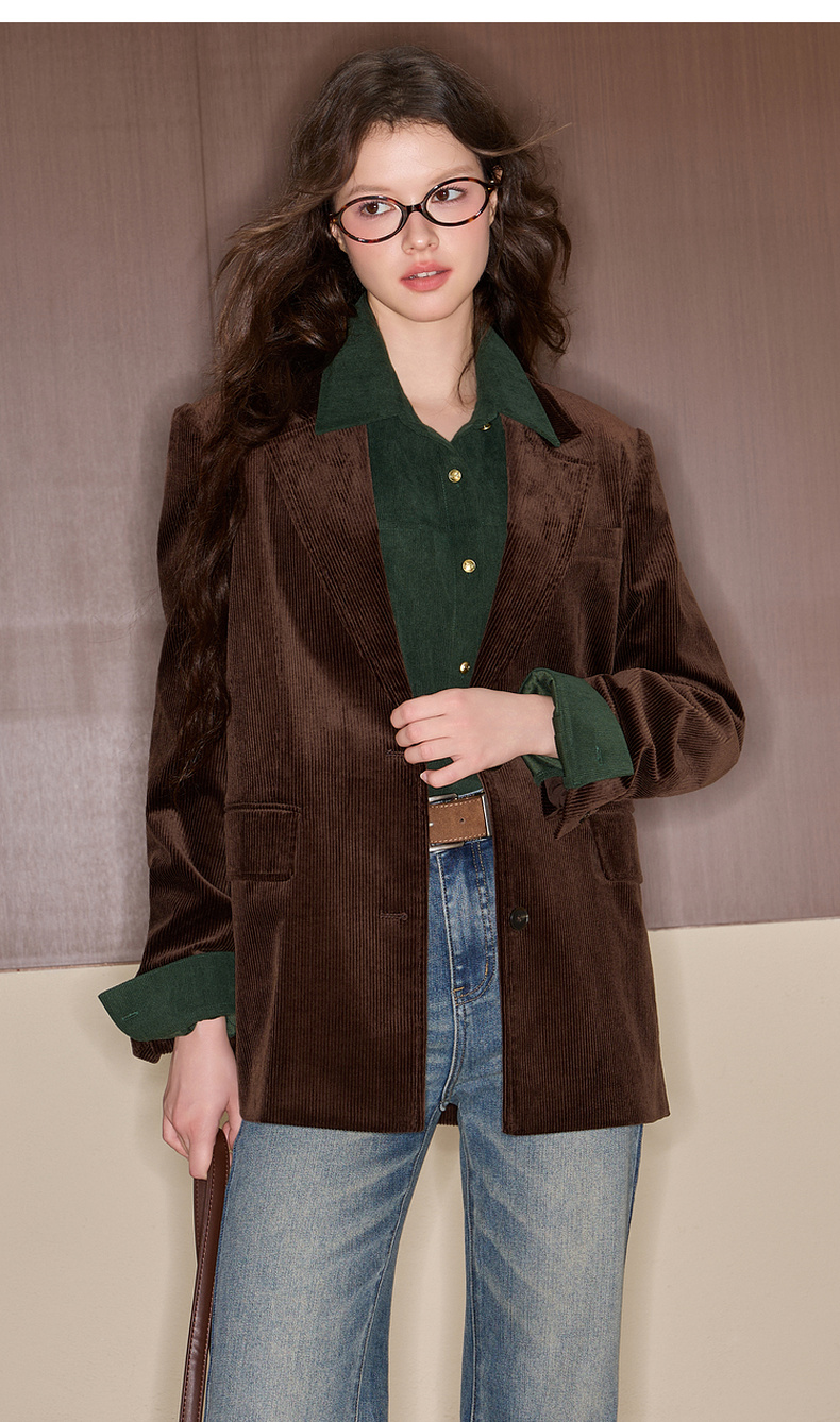 三彩独醒2025冬季新款灯芯绒西装外套正肩小西服复古通勤F