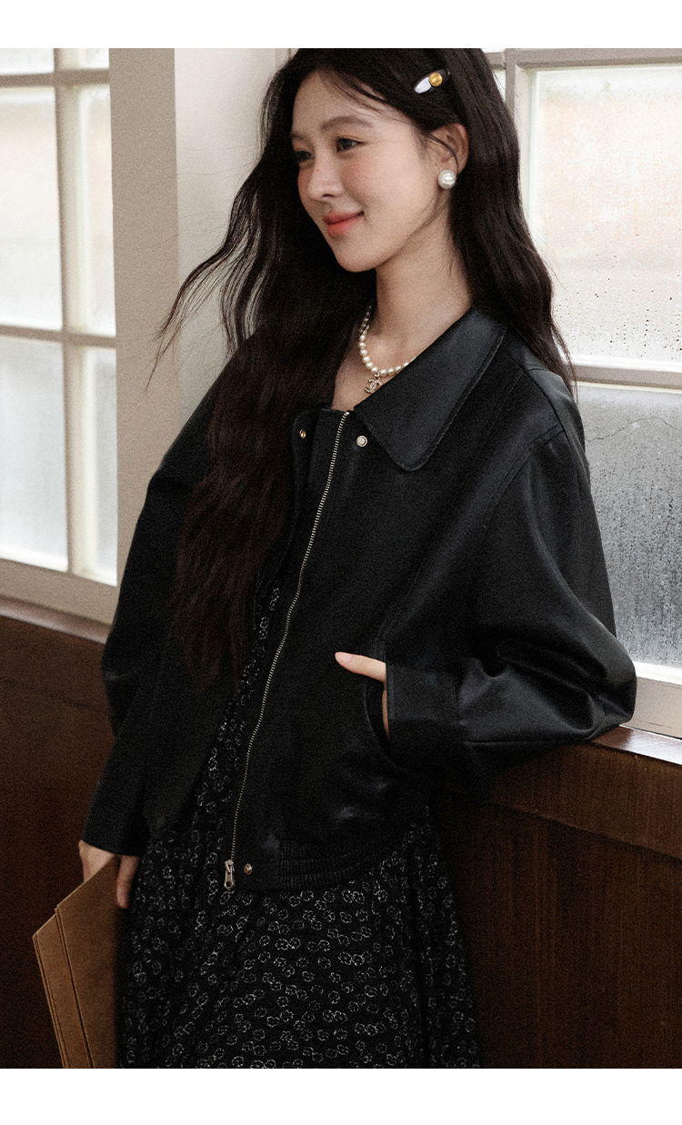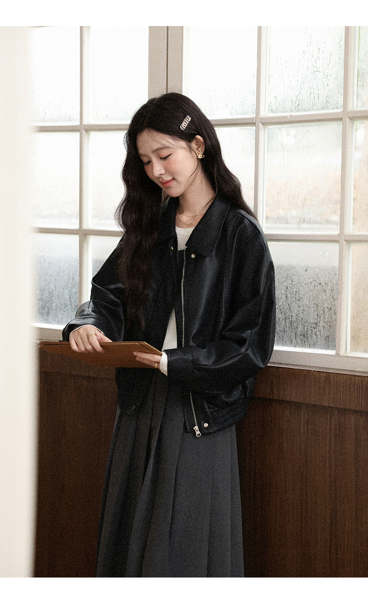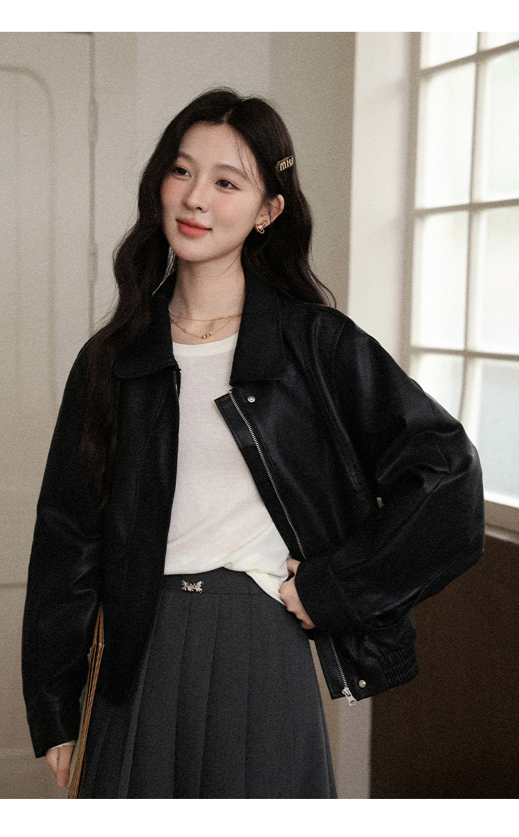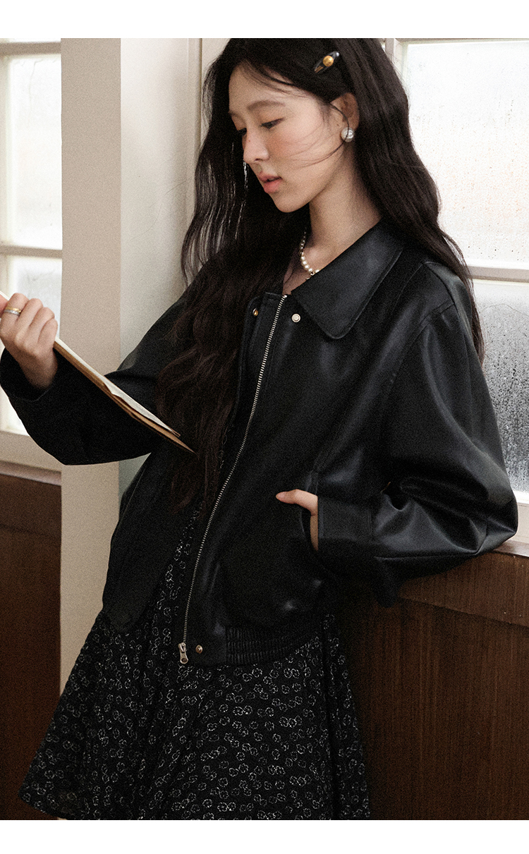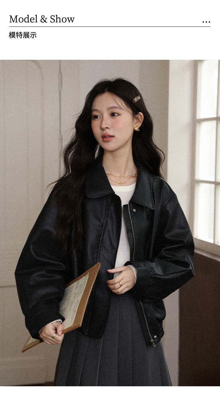 鹿向南「都市主角」高级感复古黑色皮衣外套女秋新款拉链翻领夹克