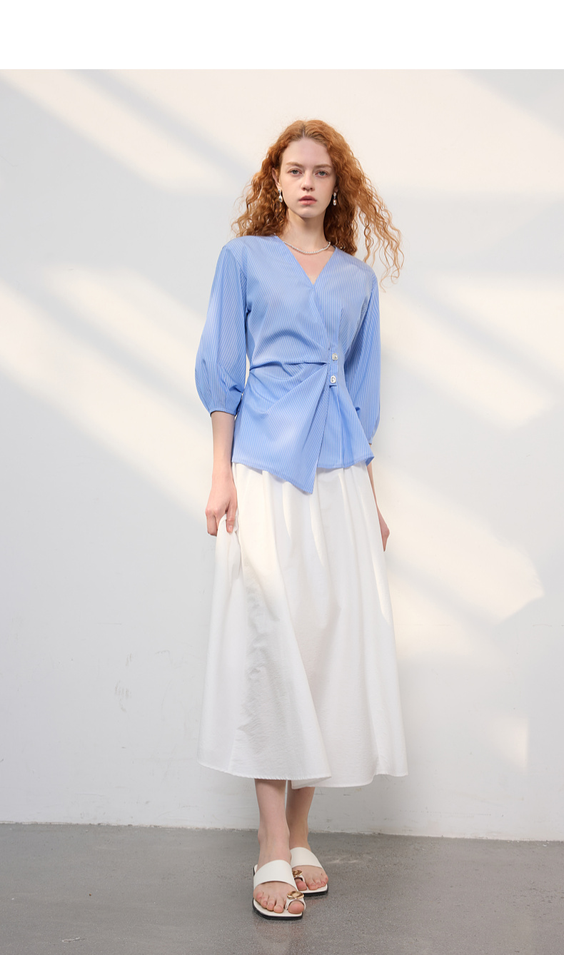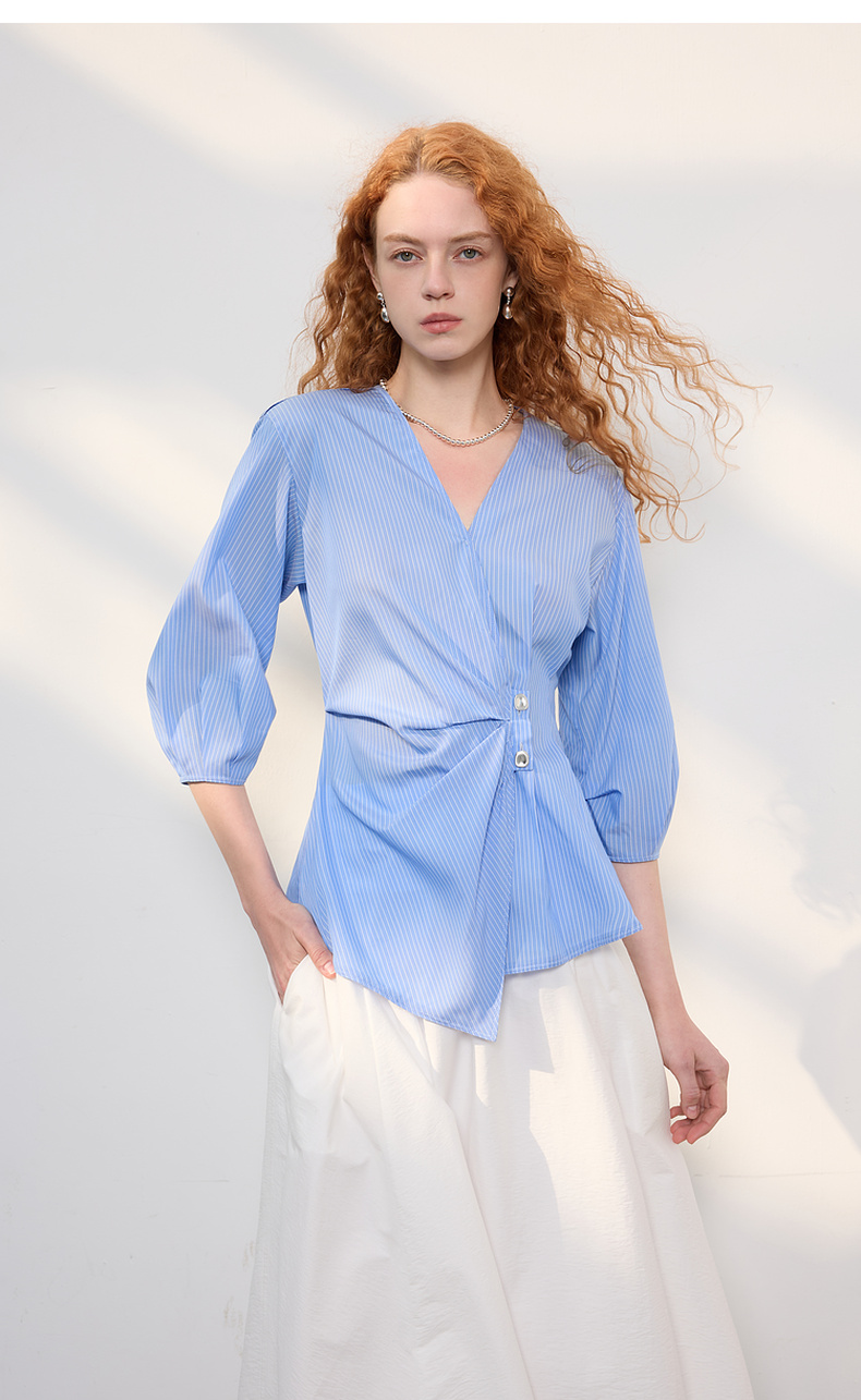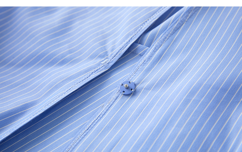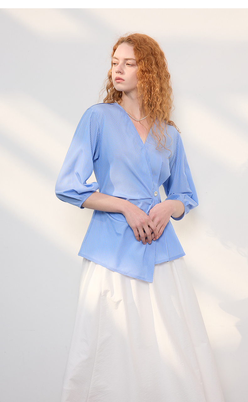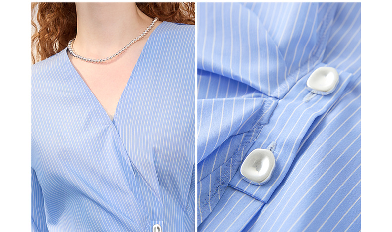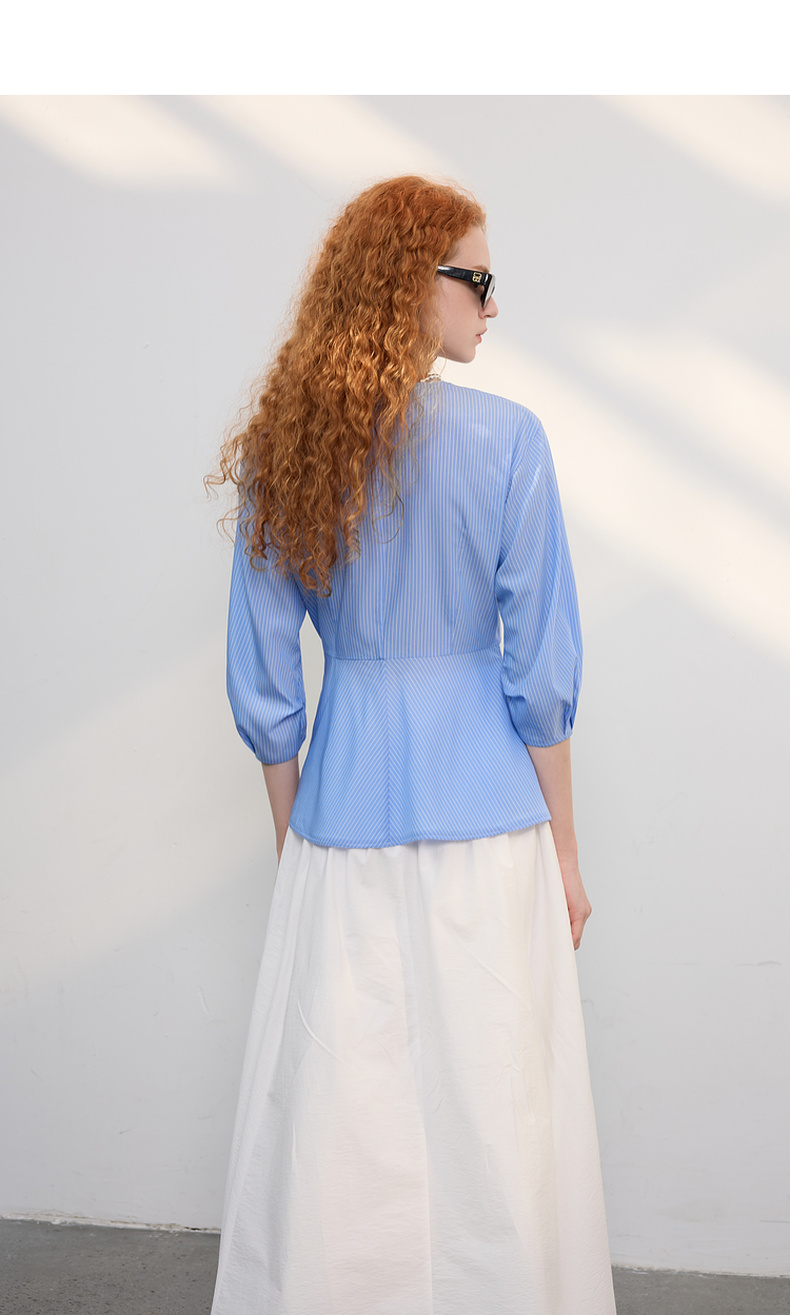 三彩2025夏季新款法式收腰V领衬衫醋酸莱赛尔条纹衬衣气质S