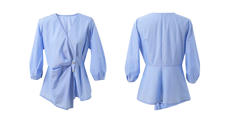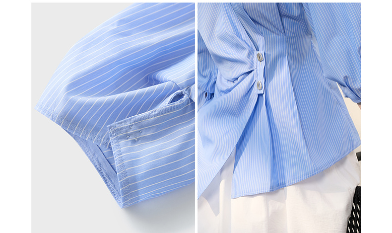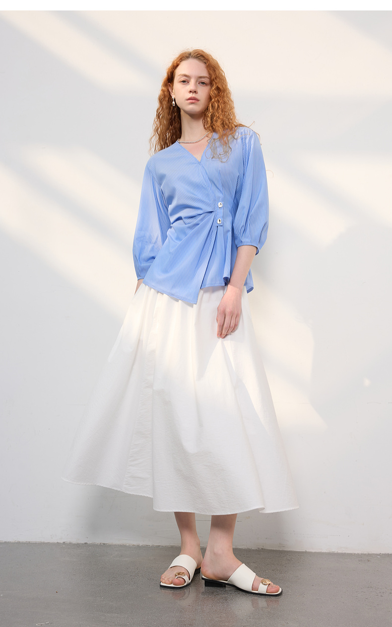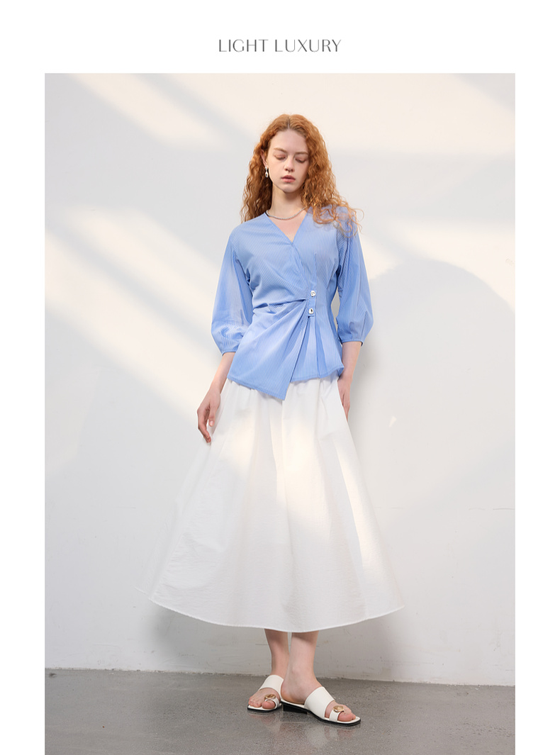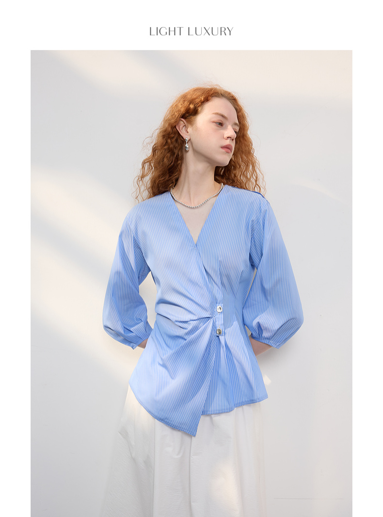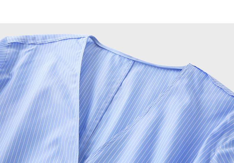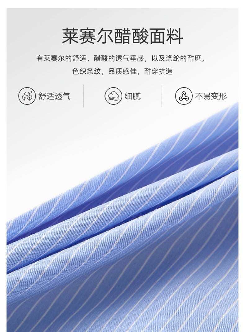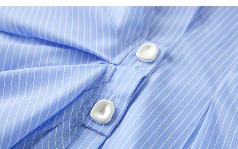 三彩2025夏季新款法式收腰V领衬衫醋酸莱赛尔条纹衬衣气质S