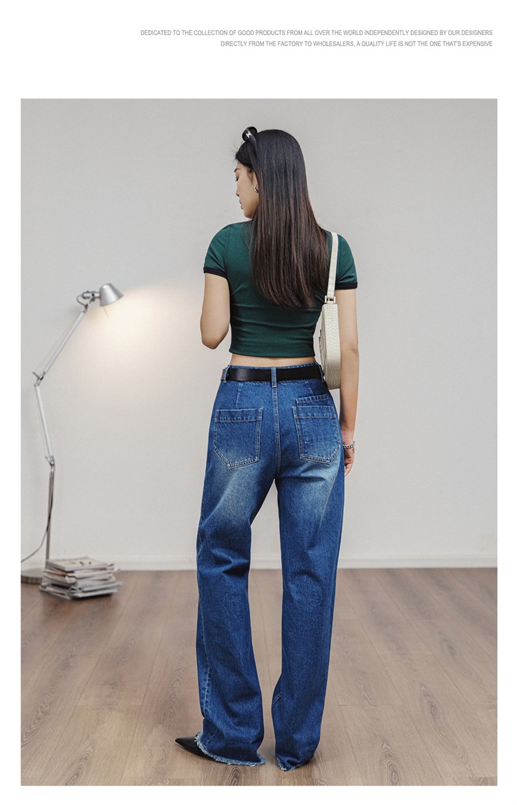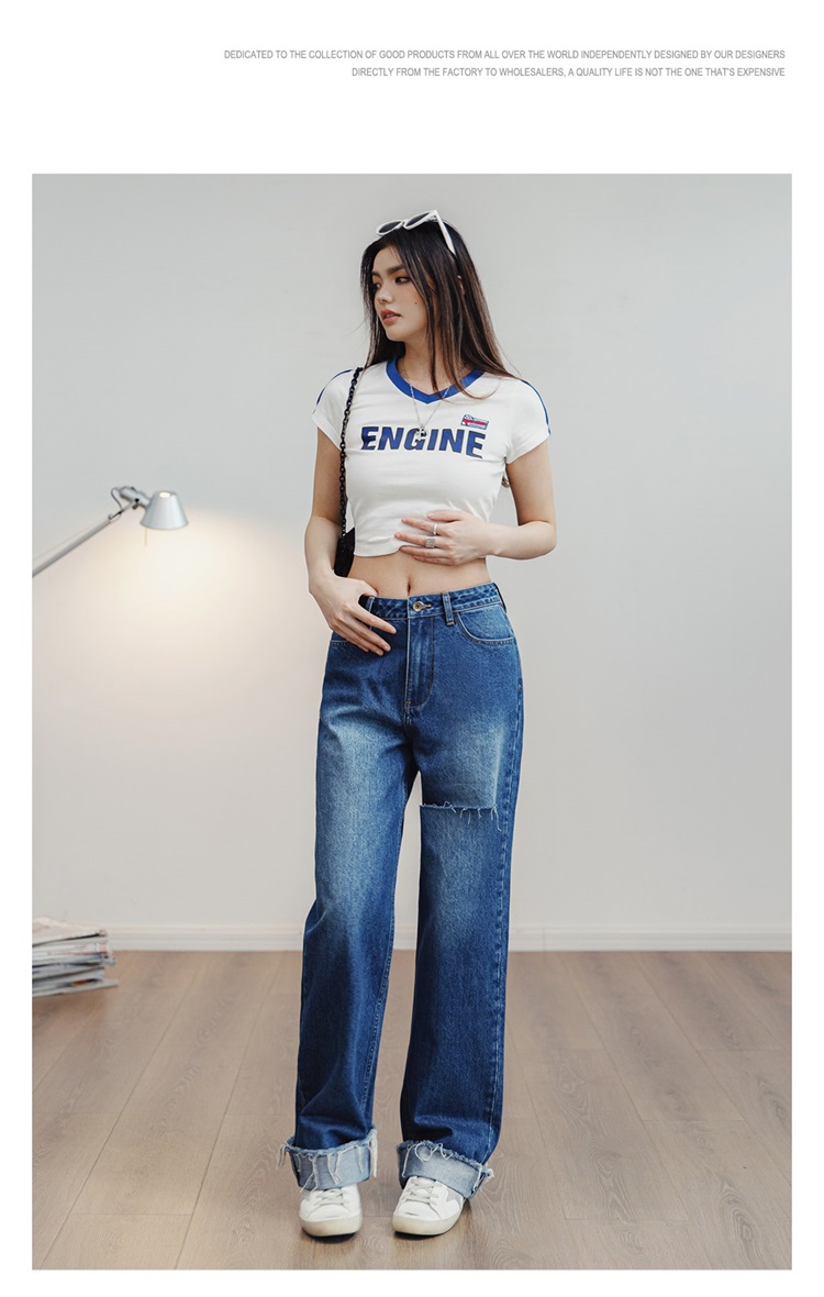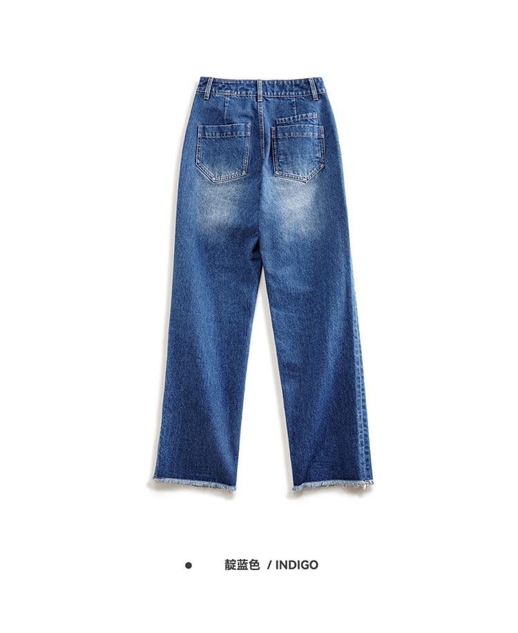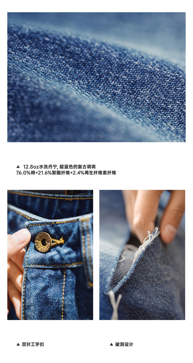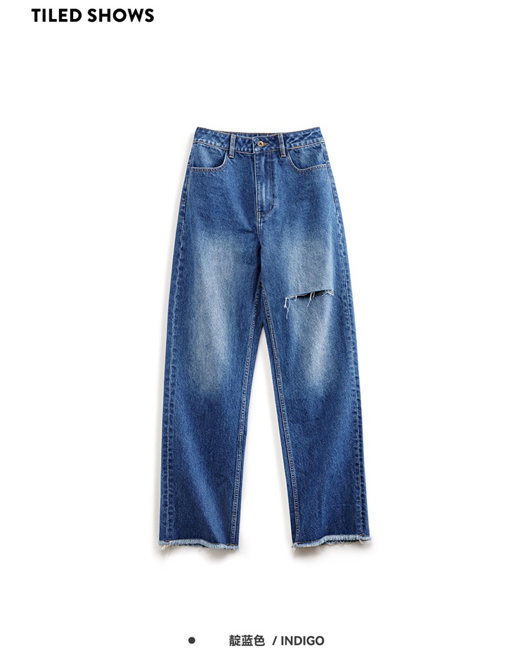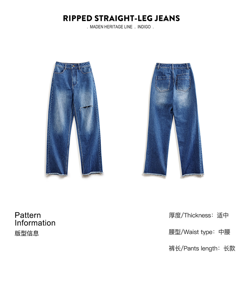 马登破洞丹宁水洗牛仔裤复古直筒裤子宽松休闲百搭垂感拖地长裤女