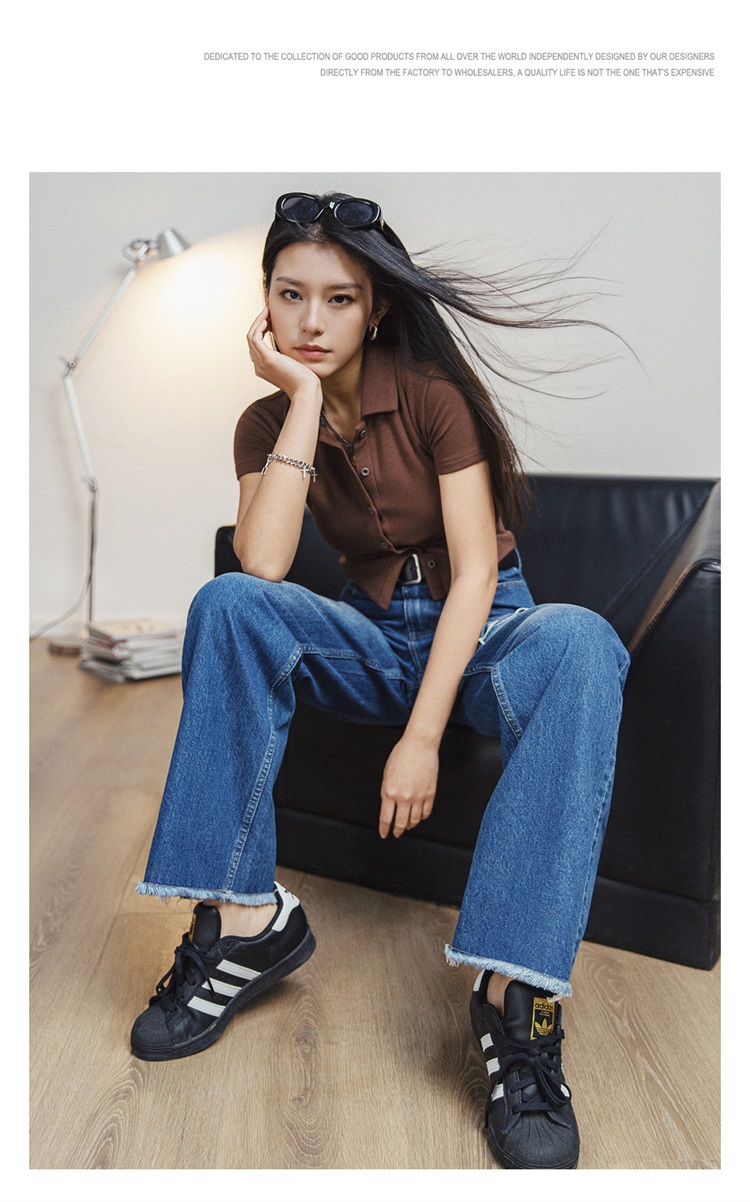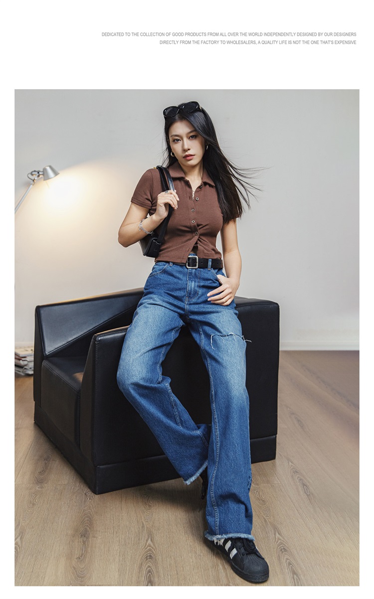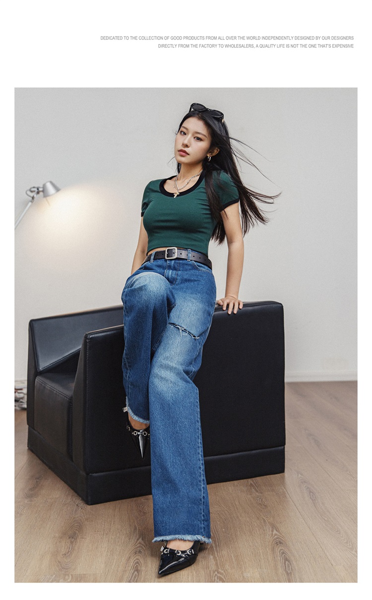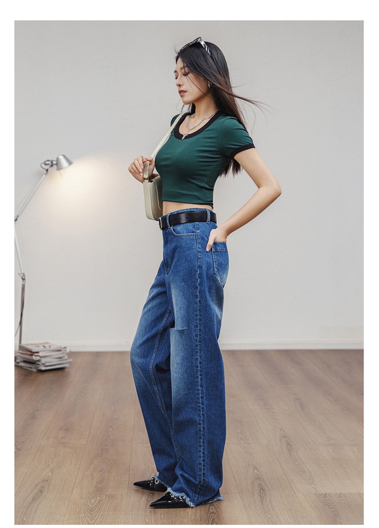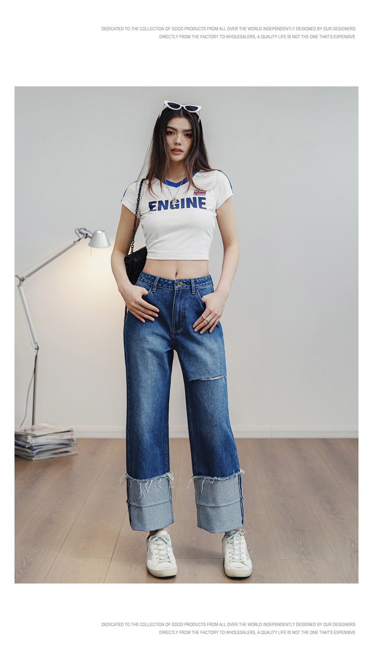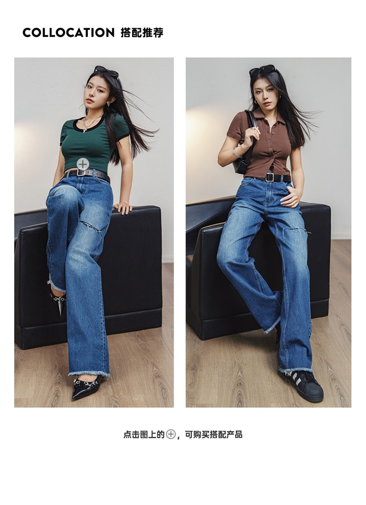 马登破洞丹宁水洗牛仔裤复古直筒裤子宽松休闲百搭垂感拖地长裤女