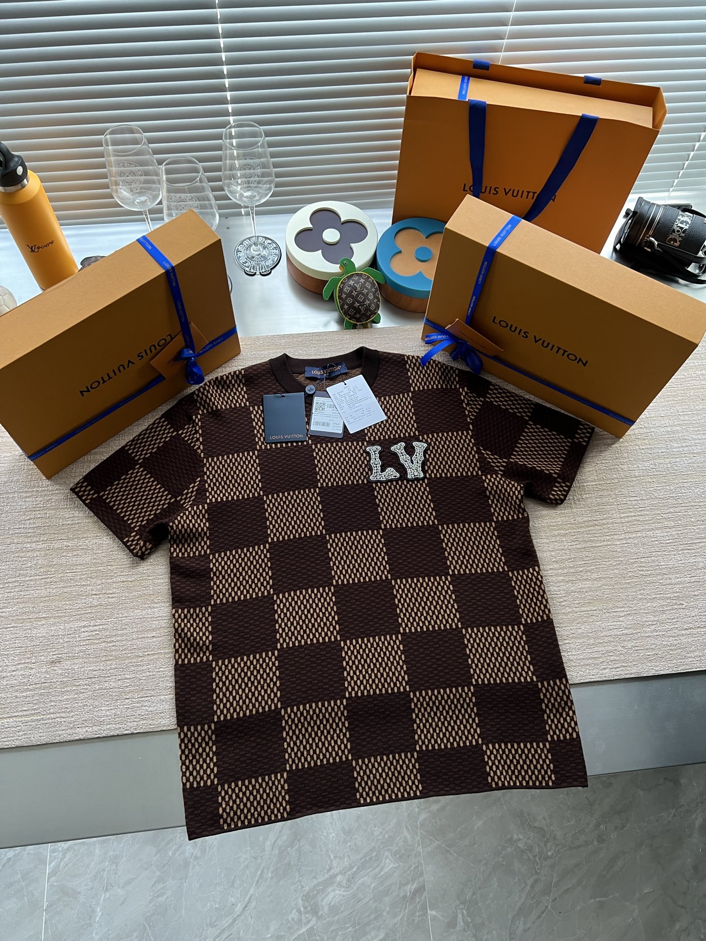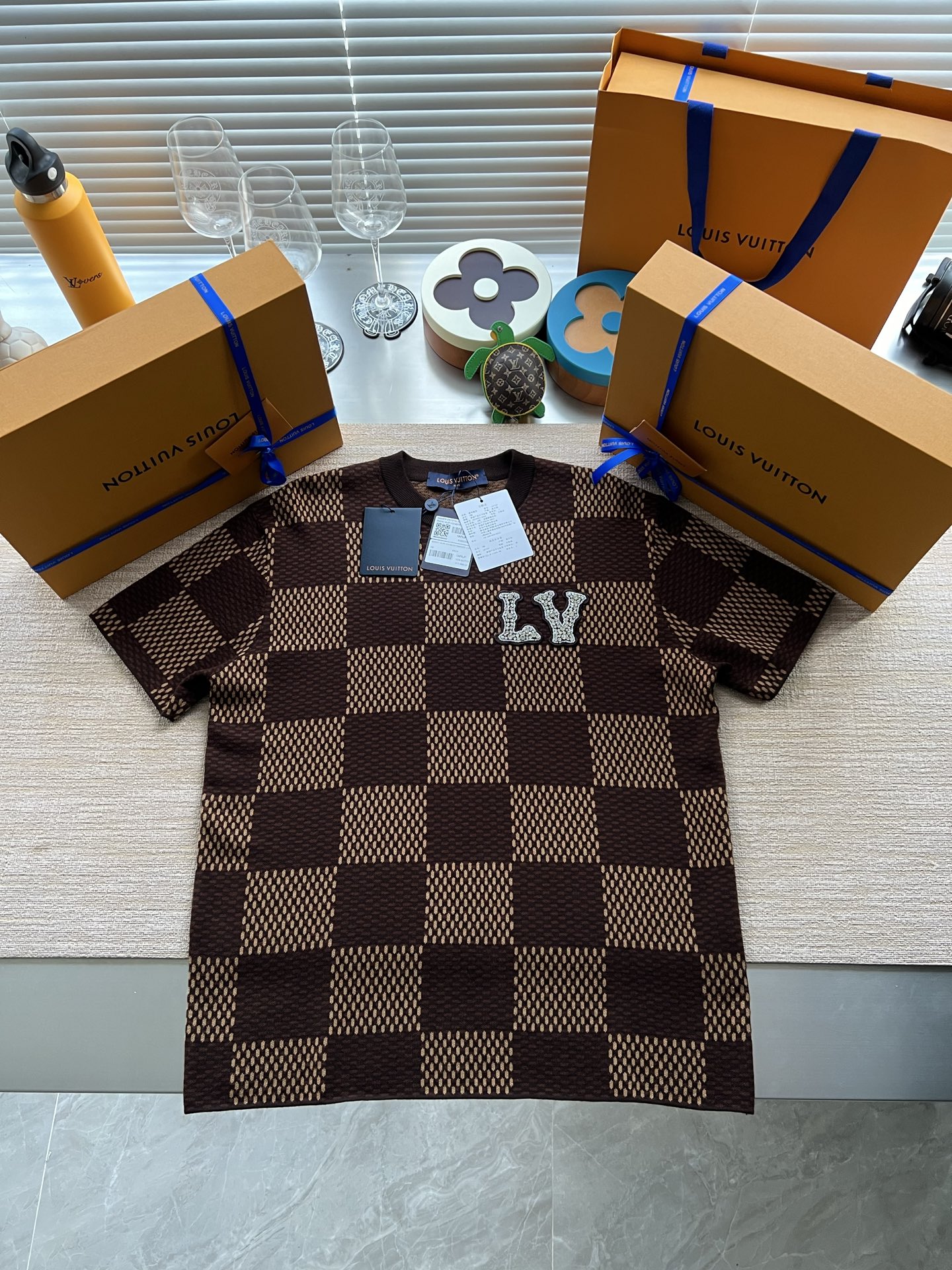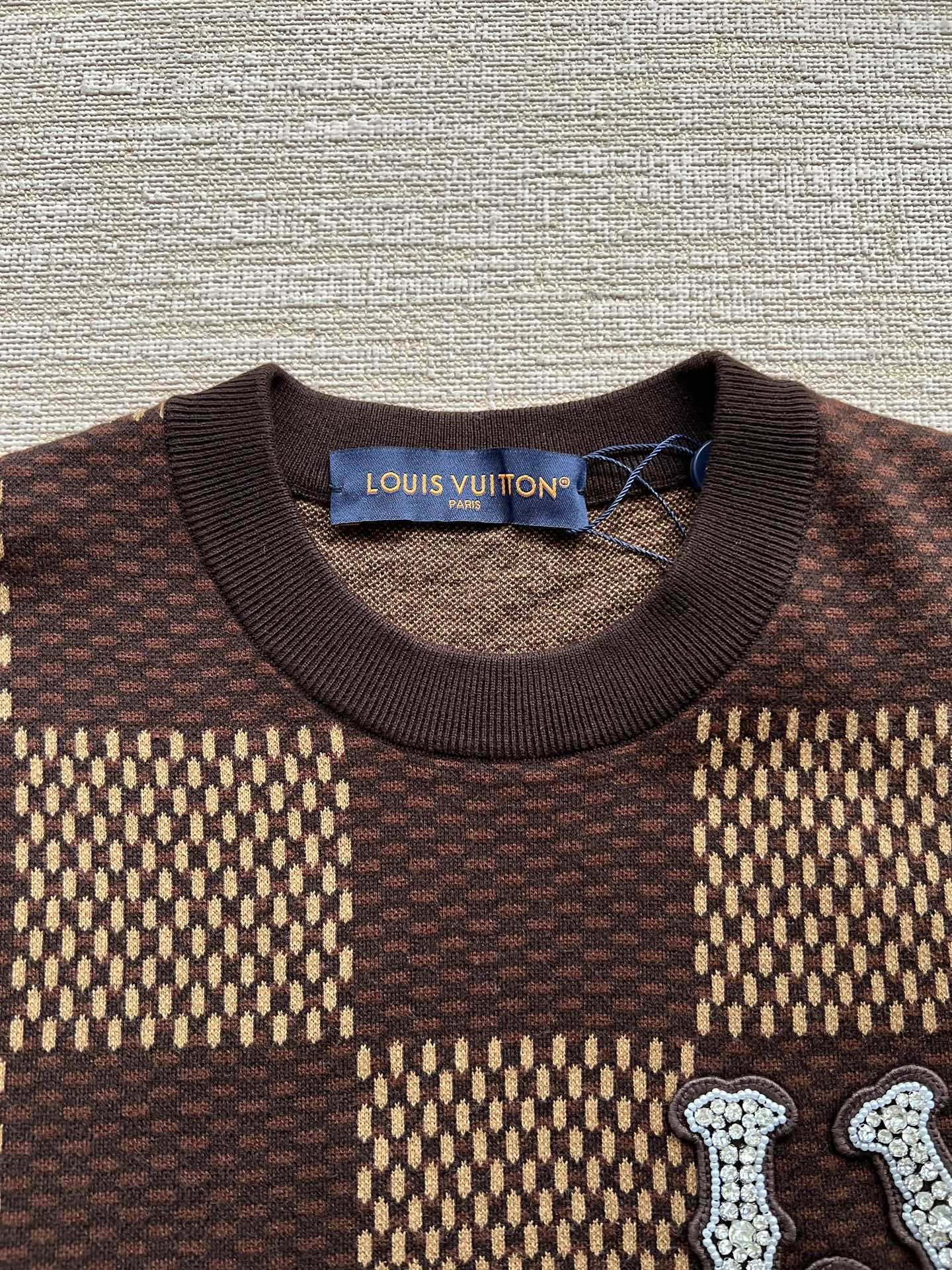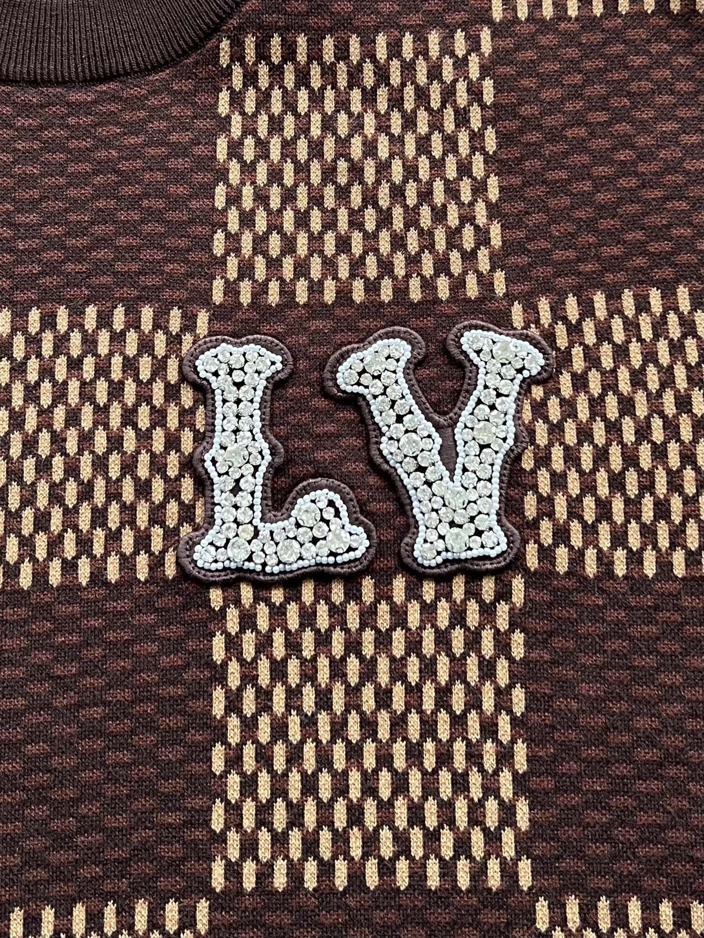 Louis Vuitton25ss镶钻logo棋盘格针织短袖‼️整件衣服11400购买ZP拆解打造,采用定制棉质针织面料,做到100%全棉进口纱线,胸前刺绣LV字母水晶刺绣贴饰,定织标志性罗纹领口,超紧密度局部编织,真正做到1:1copy 码数:XS S M L