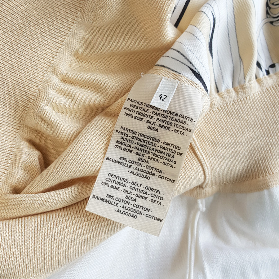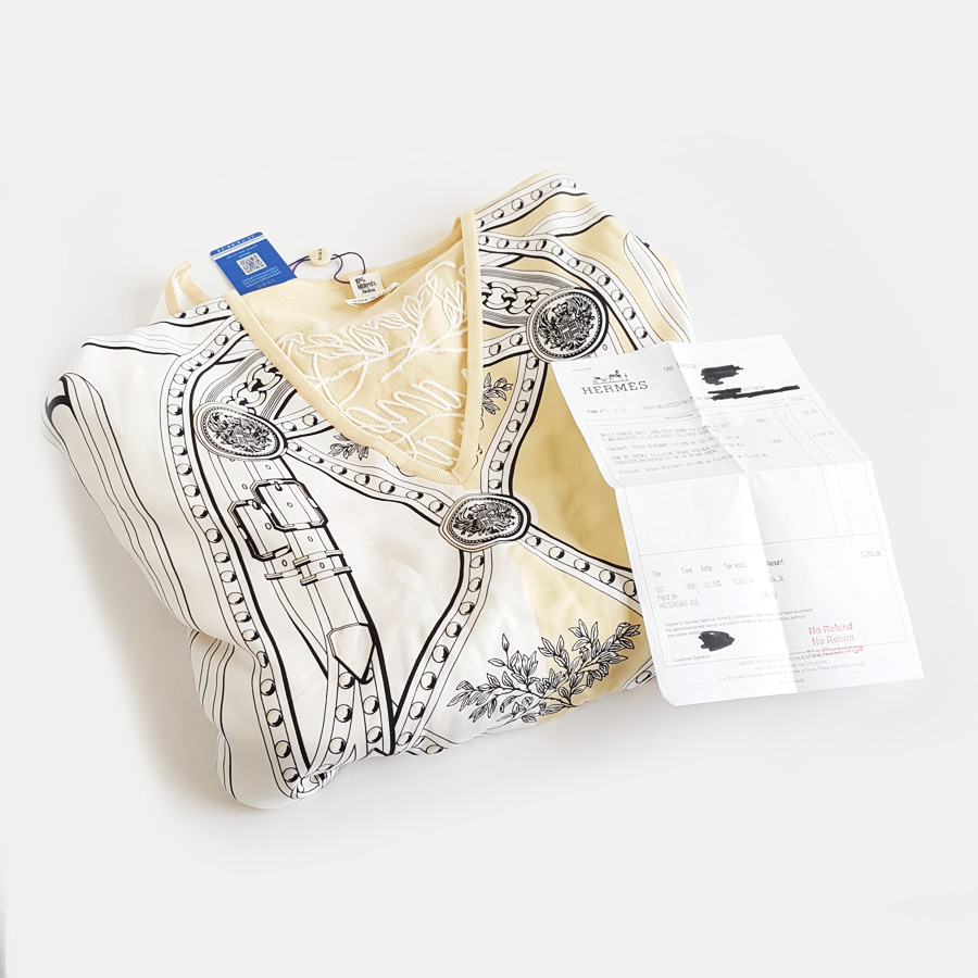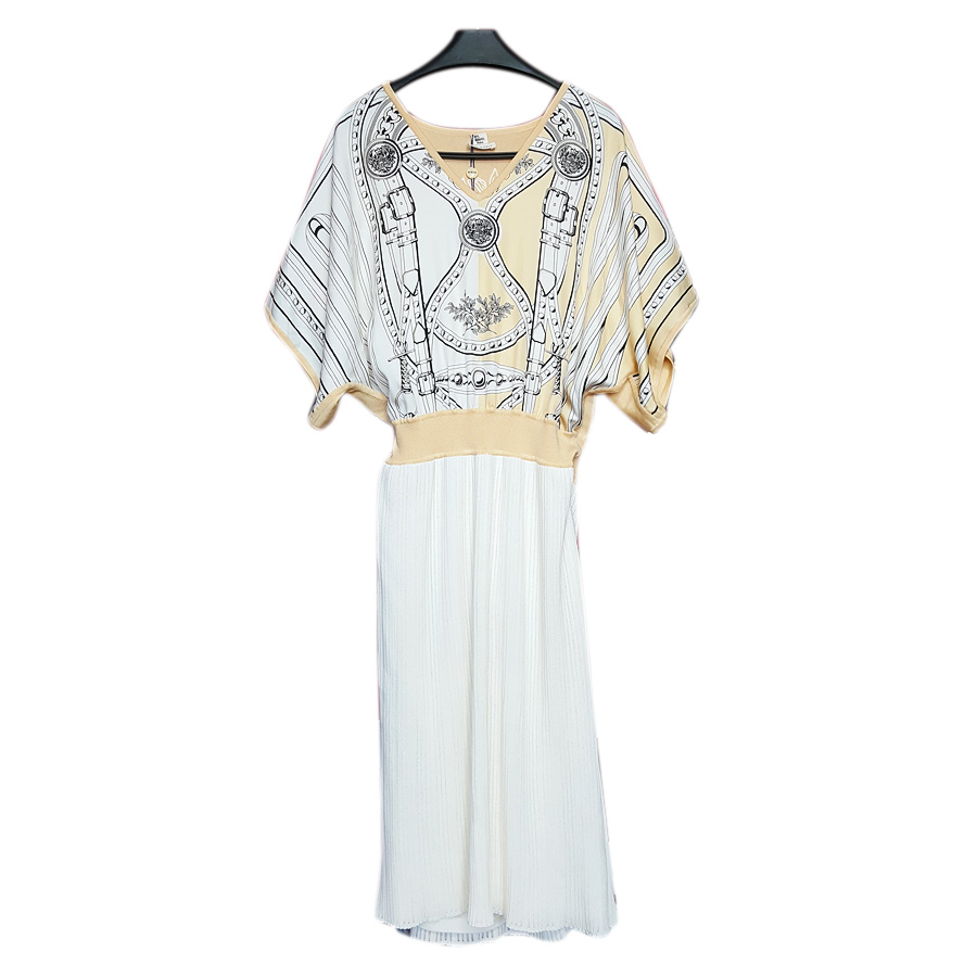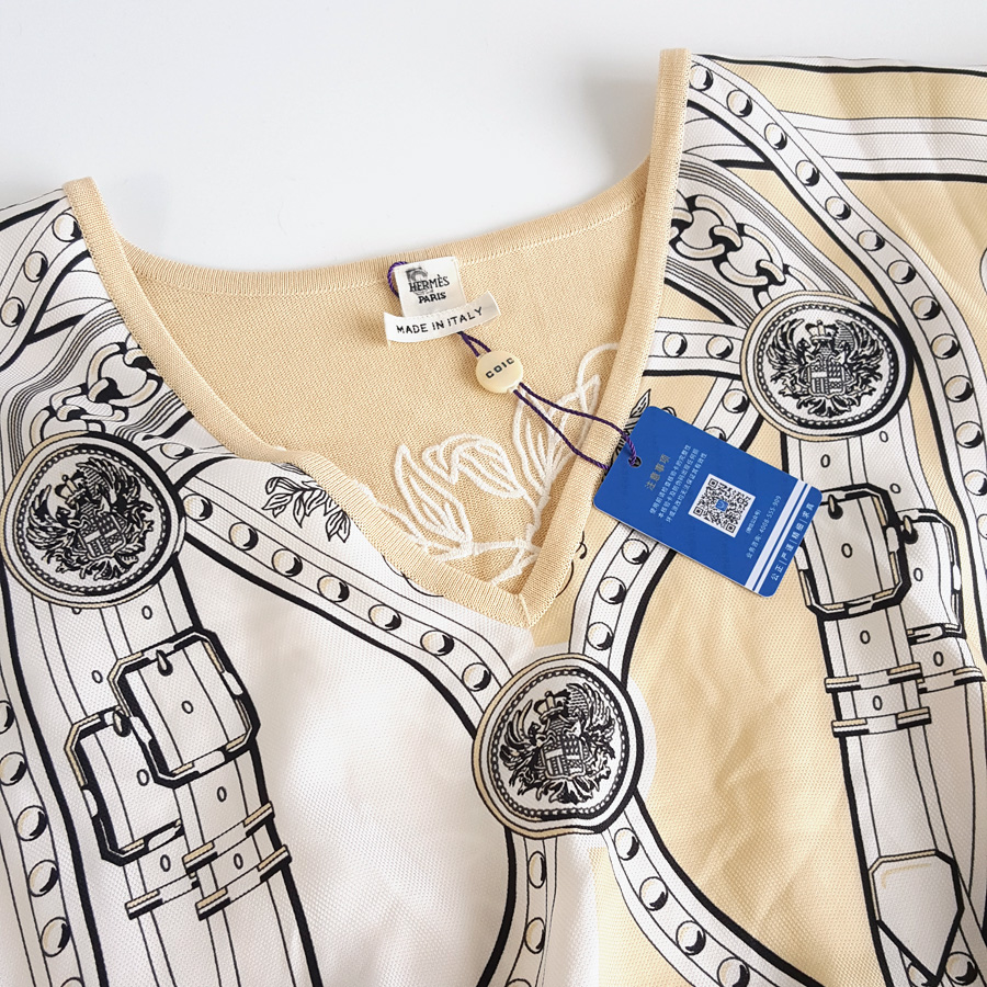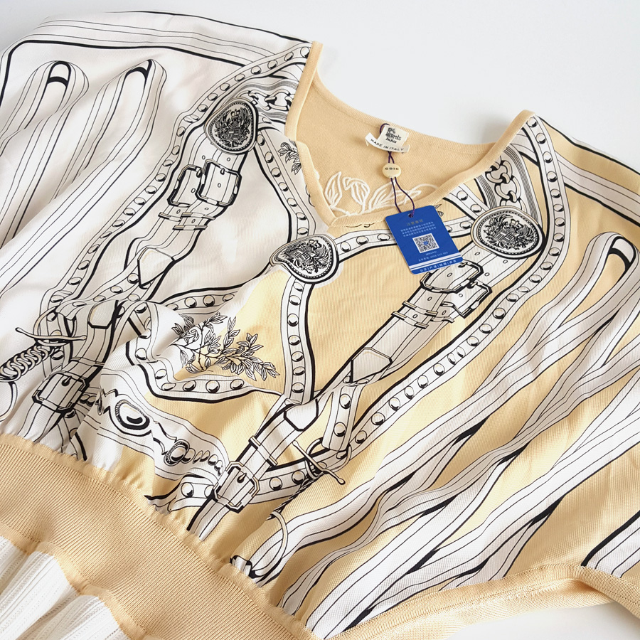 【95新】Hermes爱马仕浅黄拼白色短袖印花twillaine连衣裙长裙女士现售价:4700!121124TJ09