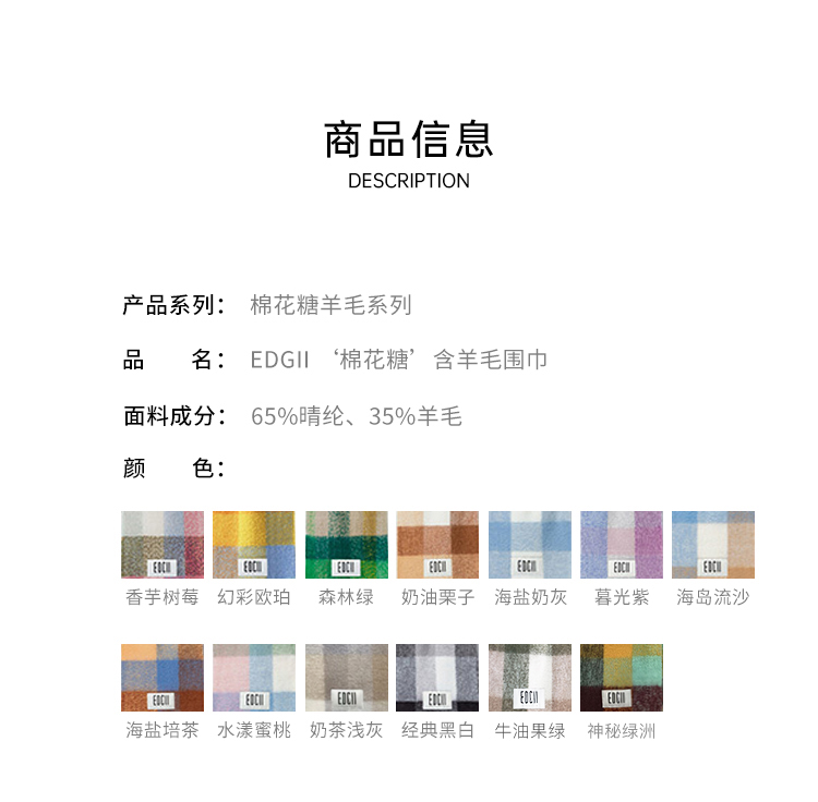 品名:EDGII棉花糖羊围巾拼色格纹柔软蓬松围巾 发货地:浙江 发货时间:下单后一般48-72小时内发货(周末、节假日除外) 发货快递:中通快递(以实际发货为准,暂不支持指定快递) 运费政策:该商品全国部分地区包邮(新疆、西藏需补差运费15元/件,港澳台不发货,请知悉) 售后政策:本品包装配件完整、未拆封、不影响二次销售支持7天无理由退换货(无运费险),拦截拒收扣费6元/单,产品退回请勿损坏包装,原包装退回哦,如下单备注礼盒的订单,收到的退货包装破损或未退回,需要扣费8元。请知悉 温馨提醒:因显示器像素差异与拍摄灯光原因,图片与实物颜色可能存在些许差异,具体请以收到实物为准。 |