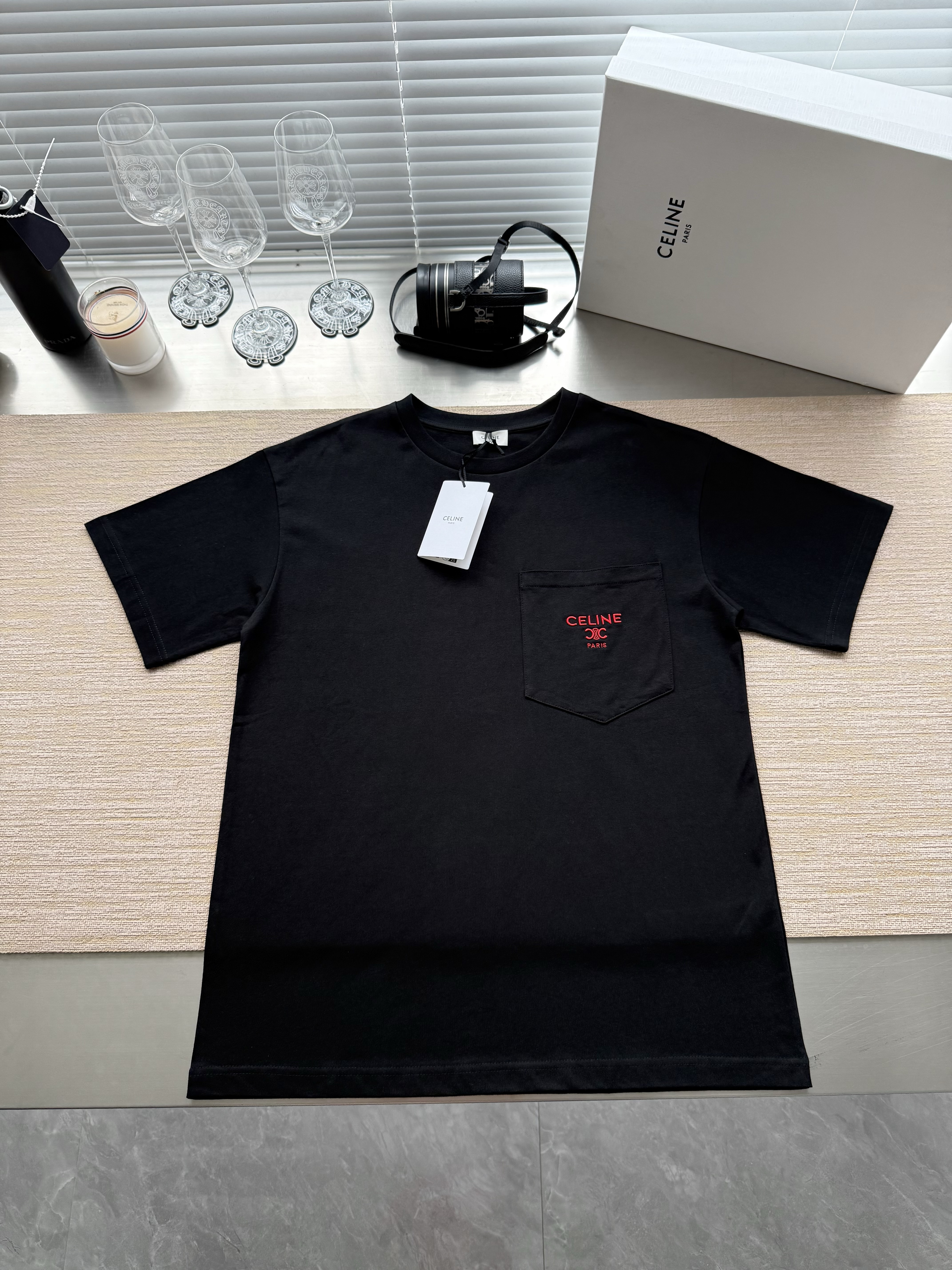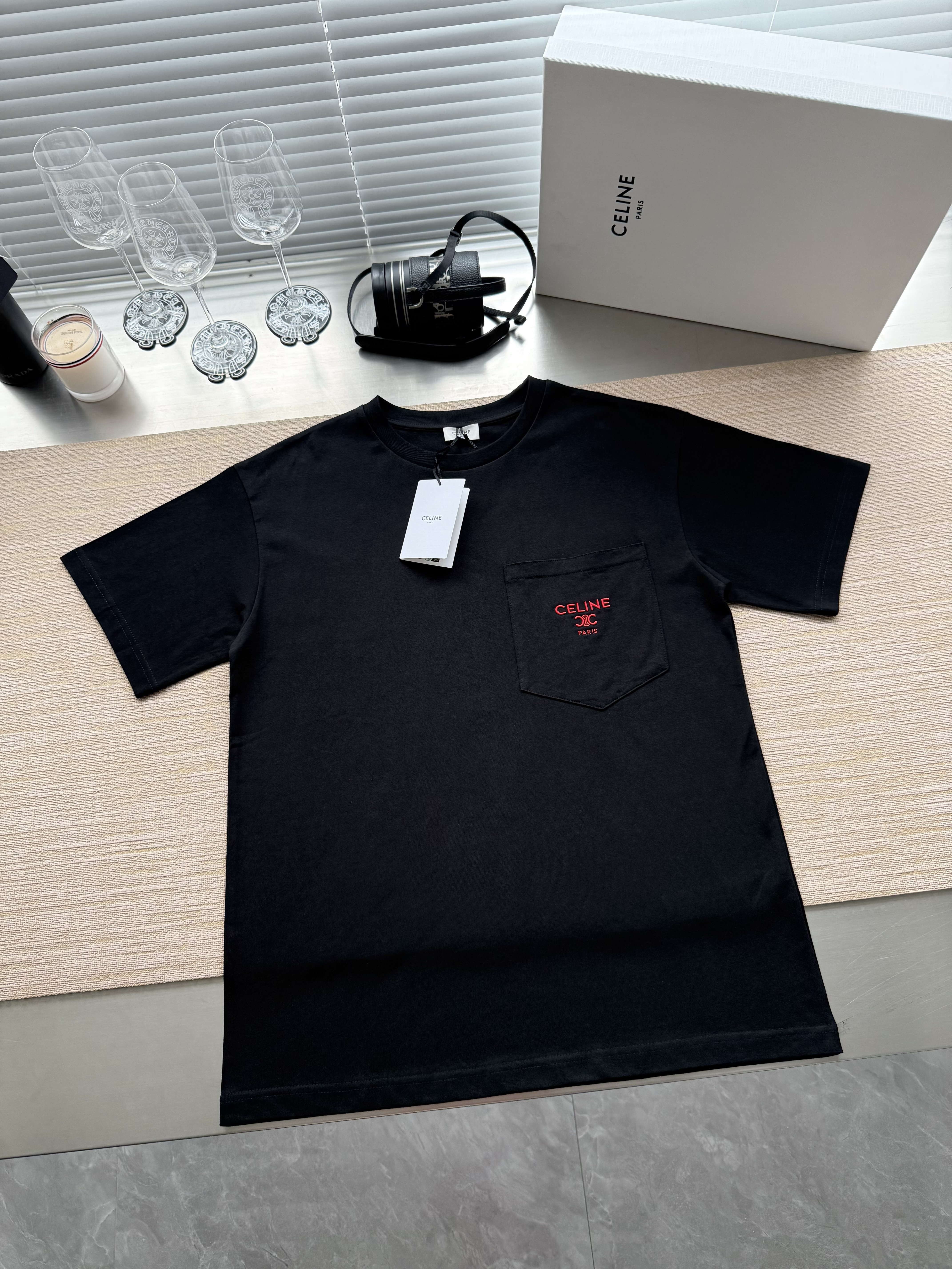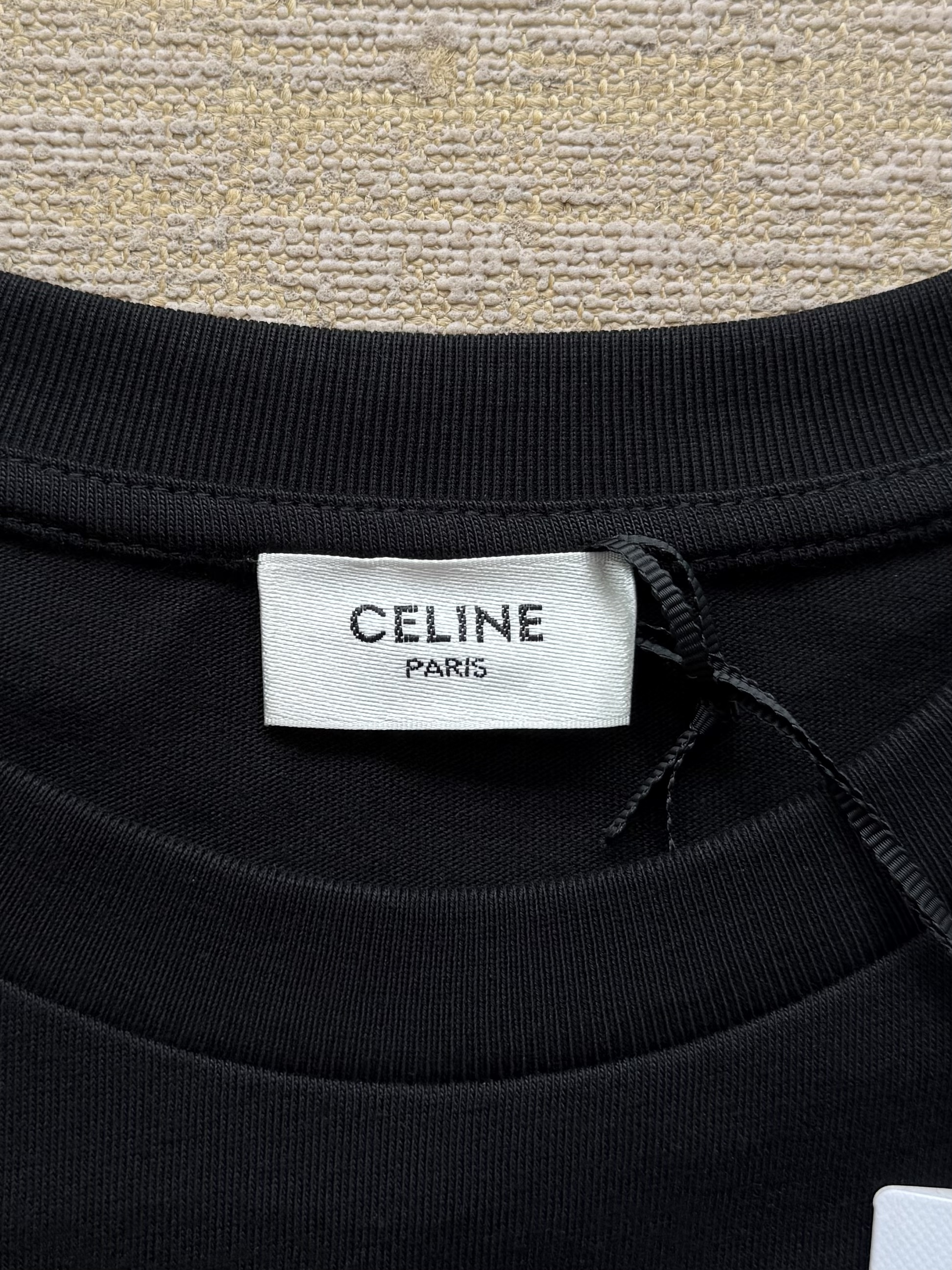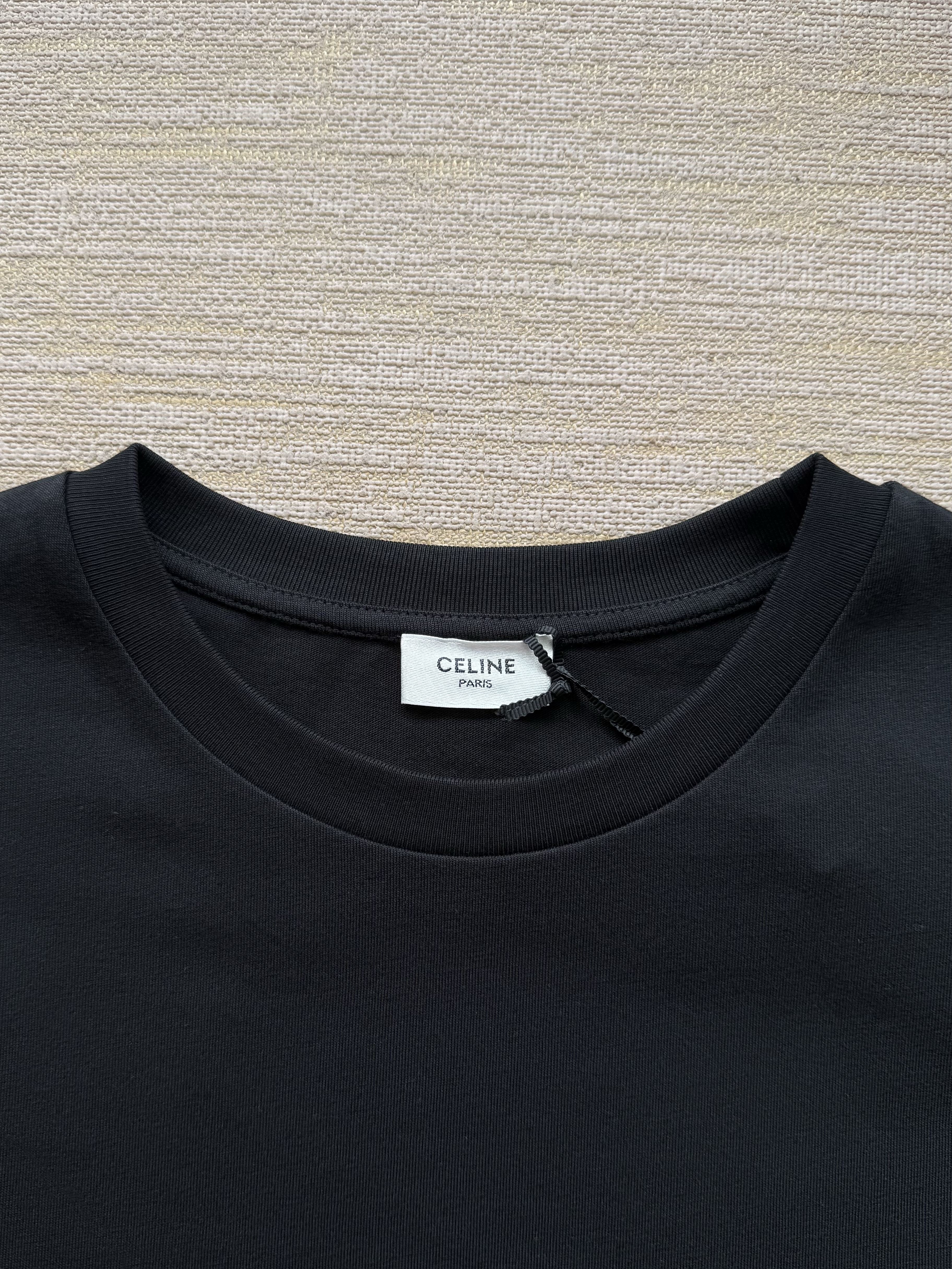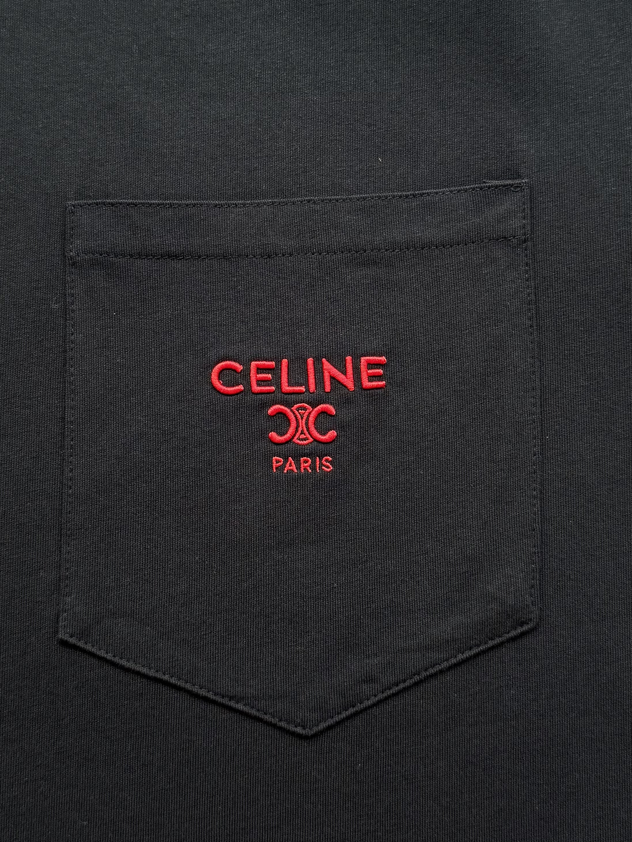 Celine 25ss字母标识凯旋门刺绣短袖T恤‼️整件衣服4540购买ZP拆解打造,定制定染黑色纯棉面料,做到100%全棉进口纱线,意大利进口制造,定织标志性罗纹领口,胸前贴袋设计,饰以撞色字母标识凯旋门刺绣,袖口 下摆双层锁边超高密度走线,真正做到1:1copy 闭眼入 码数:XS S M L