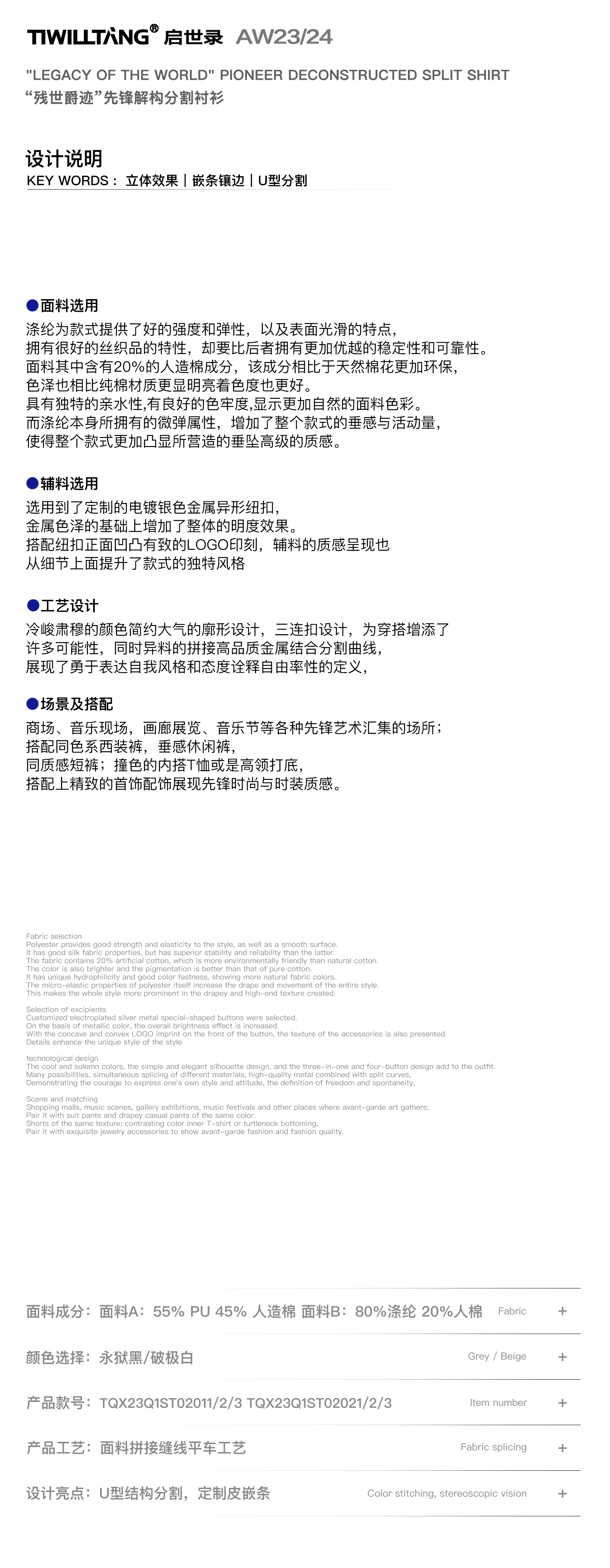 启世录TIWILLTANG“境异拟象”抗皱透气异形长袖衬衫套装