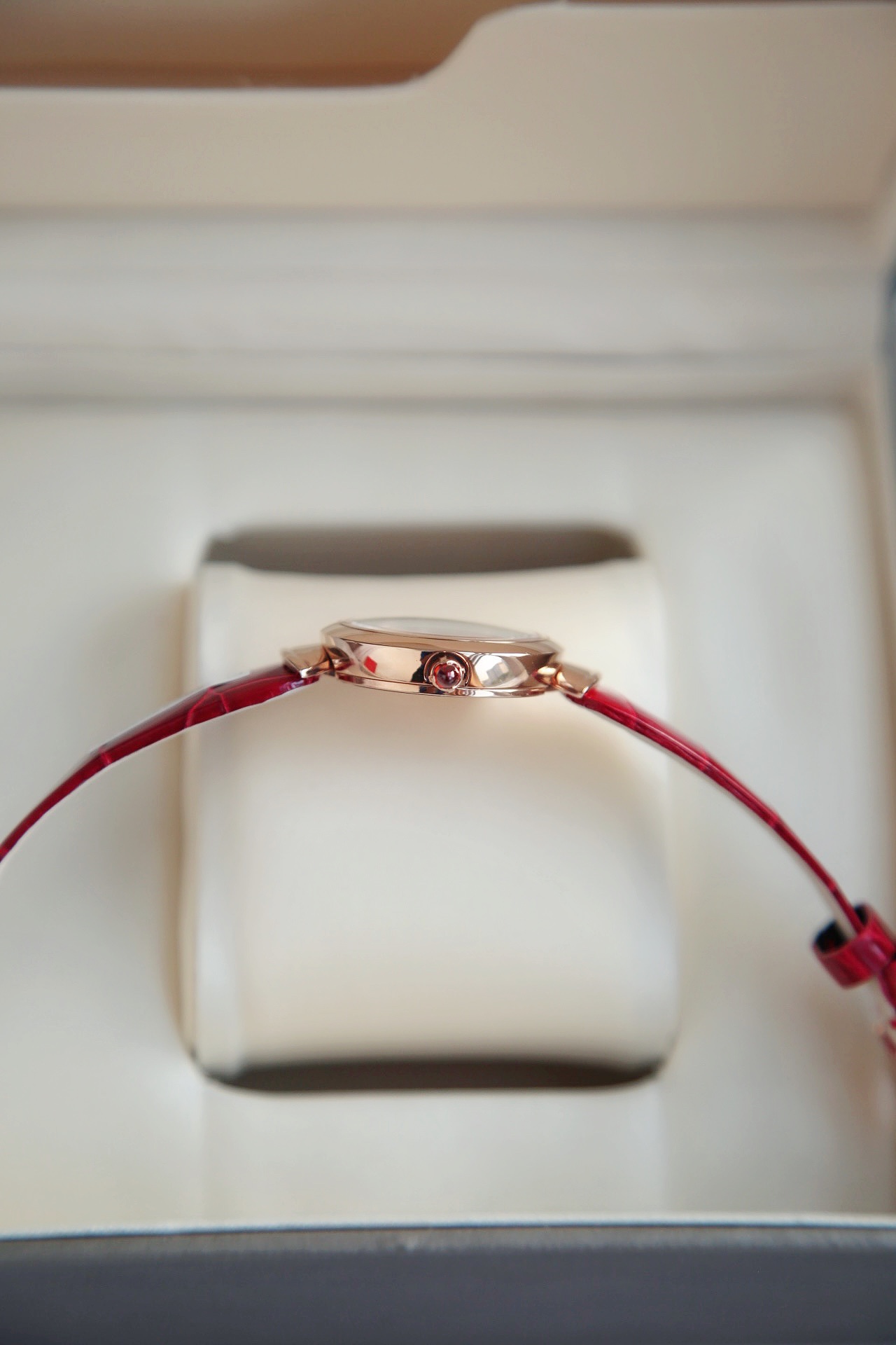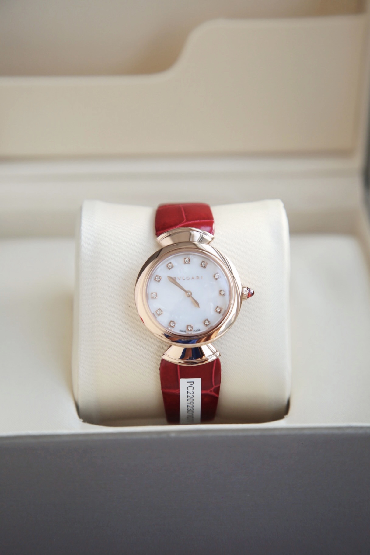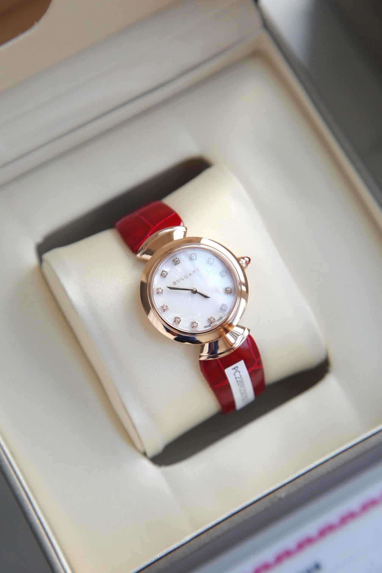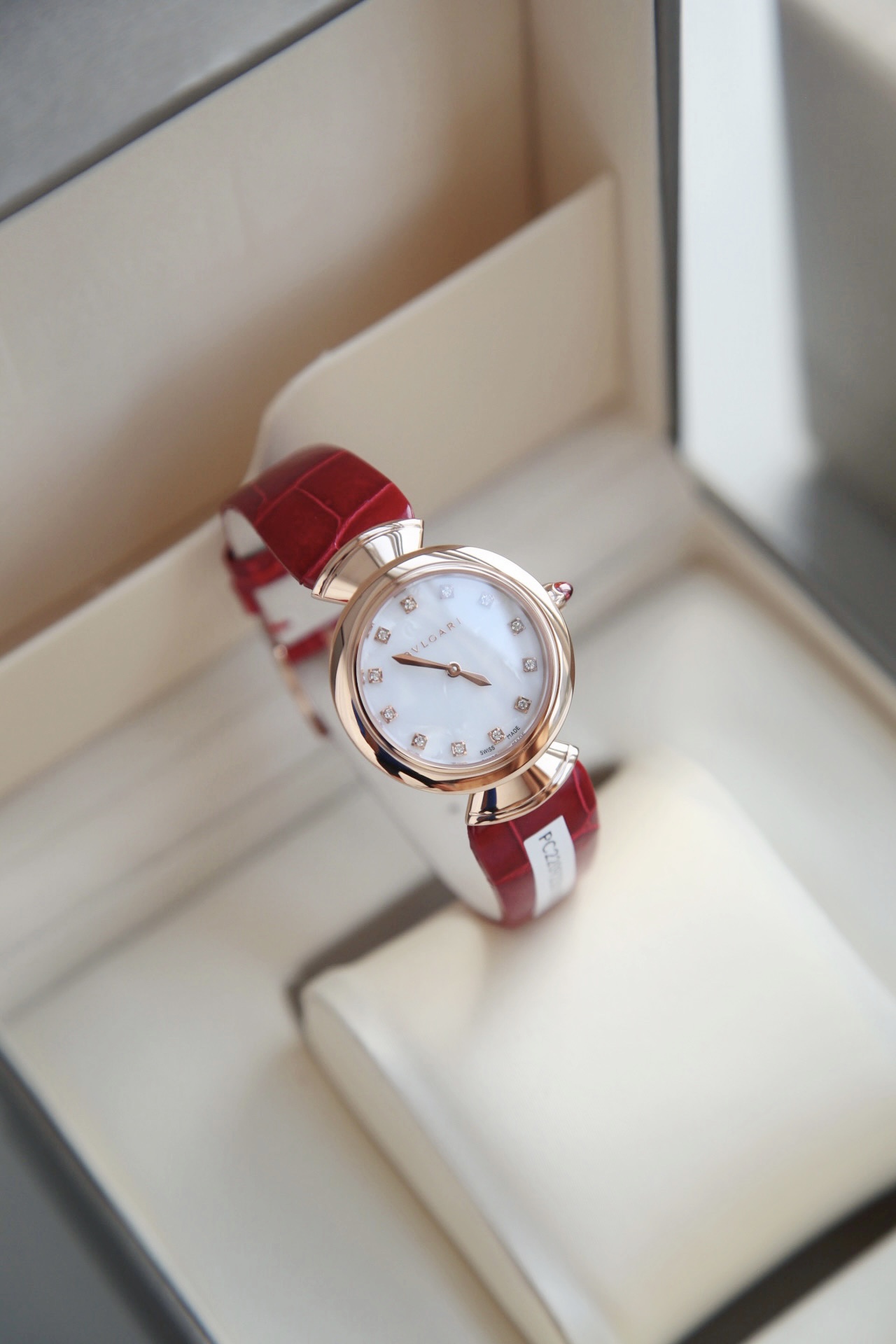 白色醋酸纤维表盘,配以钻石时标。这款珠宝腕表极具女性气质、精美雅致,呈现卡拉卡拉大浴场大理石的色彩和扇形马赛克的迷人曲线,体现意大利美学的真正精髓。 石英机芯。30毫米18K玫瑰金表壳。18K玫瑰金表冠,镶嵌一颗蛋面形切割粉红碧玺。18K金链节。红色鳄鱼皮表带,搭配18K玫瑰金针扣