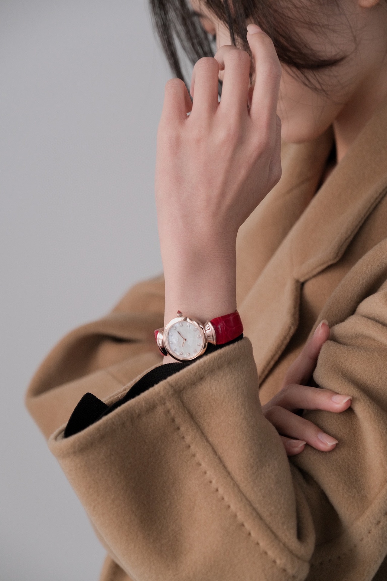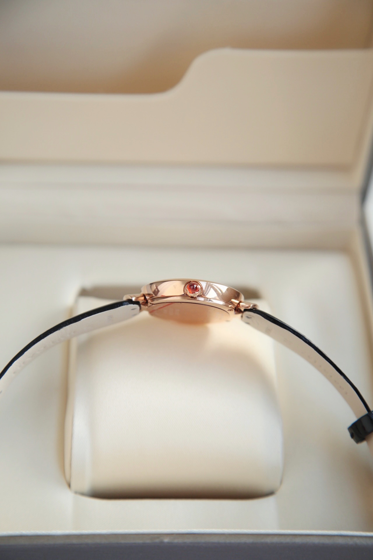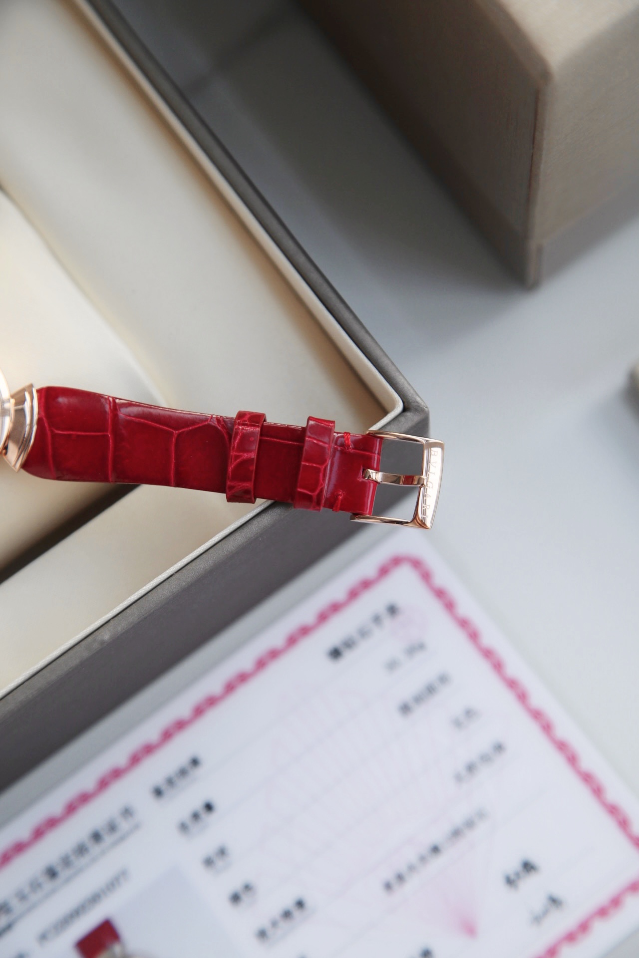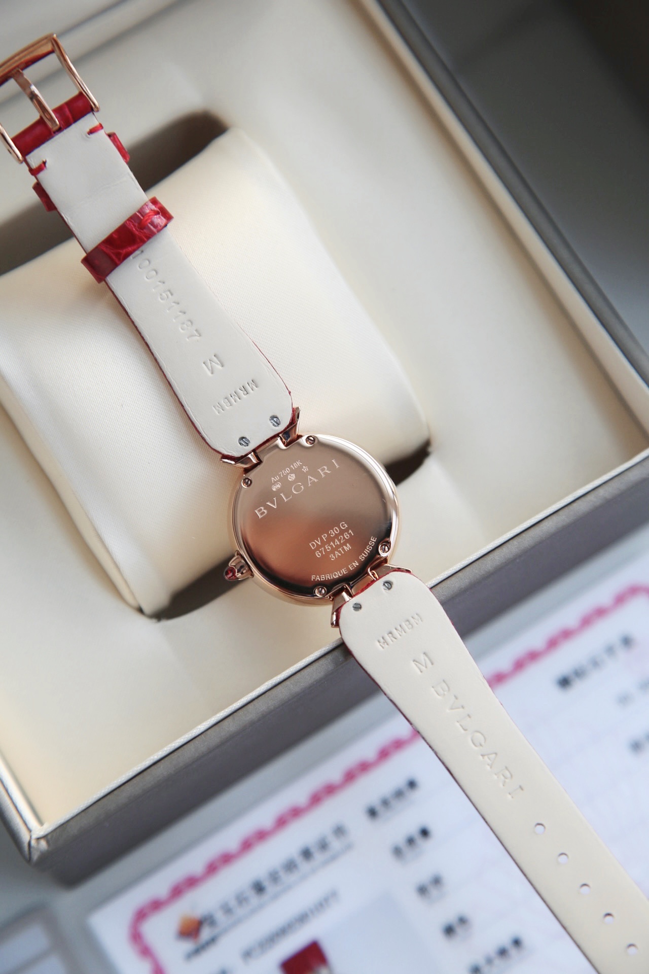 白色醋酸纤维表盘,配以钻石时标。这款珠宝腕表极具女性气质、精美雅致,呈现卡拉卡拉大浴场大理石的色彩和扇形马赛克的迷人曲线,体现意大利美学的真正精髓。 石英机芯。30毫米18K玫瑰金表壳。18K玫瑰金表冠,镶嵌一颗蛋面形切割粉红碧玺。18K金链节。红色鳄鱼皮表带,搭配18K玫瑰金针扣