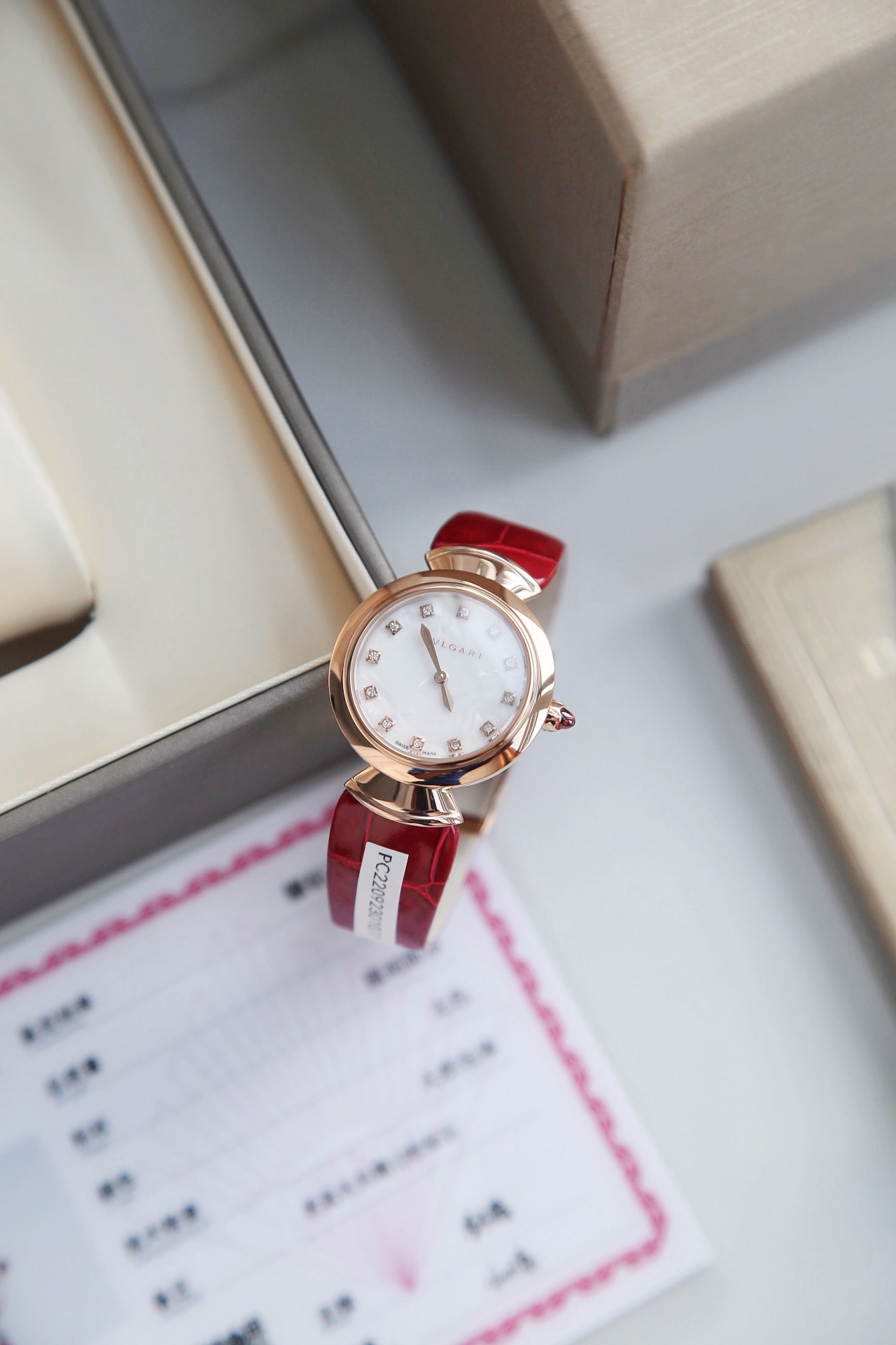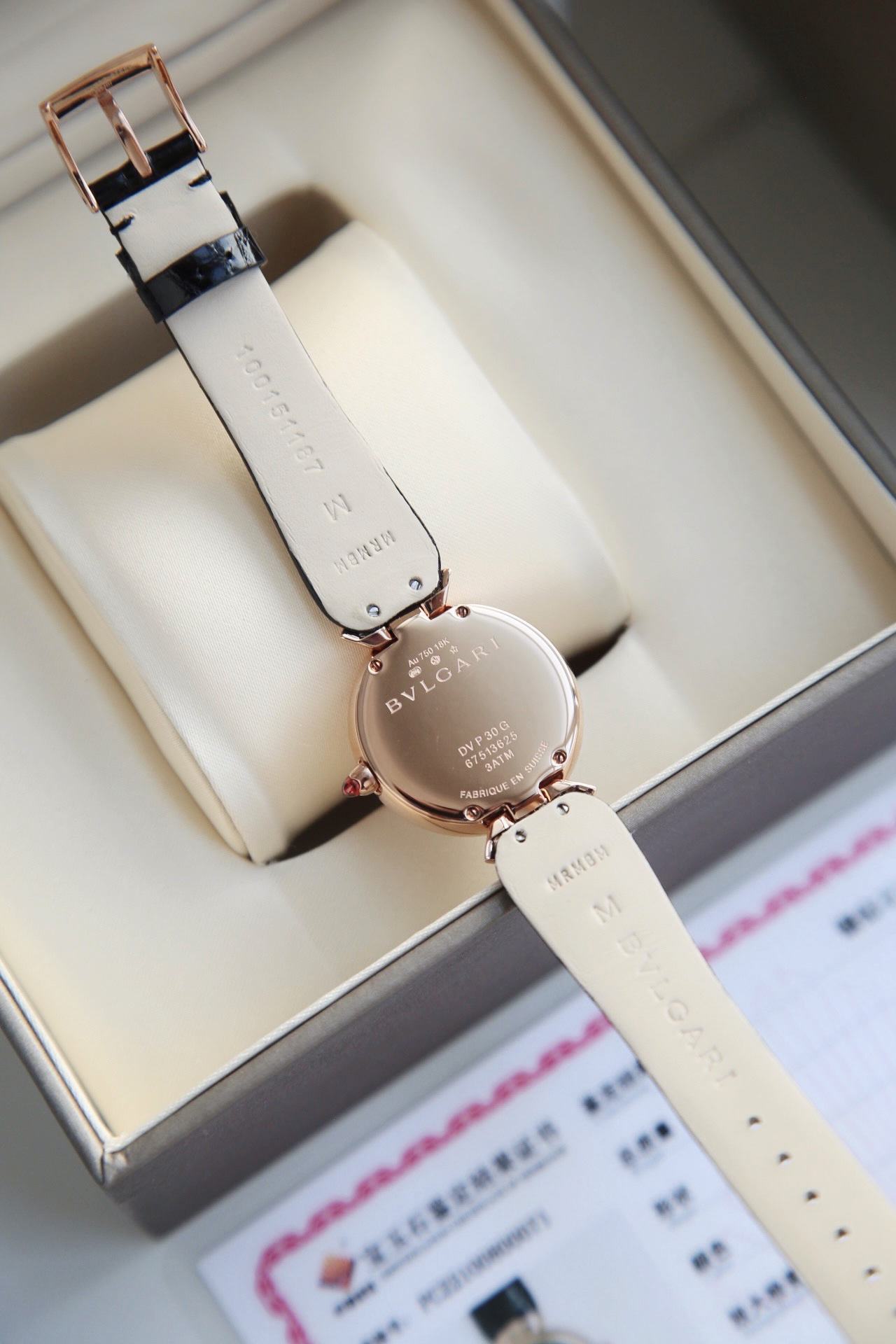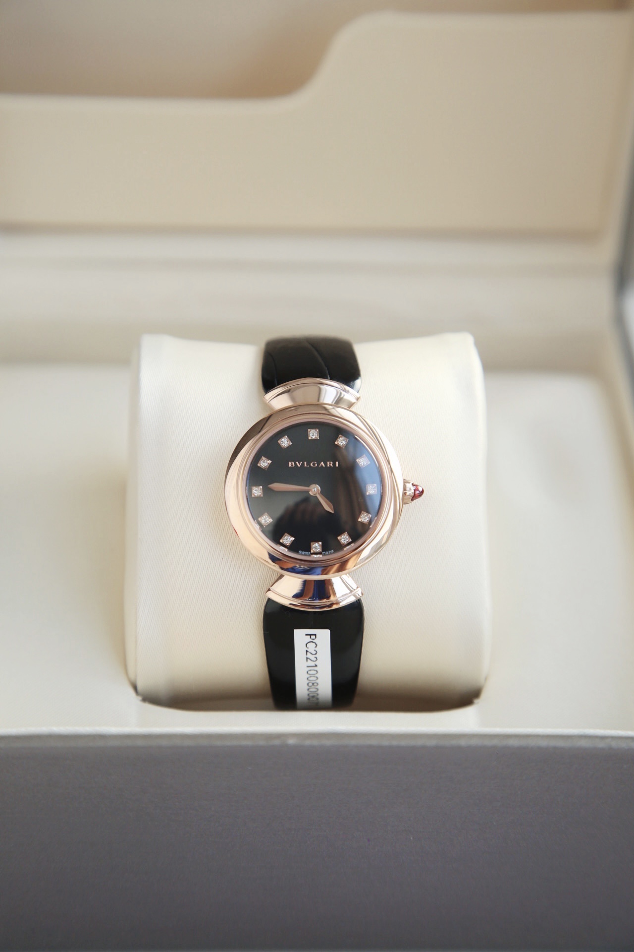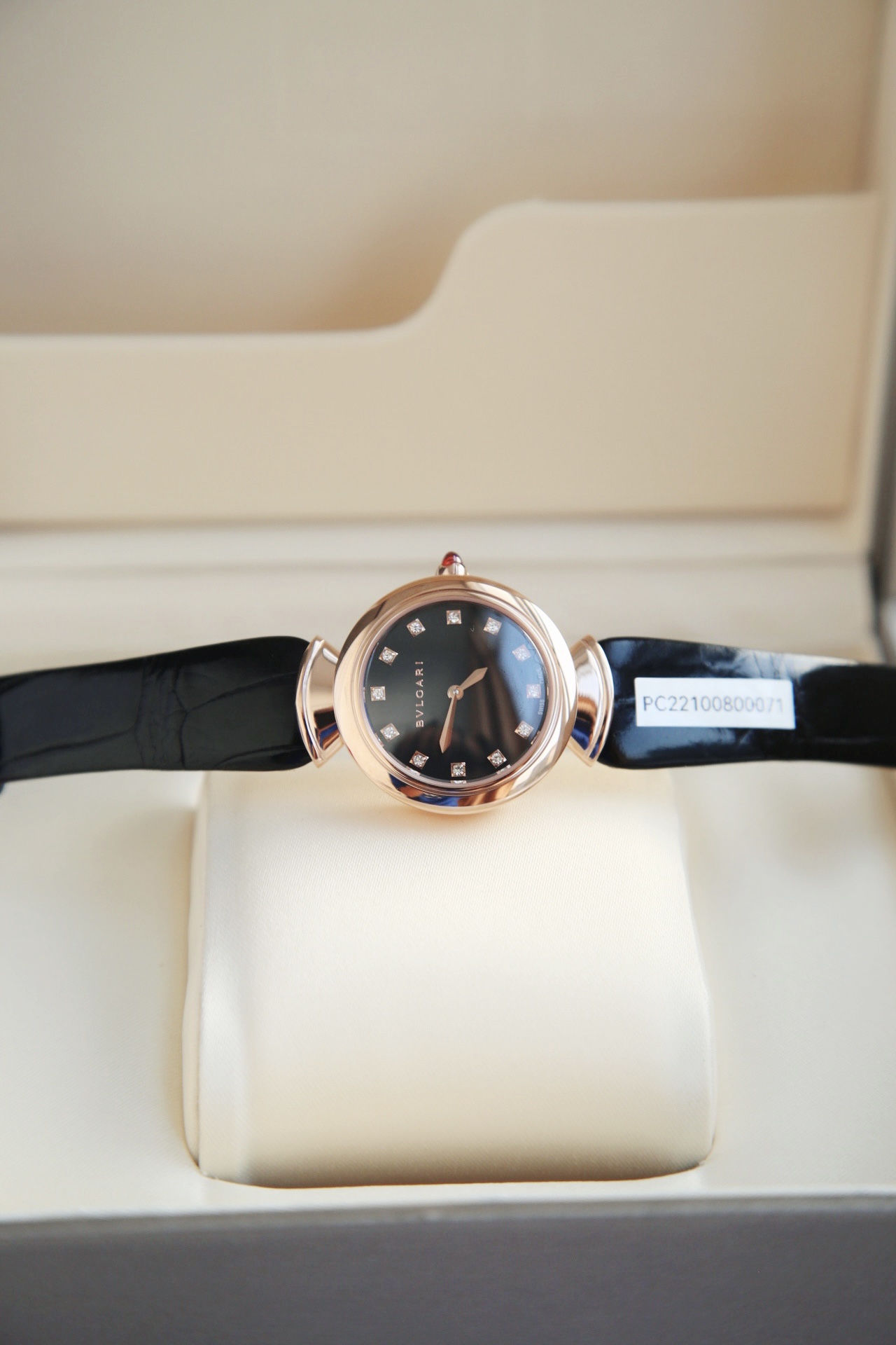 DIVAS’ DREAM腕表神秘的黑色表盘与经典别致的扇形图案相融合,DIVAS’ DREAM腕表从女性的优雅气质和永恒之城的迷人气息中汲取灵感,以独树一帜的罗马精神向最迷人的女性致敬,这款珠宝腕表极具女性气质,精美雅致,呈现卡拉卡拉大浴场大理石的色彩和扇形马赛克迷人曲线,体现意大利美学的真正精髓,凭借此系列腕表成为了意大利上层社会优雅女士的身份标识之一。表径搭配色彩鲜艳的鳄鱼皮表带,令人联想到宝格丽著名的彩色宝石设计。表壳也以精钢包18K玫瑰金材质呈现,表盘不仅有多种色彩可选,并且其中还有稀少的天然石头表盘配真钻石展现宝格丽的珠宝品牌闪耀动人之姿。这款腕表以30毫米精钢表壳,经过品牌抛光打磨处理之后,完美的表壳弧度以及典雅而别致的扇形十分漂亮,然后再包上18K玫瑰金,质感随意可见,洁白的独一无二天然大理石表盘上镶嵌有12颗1.3Vvs级足反真钻时标,别具立体感和纹路感,与中央2针设计相呼应,令时间指示非常清晰简约,顶级奢华,灰常稀缺,成型鳄鱼皮表带,令佩戴更加的舒适,凸面蓝宝石玻璃,永不刮花,50米防水,配全套原包装,送礼自戴都非常合适! 手表 吊牌 保修卡三码合一 ,一表一码绝不重复,国检GTC证书一表一编号 可扫可查,保障真材实料