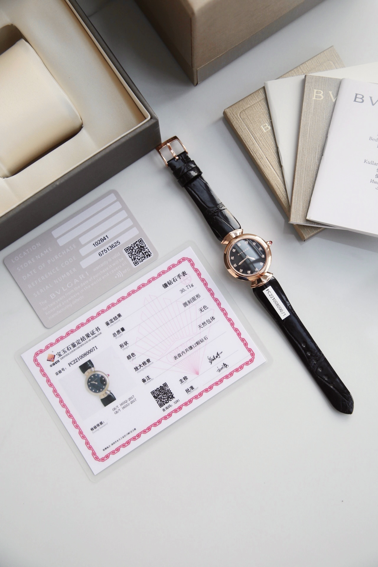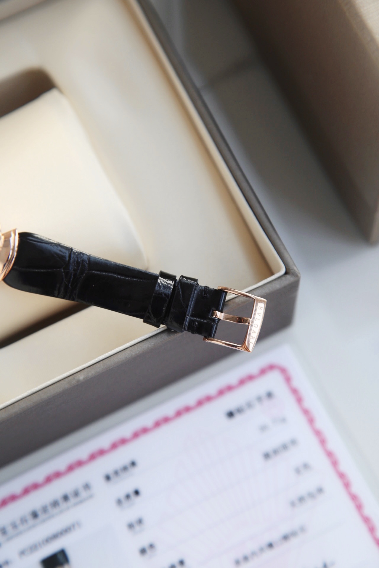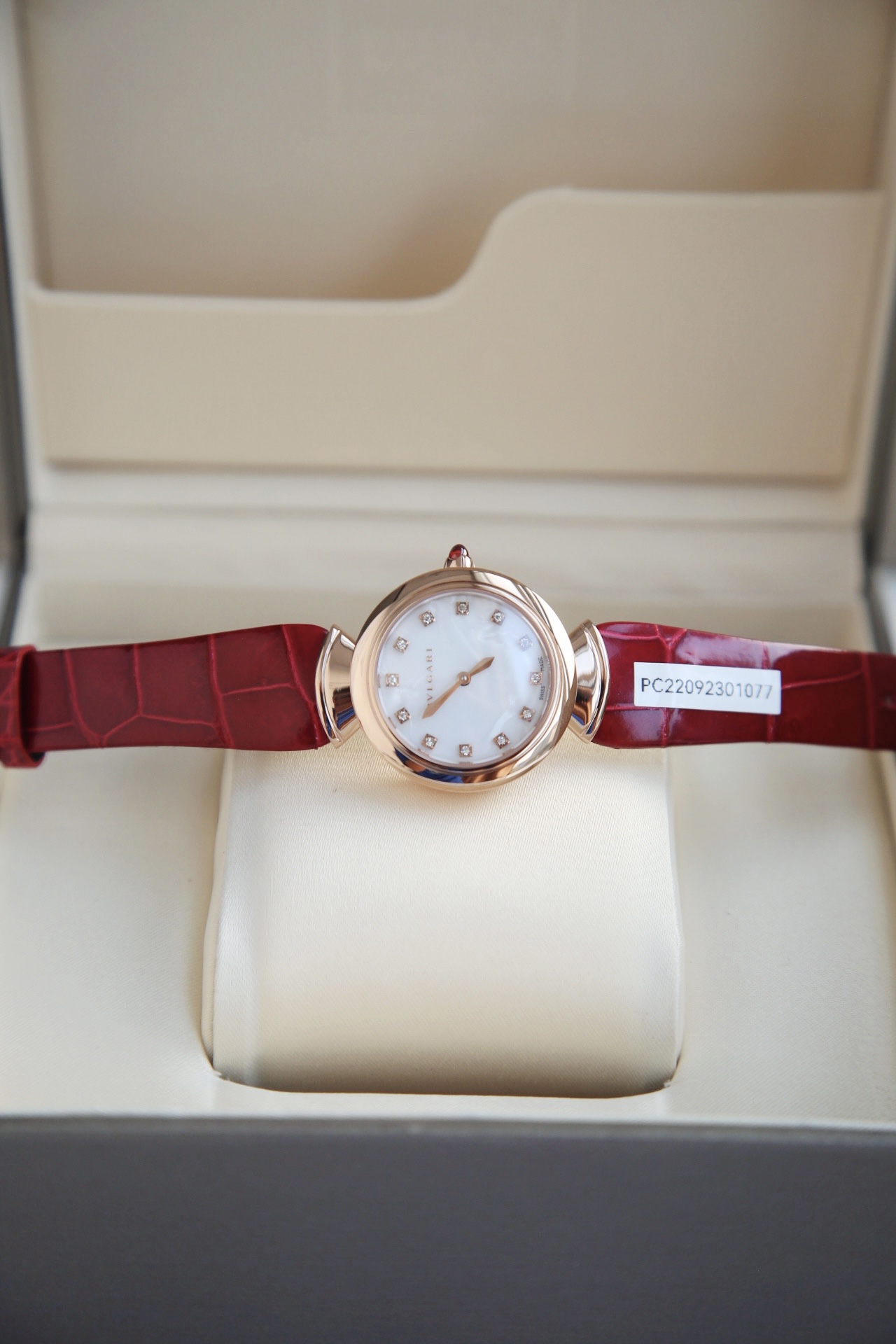 DIVAS’ DREAM腕表神秘的黑色表盘与经典别致的扇形图案相融合,DIVAS’ DREAM腕表从女性的优雅气质和永恒之城的迷人气息中汲取灵感,以独树一帜的罗马精神向最迷人的女性致敬,这款珠宝腕表极具女性气质,精美雅致,呈现卡拉卡拉大浴场大理石的色彩和扇形马赛克迷人曲线,体现意大利美学的真正精髓,凭借此系列腕表成为了意大利上层社会优雅女士的身份标识之一。表径搭配色彩鲜艳的鳄鱼皮表带,令人联想到宝格丽著名的彩色宝石设计。表壳也以精钢包18K玫瑰金材质呈现,表盘不仅有多种色彩可选,并且其中还有稀少的天然石头表盘配真钻石展现宝格丽的珠宝品牌闪耀动人之姿。这款腕表以30毫米精钢表壳,经过品牌抛光打磨处理之后,完美的表壳弧度以及典雅而别致的扇形十分漂亮,然后再包上18K玫瑰金,质感随意可见,洁白的独一无二天然大理石表盘上镶嵌有12颗1.3Vvs级足反真钻时标,别具立体感和纹路感,与中央2针设计相呼应,令时间指示非常清晰简约,顶级奢华,灰常稀缺,成型鳄鱼皮表带,令佩戴更加的舒适,凸面蓝宝石玻璃,永不刮花,50米防水,配全套原包装,送礼自戴都非常合适! 手表 吊牌 保修卡三码合一 ,一表一码绝不重复,国检GTC证书一表一编号 可扫可查,保障真材实料
