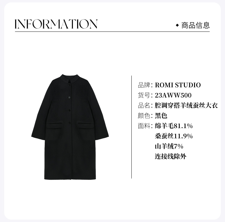 ROMI STUDIO”腔调穿搭“羊绒蚕丝混纺立领单排扣大衣外套 23AWW500