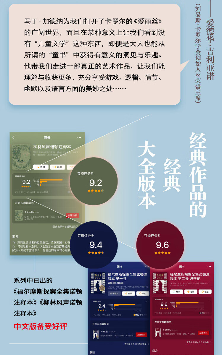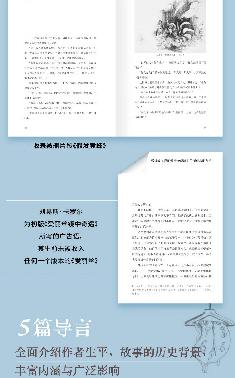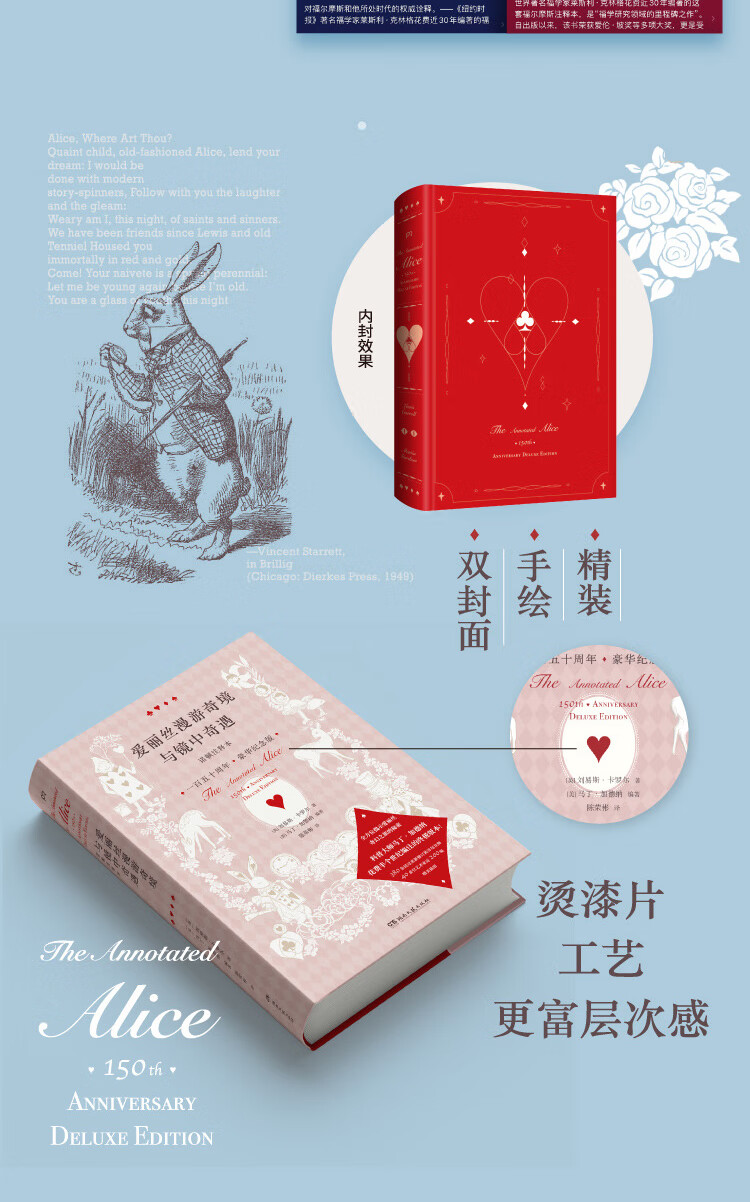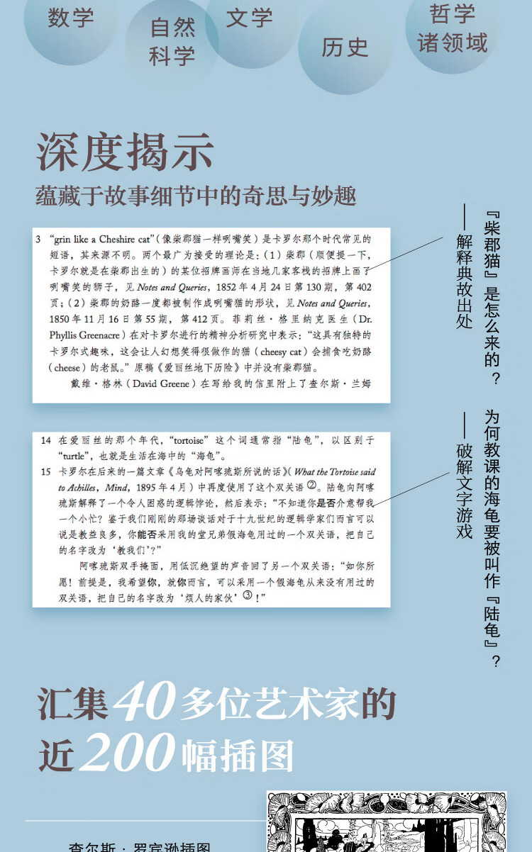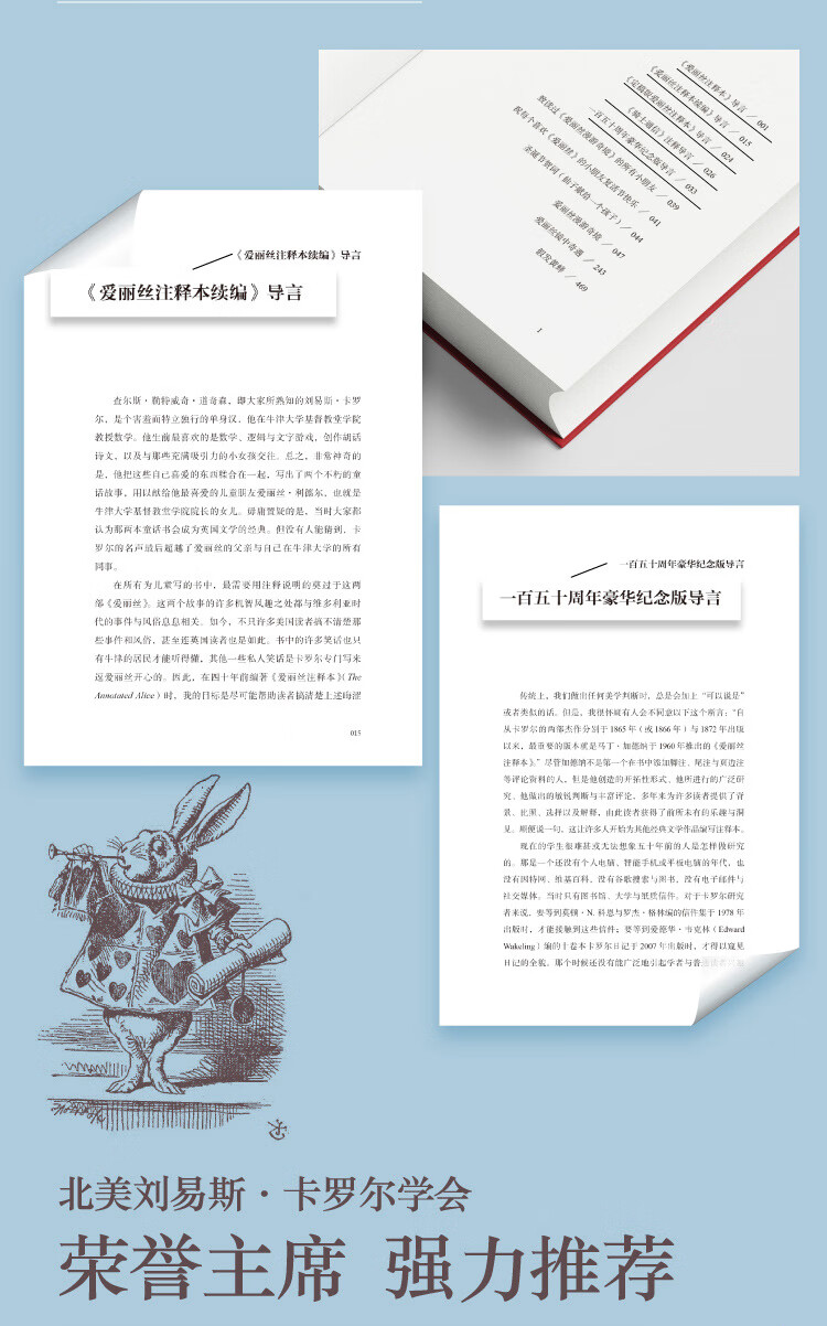 《爱丽丝漫游奇境》与《镜中奇遇》是英国著名作家、逻辑学家与数学家刘易斯•卡罗尔创作的儿童文学经典,亦被认为是维多利亚时代胡话文学的典范之作。卡罗尔以丰富的想象力和孩子般的纯真之心,结合逻辑学家与数学家的奇思妙想,书写了爱丽丝的两段奇遇。先是掉入兔子洞,再是进入镜中屋,爱丽丝经历了无数神奇的变化,与柴郡猫、疯帽匠、白骑士这样的古怪角色相遇,在种种离奇的对话与游戏中流露出尖新的童趣与深刻的哲理。马丁•加德纳五十多年来持续研究《爱丽丝漫游奇境》与《爱丽丝镜中奇遇》,分别于1960年、1990年与1999年出版三部《爱丽丝注释本》,其中包含大量内容详尽的注释与相关研究材料,为当代读者释疑解惑,被公认为卡罗尔研究的经典之作。本书即融合了这三本书的内容,由北美卡罗尔学会主席马克•伯斯坦加以更新完善的一百五十周年豪华纪念版。本书完整收录了两部爱丽丝故事以及被删去的片段《假发黄蜂》。五篇导言与数百条经过修订与更新的注释跨越逻辑、数学、哲学、历史、文学等领域,通过集释与漫谈的方式深度揭示蕴藏于故事细节中的奇思与妙趣。同时,广泛收集全世界的艺术家为爱丽丝故事创作的上百张精美插画,增补包括影视改编清单、插画家简介在内的多种研究材料。就如马丁•加德纳所言,“我的任务并不是要进行原创性的研究,而是要尽可能地从既有的文献中取材,撰写注释,让当代的读者更能享受阅读《爱丽丝》的乐趣”。