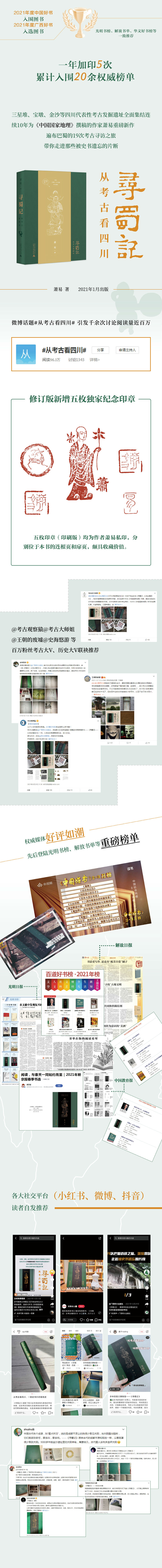 青年学者萧易新作《寻蜀记》,巧妙精选了19处四川著名考古和文化遗址,通过发掘材料的爬梳、比对文献史料,并亲临现场探访,钩沉出了四川从新石器时代、古蜀方国延绵到明清的隐藏的精彩瞬间,由微见著,将四川历史序列清晰地勾画出来。其深厚的文史功底、娓娓道来的灵动笔法,配以遗址发掘现场和出土文物的珍贵图片,将枯燥坚硬的考古材料润化开来,带给读者的不仅是文史干货条陈缕析的悠长滋味,更有古代生活场景栩栩如生的再现。