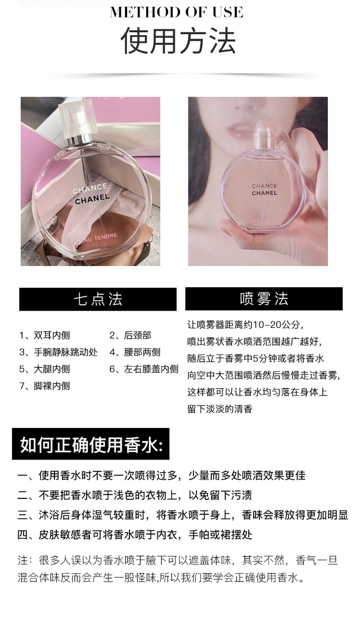 1.香水的香味较浓时,应该使用在冬天,盛装或宴会上。2.香水的香味较淡时,应该使用在夏天或白天上班时使用。3.喷香水时,喷口应于身体保持约30公分的距离,这样才可使香水香味均匀分布,而不会集中在某一处。4.香水应避免直接喷洒在白色的衣服上,因为多半数的香水都含有色素,直接喷洒在白色衣服上使衣服上有香水残留的色素而影响到衣服的美观。5.在此建议您使用「香水覆盖法」,使香味更持久,例如,先使用同香水系列的沐浴乳来洗澡,然后再接着以香水乳液滋润肌肤,到要外出时,再选用同系列香水喷洒。6.擦香水时,须注意不要直接对着肌肤喷洒,尤其是会直接暴晒的部位,如脸部,脖子,等等。